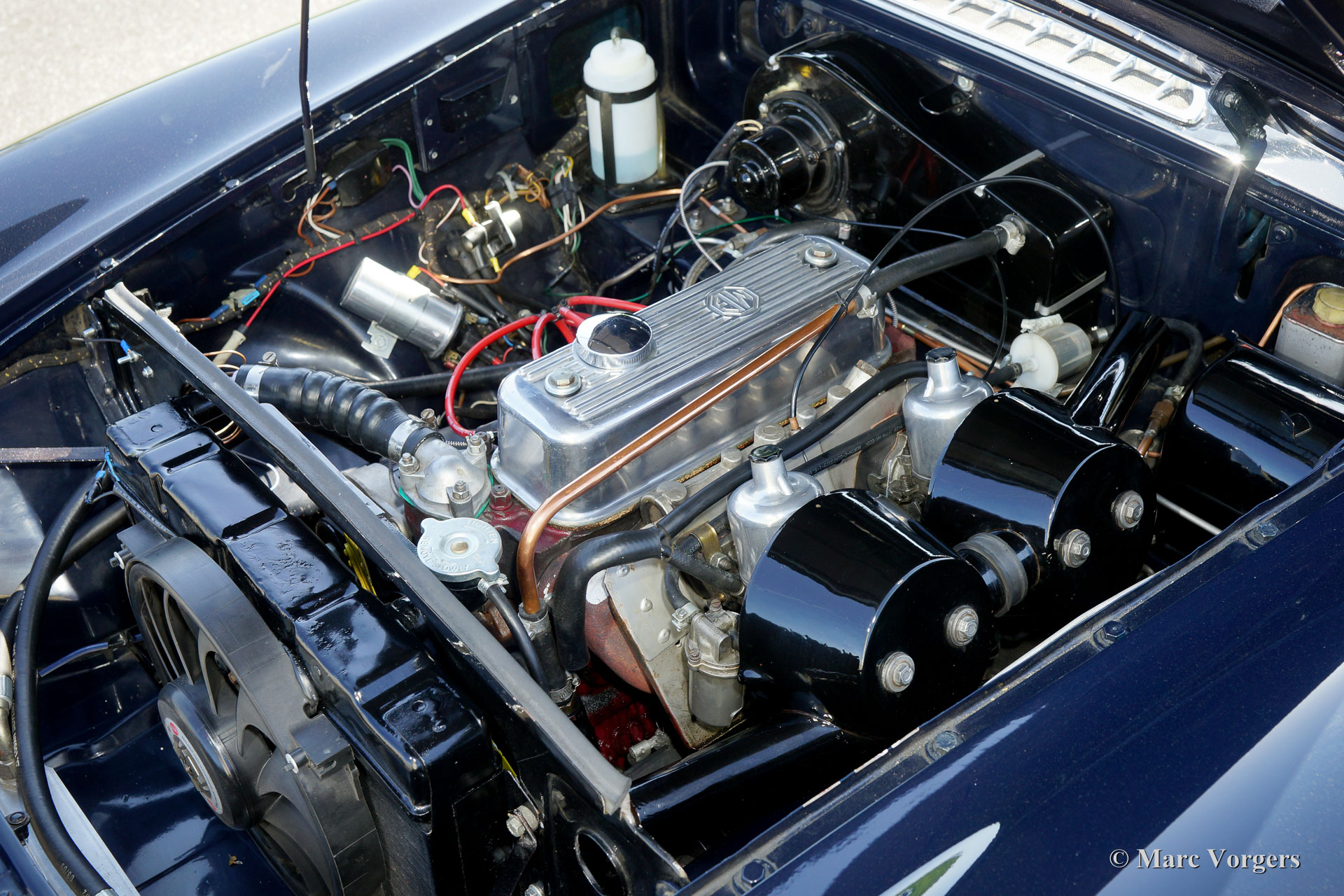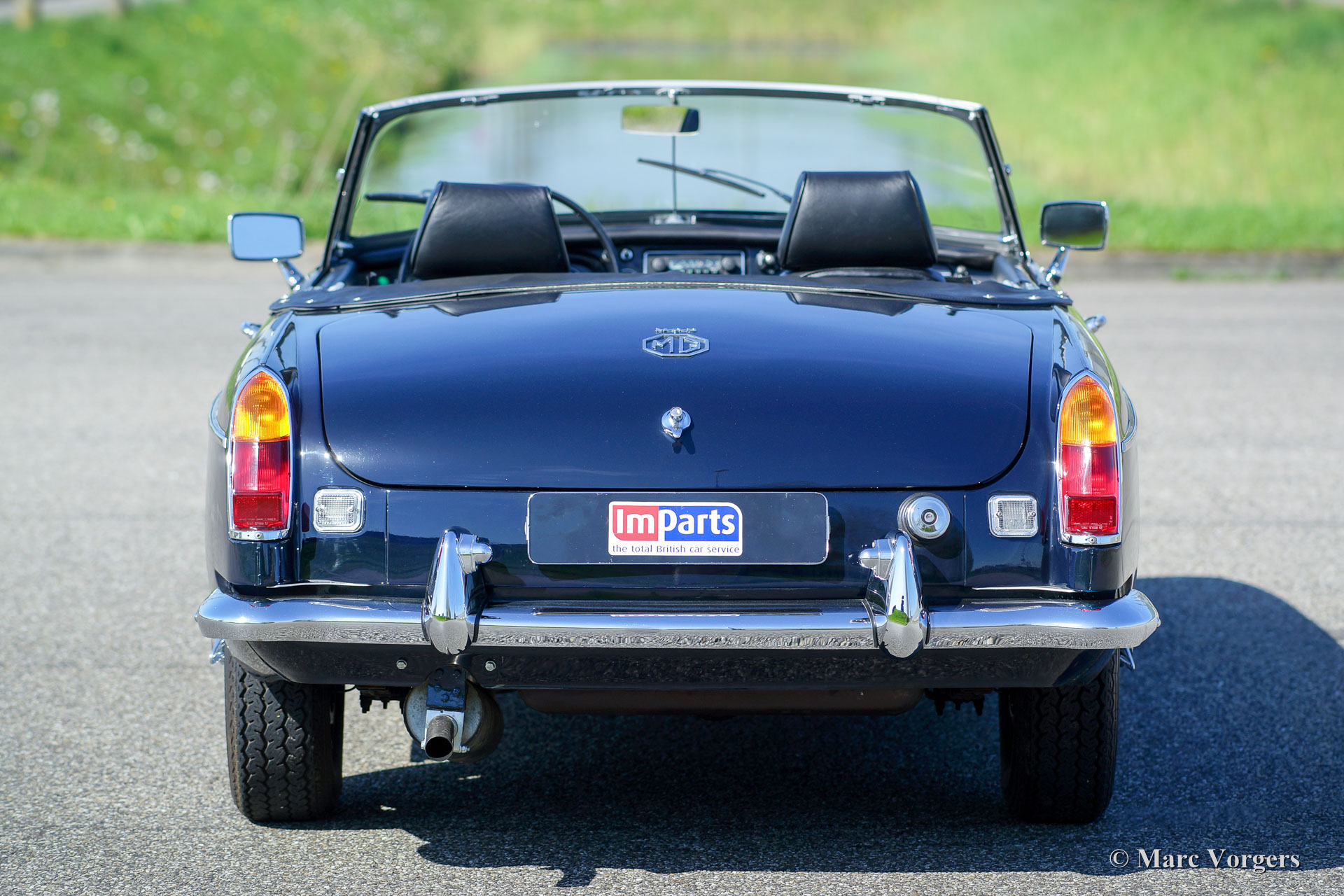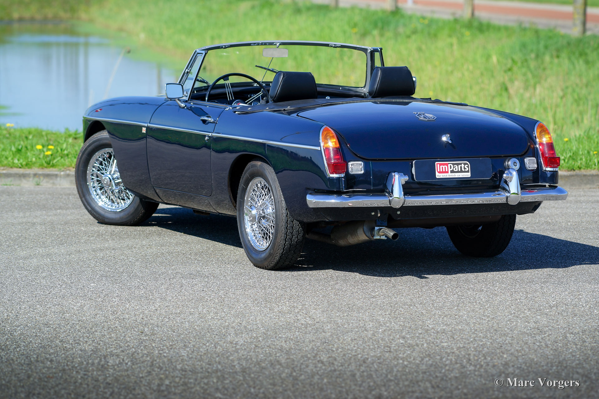 MG MGB roadster, jaar 1968. Kleur donkerblauw met een zwartleren interieur, zwart tapijt en een zwarte soft-top. Deze MGB roadster werd gebouwd in het jaar 1966 en de auto werd voor het eerst geregistreerd in 1968. Deze beeldschone MGB werd enkele jaren geleden uitgebreid gerestaureerd; de auto verkeert in sublieme staat! Deze vroege MGB-modellen zijn uitgerust met een zgn. ‘pack-away’-soft-top die volledig in de kofferbak wordt opgeborgen. De auto is voorzien van prachtige verchroomde spaakwielen, speciale comfort-stoelen met een hogere rug- en hoofdsteunen, elektronische ontsteking, een elektrische koelventilator en een klassieke radio met verborgen telescoop-antenne onder het dashboard! Dit vroege MGB-model heeft het metalen dashboard en deze auto pronkt met het prachtige originele stuur! Een subliem exemplaar!