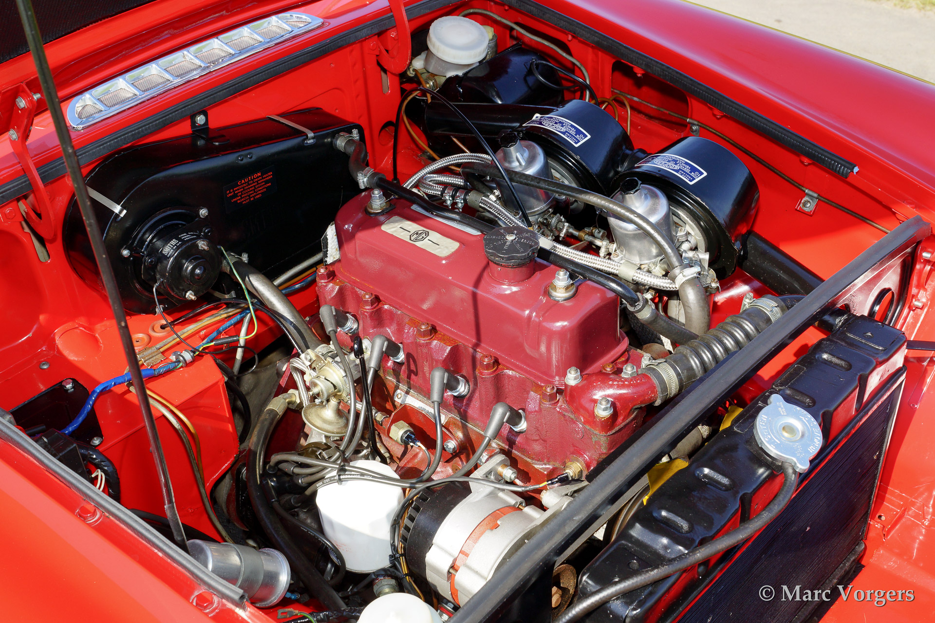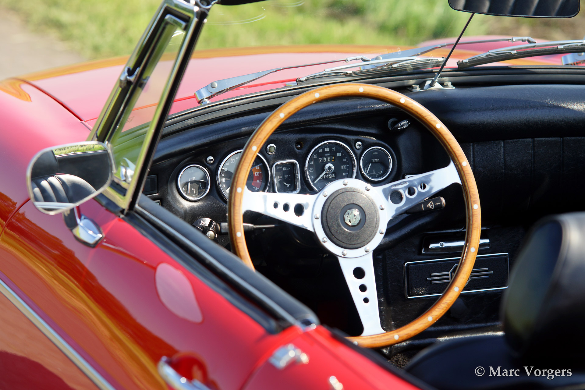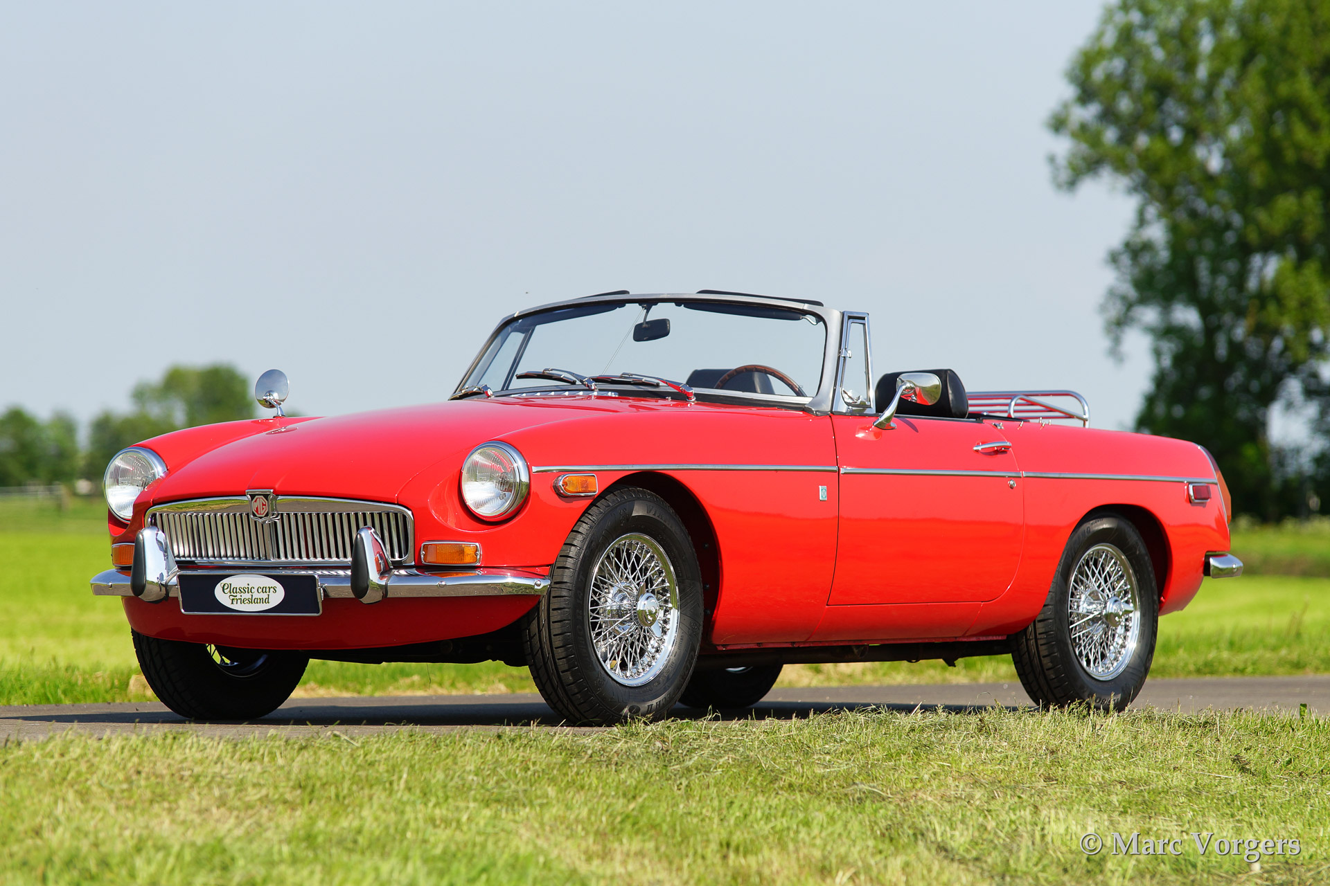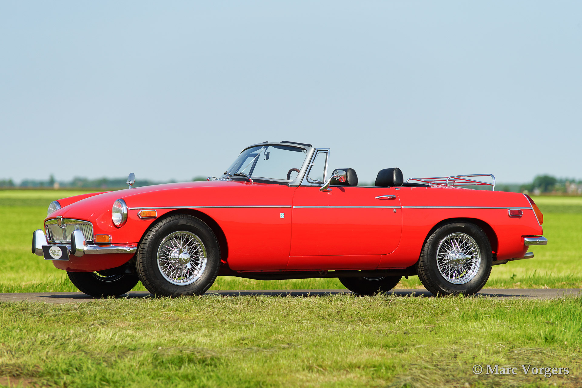 MG MGB roadster, bouwjaar 1970. Kleur rood met een zwart lederen interieur. Deze prachtige MGB werd uitvoerig gerestaureerd naar concoursstaat. De originele Amerikaanse 'side lights' zijn behouden gebleven (bij veel restauraties worden deze namelijk verwijderd.) Deze MG MGB is voorzien van chroom spaakwielen en een chroom kofferrek.