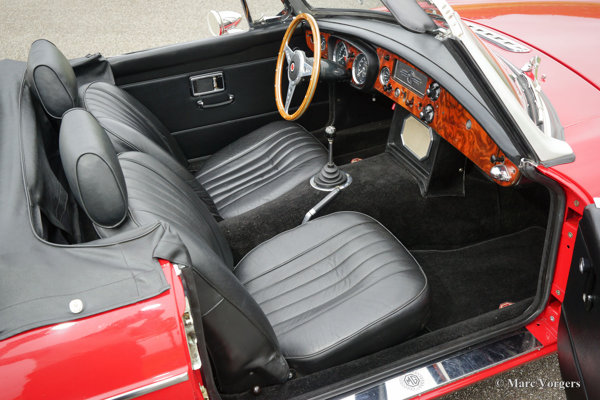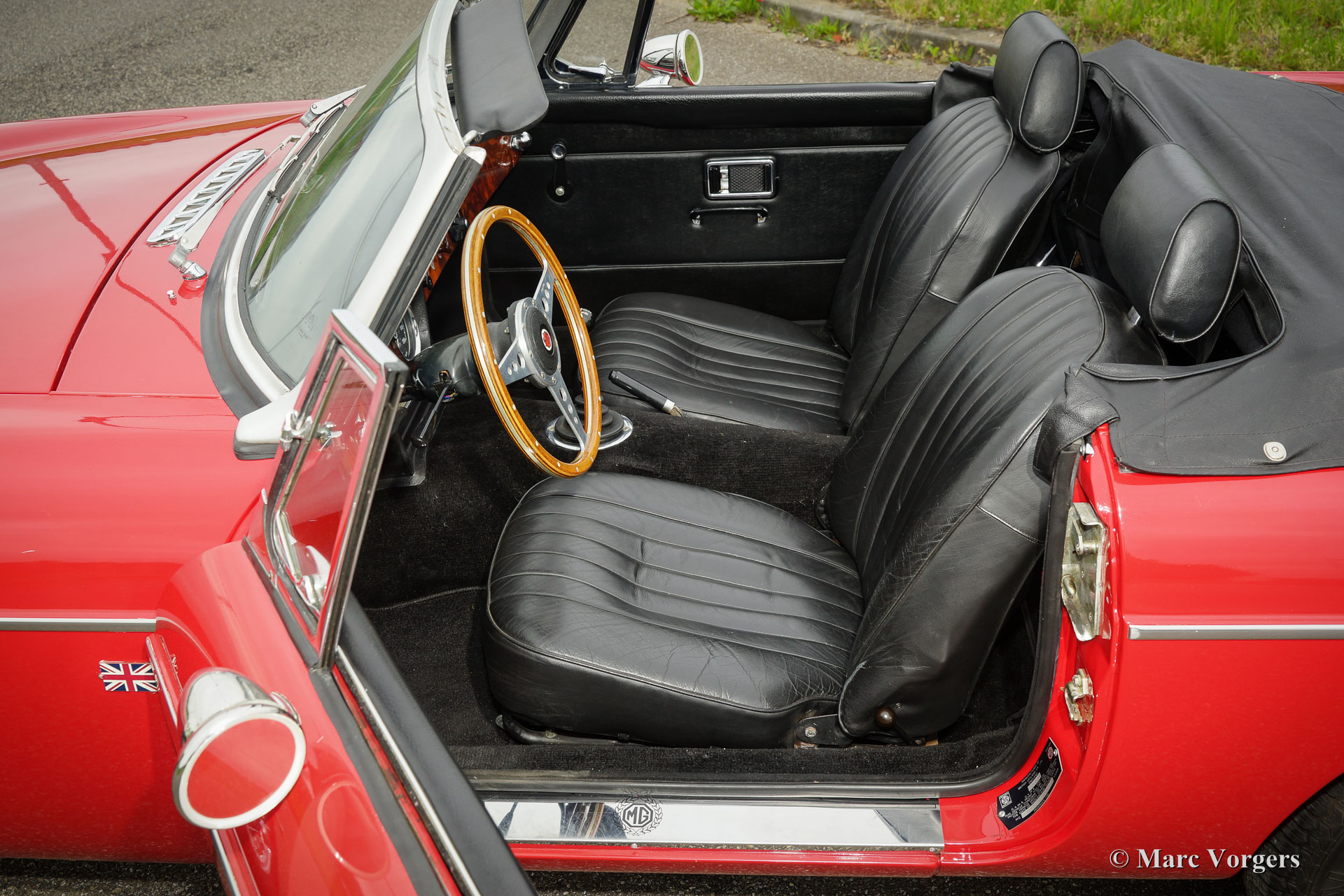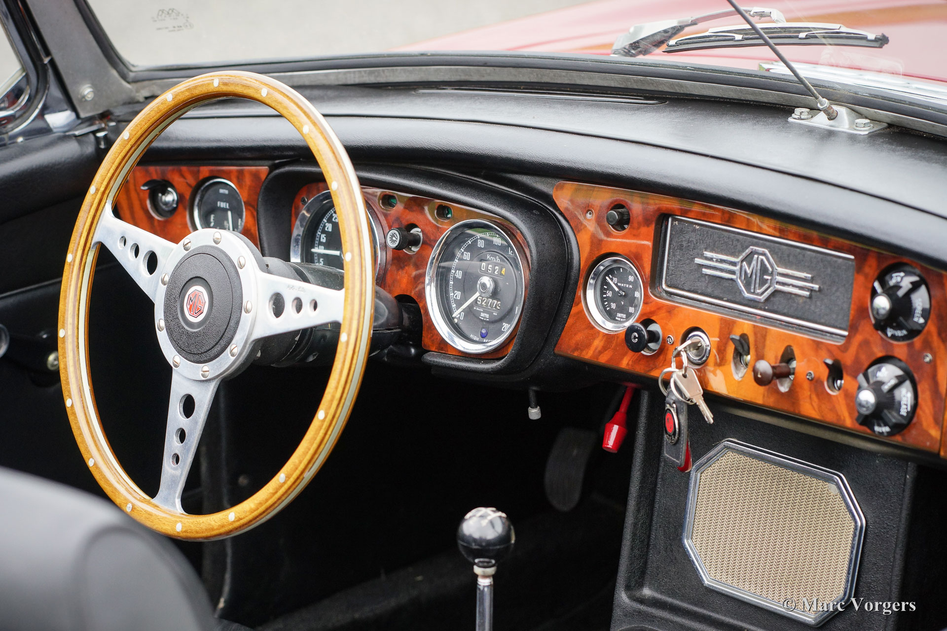 MG MGB roadster, jaar 1970. Kleur ‘flame red’ met een zwart leren interieur en zwart tapijt. Zwarte vinyl soft-top en kapafdekking. Deze prachtige MGB roadster werd een aantal jaren geleden gestript, opnieuw gespoten en met veel nieuwe onderdelen weer opgebouwd. Deze MGB verkeert in excellente staat en de auto rijdt sportief doch comfortabel. De auto is voorzien van chroom spaakwielen, overdrive, oliekoeler, Moto-Lita sportstuur met houten rand, een rvs-kofferrek, leren stoelen, wortelnotenhout-fineer dashboardpanelen en bekleding in de kofferbak. Een voortreffelijke Britse roadster om te genieten van heerlijke zomerse weekendtrips, vakanties, en om zomaar ’s avonds een blokje om te gaan of een terrasje aan te doen in een landelijke omgeving.