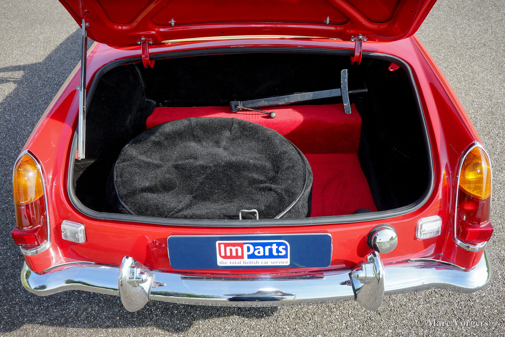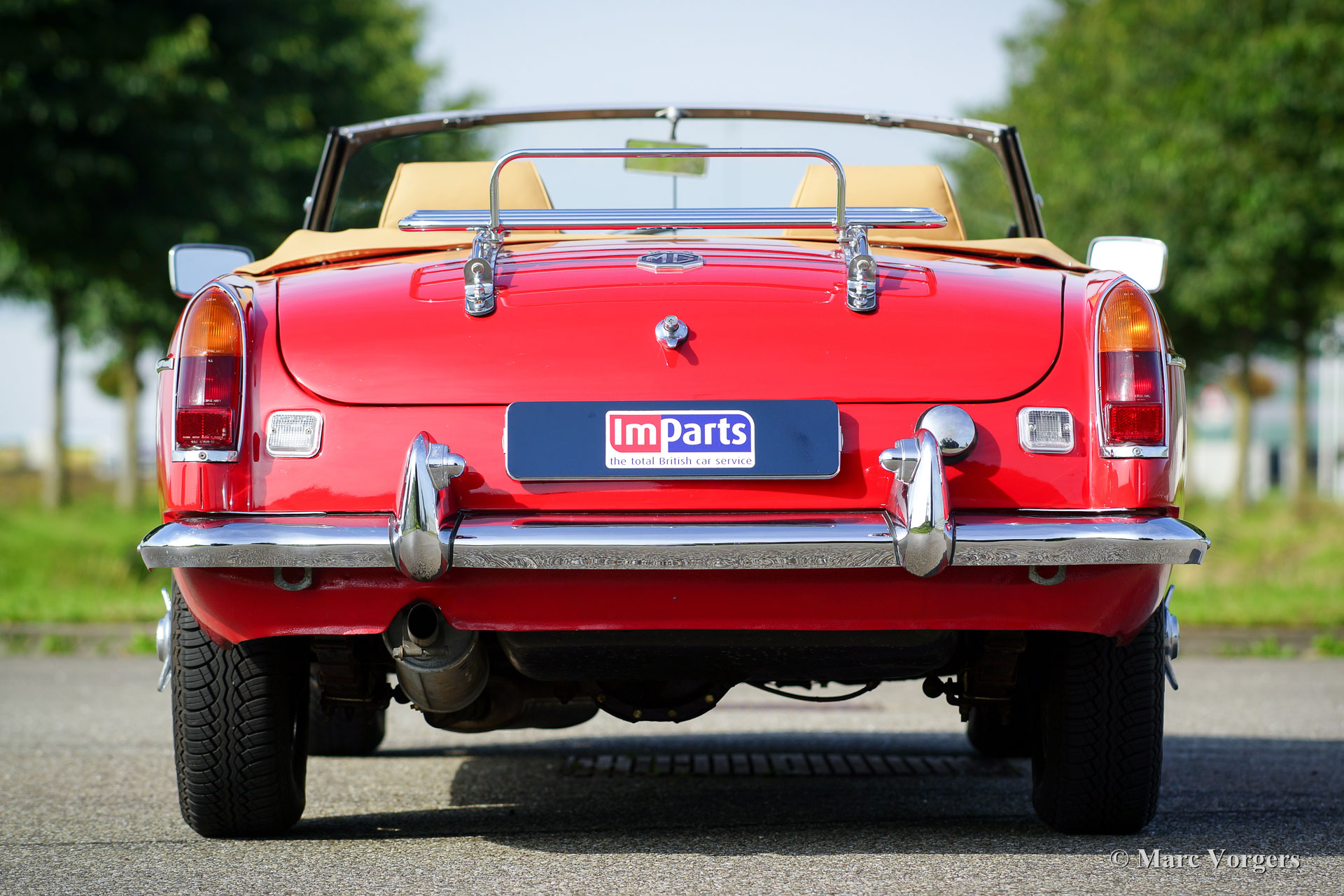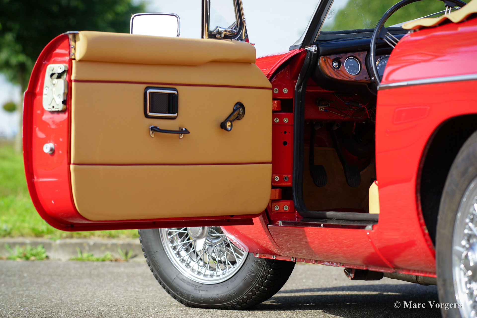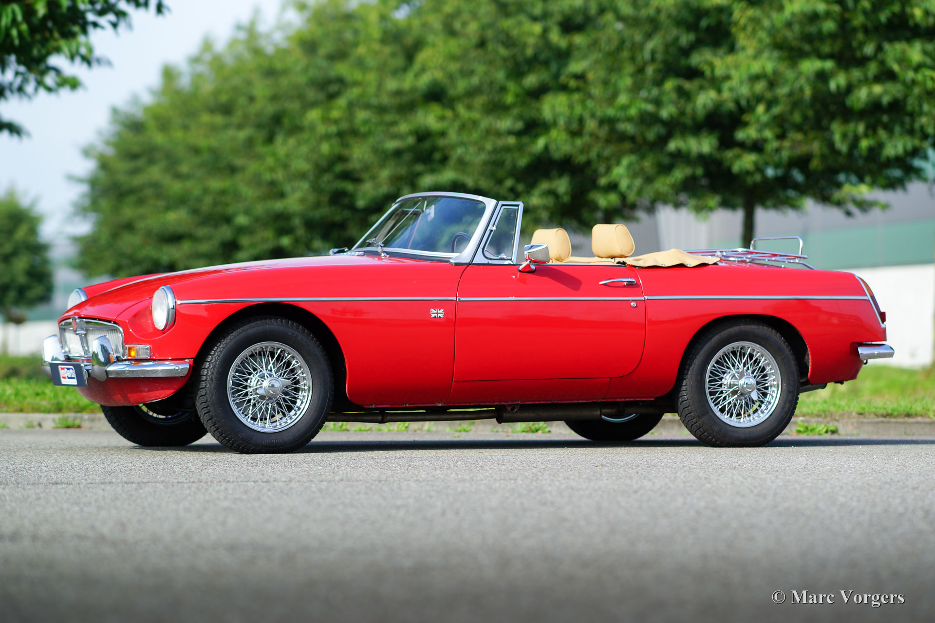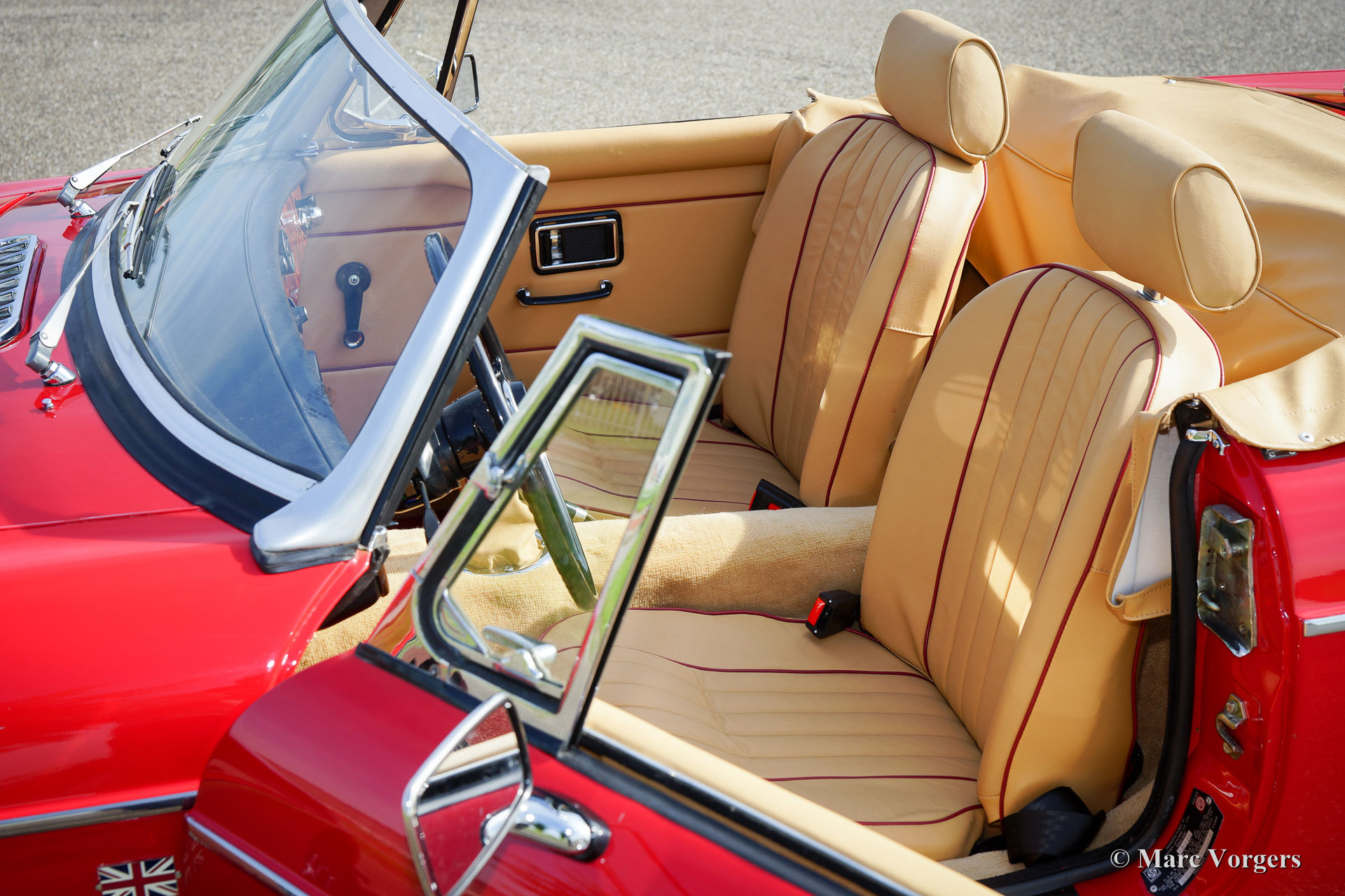 MG MGB roadster, jaar 1970. Kleur rood met een beigeleren interieur afgewerkt met donkerrode biezen. Beige tapijt, zwarte soft-top en hood-cover. Deze geweldige MGB roadster werd enige jaren geleden uitvoerig onderhanden genomen, de MG verkeert in sublieme staat en de auto rijdt perfect! Het betreft een originele Europese uitvoering. De motor is geschikt gemaakt voor rijden op loodvrije benzine. Deze MG is uitgerust met veel extra’s: overdrive, leren stoelen, luxe walnoothouten inleg op het dashboard, chroom spaakwielen, chroom kofferrek, elektrische ontsteking, elektrische koelventilator, oliekoeler, twee verchroomde buitenspiegels, een sportstuur met houten rand, radio met CD speler en een hoofdstroomschakelaar. Een prachtexemplaar!
