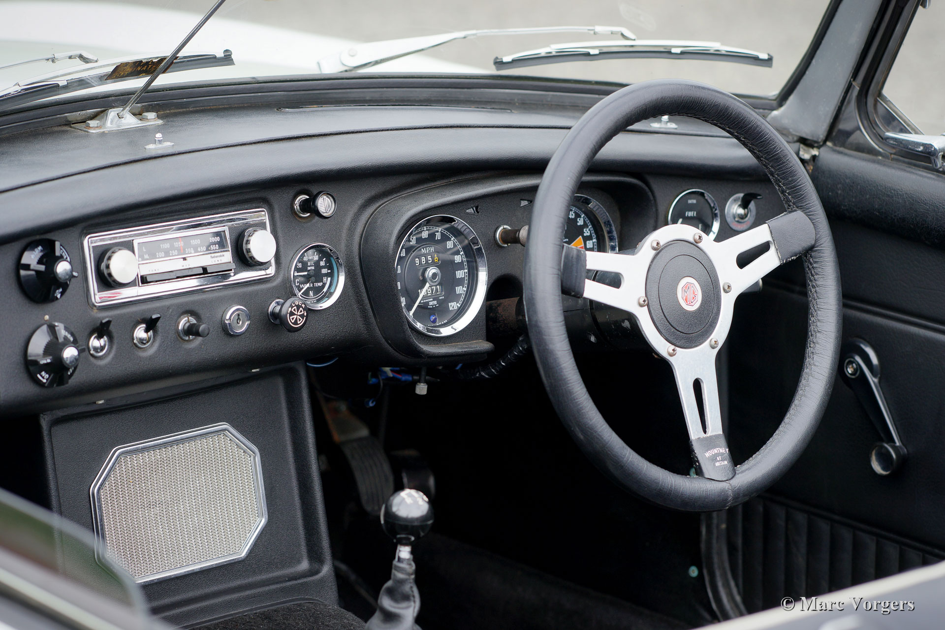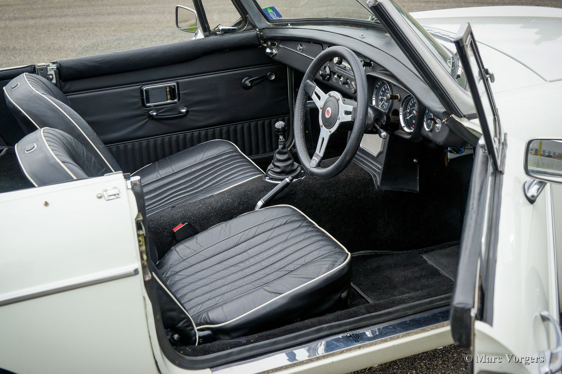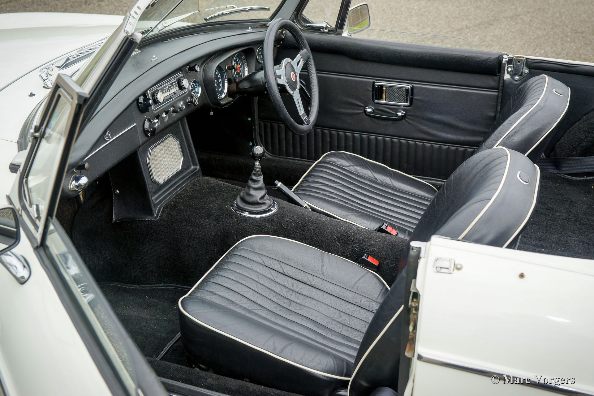 MG MGB roadster, jaar 1970. Kleur wit gecombineerd met een zwart lederen interieur, afgezet met witte "piping" en zwart tapijt. Zwarte “pack away” soft-top. Deze rechtsgestuurde (RHD) MGB roadster is in het verleden uitvoerig gerestaureerd in het Verenigd Koninkrijk. De restauratie was gebaseerd op een gloednieuwe carrosserie van British Motor Heritage. Als u deze MGB voor het eerst ziet, heeft u de indruk te kijken naar een perfect bewaard gebleven originele auto, dat is een goede zaak, want de auto vertoont alle originele details, lichte sporen van eerder gebruik en een prachtig patina. De auto verkeert in een zeer goede conditie en de auto rijdt en stuurt perfect! De MGB is voorzien van het begeerlijke vroege metalen dashboard, OVERDRIVE, extra oliekoeler, een aluminium kleppendeksel, chromen spaakwielen, een sportstuur met lederen rand en een periodecorrecte Radiomobile radio zonder FM. Tegen een meerprijs van € 2500 kunnen wij deze rechtsgestuurde MGB ombouwen naar linksgestuurd. Deze prachtige MGB roadster is klaar om van te genieten!