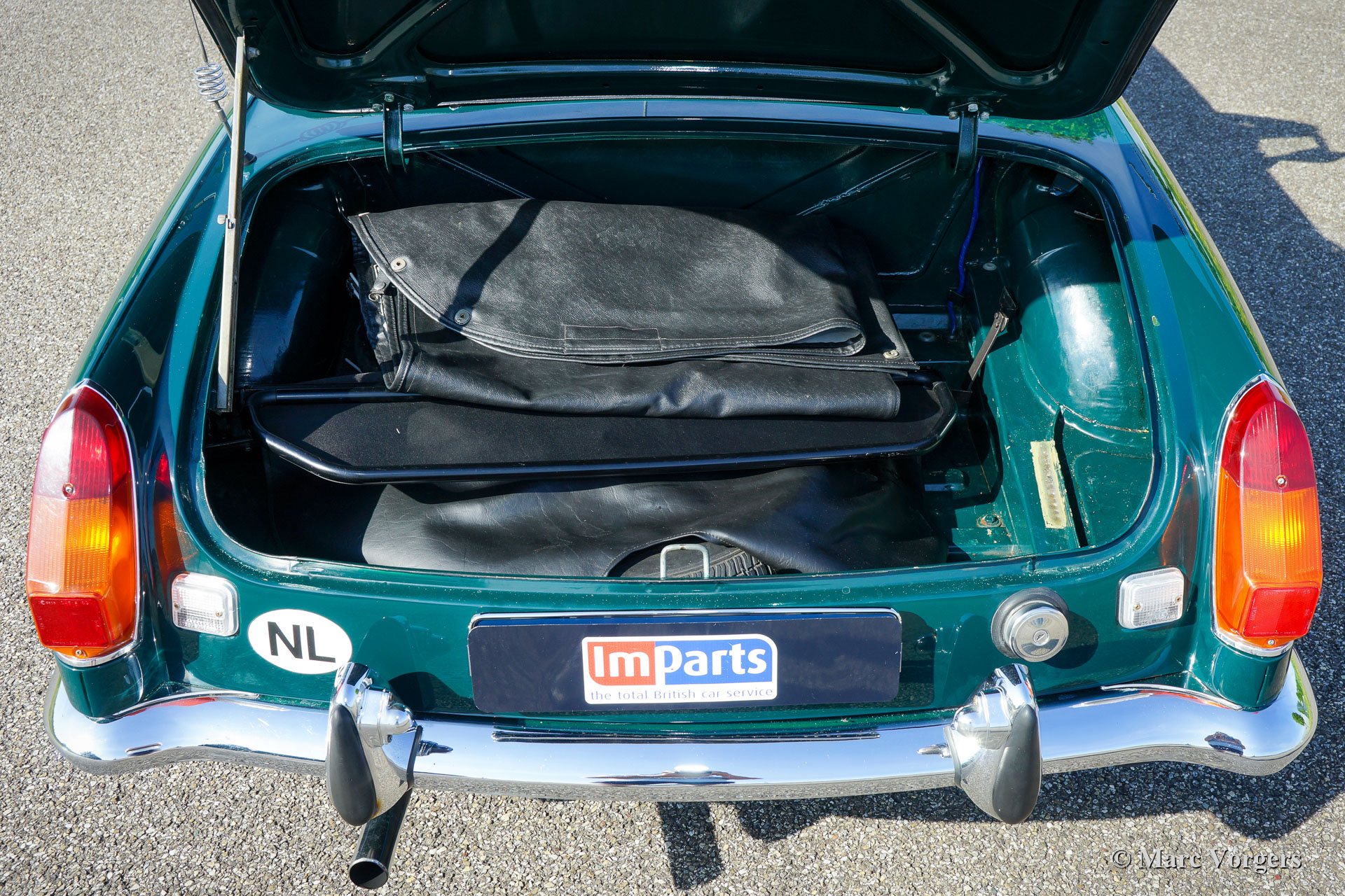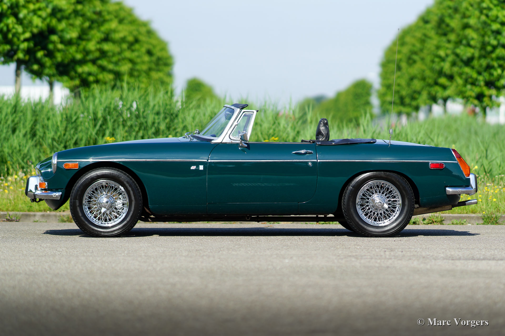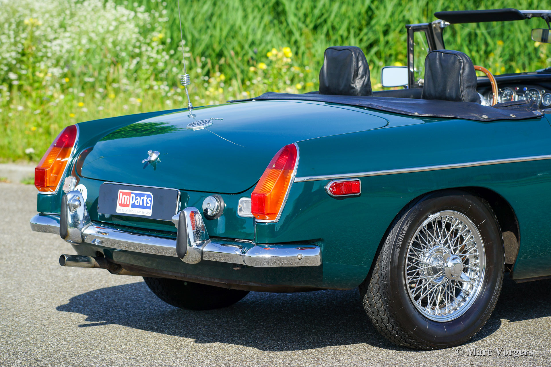 MG MGB roadster, jaar 1972. Kleur British Racing Green gecombineerd met een zwartleren interieur, zwart tapijt en een zwarte soft-top. Deze prachtige MGB roadster verkeert in een zeer goede conditie en de auto rijdt voortreffelijk! De 1800cc viercilindermotor loopt en klinkt perfect! Deze MGB heeft een goede anticorrosiebehandeling ondergaan van de bodem en de motorruimte. De auto is compleet uitgerust met overdrive, verchroomde spaakwielen, een MotoLita sportstuur met houten rand, een houten schakelpookknop, een zwarte tonneau cover, twee chromen achteruitkijkspiegels op de deuren, elektronische ontsteking, leren stoelen met hoofdsteunen en een windstop-scherm. Dit is een begerenswaardige MGB roadster en een geweldige rijdersauto! Deze MGB roadster is klaar voor elk nieuw avontuur in handen van een nieuwe eigenaar.