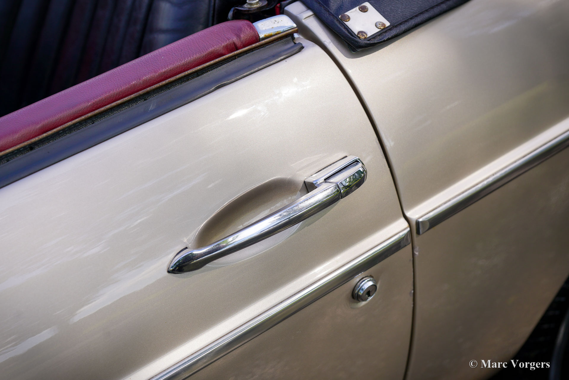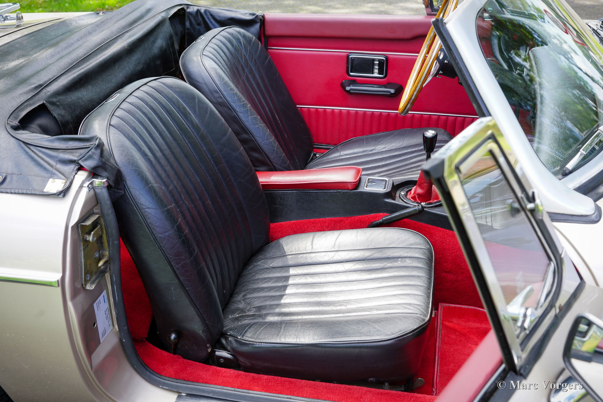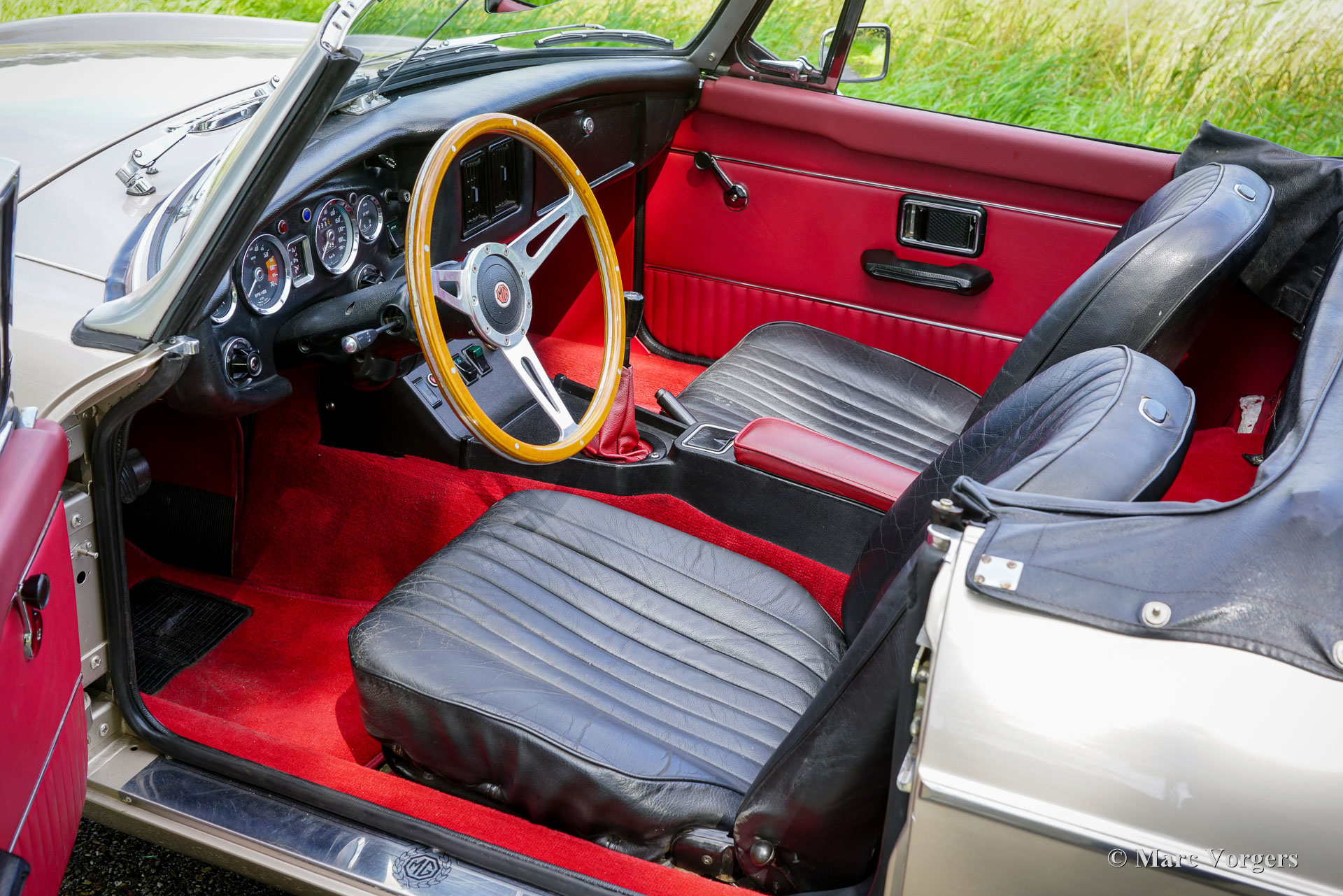 MG MGB roadster, jaar 1976. Kleur Golden Beige metallic gecombineerd met een tweekleurig zwart/rood interieur. Zwart (leder) stoelen en een zwart dashboard, rood tapijt en rode deurpanelen. Zwarte vinyl soft-top en hood-cover. Deze prachtige MGB roadster is nieuw verkocht in Nederland! De auto is nieuw verkocht met rubberen bumpers, deze zijn tijdens de carrosserierestauratie vervangen door mooie chroom exemplaren van het eerdere model. De carrosserie werd ook professioneel gespoten in goudbeige metallic. Deze geweldige MGB roadster verkeert in een zeer goede staat en de auto rijdt perfect! De auto is prachtig onderhouden en met zorg gestald geweest. Het interieur vertoont slechts lichte sporen van gebruik, de motorruimte en de kofferbak zijn mooi gedetailleerd en schoon. Deze MGB is voorzien van prachtige zilverkleurige spaakwielen, chromen wielmoeren, een rvs-bagagerek en een sportstuur met houten rand. De MGB roadster is een van de meest praktische en betrouwbare klassieke Britse roadsters, en daarbij komen lage onderhoudskosten als bonus! Dit prachtige exemplaar is klaar voor vele avonturen in de handen van een trotse nieuwe eigenaar!