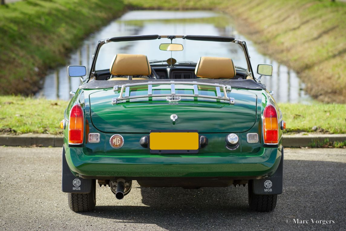 MG MGB roadster, jaar 1979. Kleur groen gecombineerd met een beige lederen interieur afgewerkt met groene biezen en zwart tapijt. Groene soft-top en hood-cover. Deze MGB roadster komt uit de laatste en meest doorontwikkelde serie. Deze laatste serie onderscheidde zich van de eerdere modellen door de rubberen veiligheidsbumpers en meer comfort. Bij deze MGB zijn de bumpers in carrosseriekleur gespoten waardoor ze mooi opgaan in de vorm van de auto. De MGB beschikt over een sportieve 1800 cc viercilindermotor met dubbele S.U.-carburateurs, een handgeschakelde 4-versnellingsbak, overdrive en rembekrachtiging. De auto verkeert in een zeer goede staat en deze MGB rijdt en stuurt voortreffelijk! De MGB roadster is een praktische klassieke sportwagen, hij biedt voldoende ruimte voor de inzittenden, kofferruimte voor sporttassen en een bagagerek voor een echte koffer.