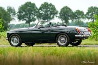 MG MGC roadster, bouwjaar 1968. Kleur donker ‘British Racing Green’ met een zwart lederen interieur, zwart tapijt, een zwarte ‘soft top’ en een zwarte hood cover. Deze geweldige MGC werd enige jaren geleden uitvoerig ‘body off’ gerestaureerd. De automobiel verkeert in sublieme topstaat en de auto rijdt uitstekend. De MGC is de zescilinder uitvoering van de MGB. De auto heeft dezelfde praktische kenmerken als de MGB maar die zijn bij de MGC te genieten onder de roffel van een krachtige zescilinder lijnmotor. Deze MGC is een originele Europese uitvoering. De auto is voorzien van een RVS uitlaat en chroom spaakwielen.