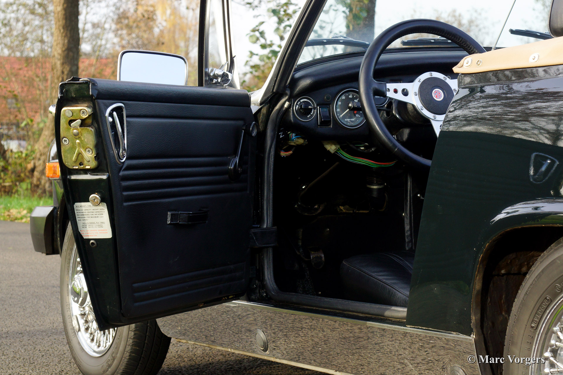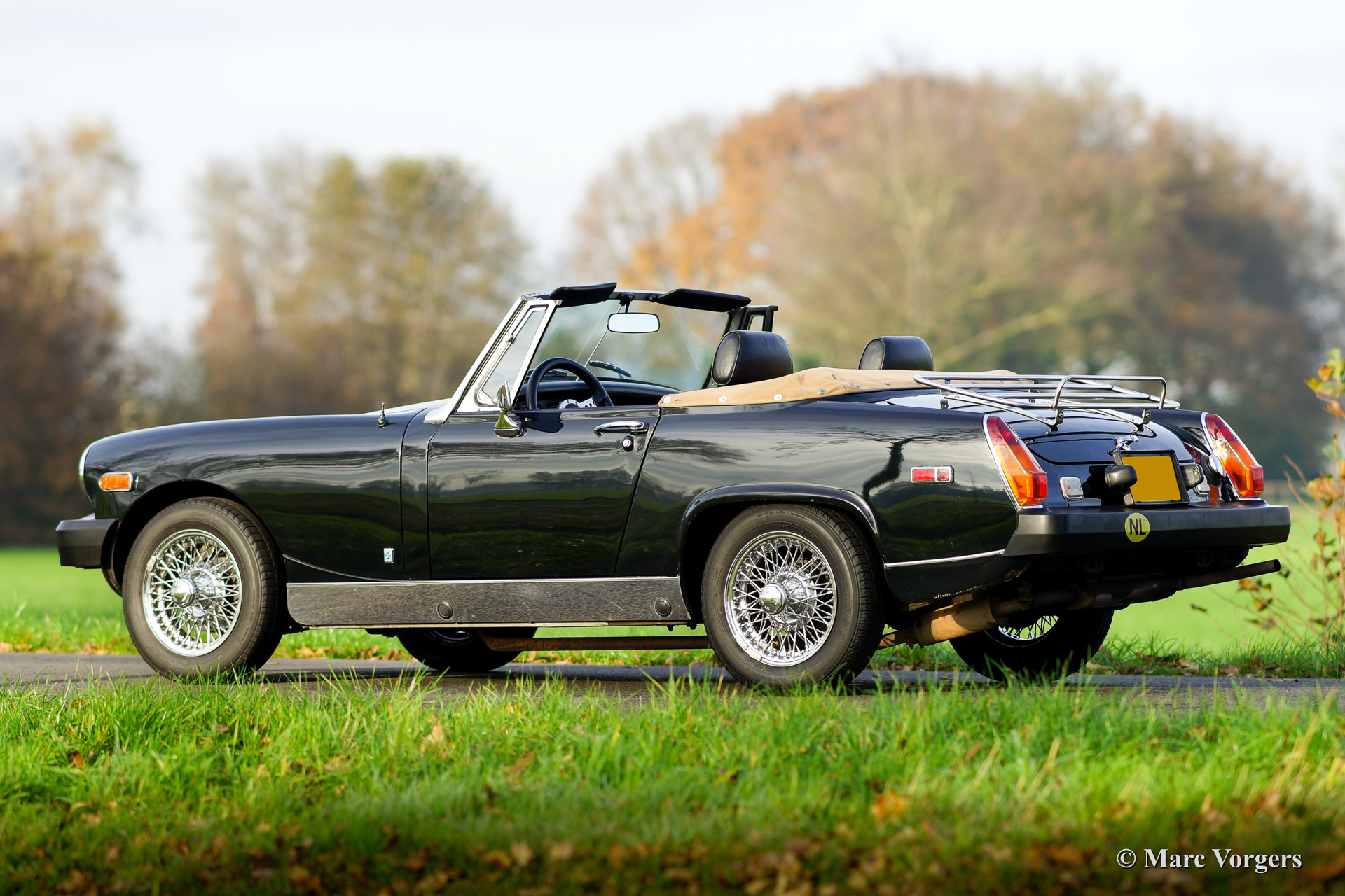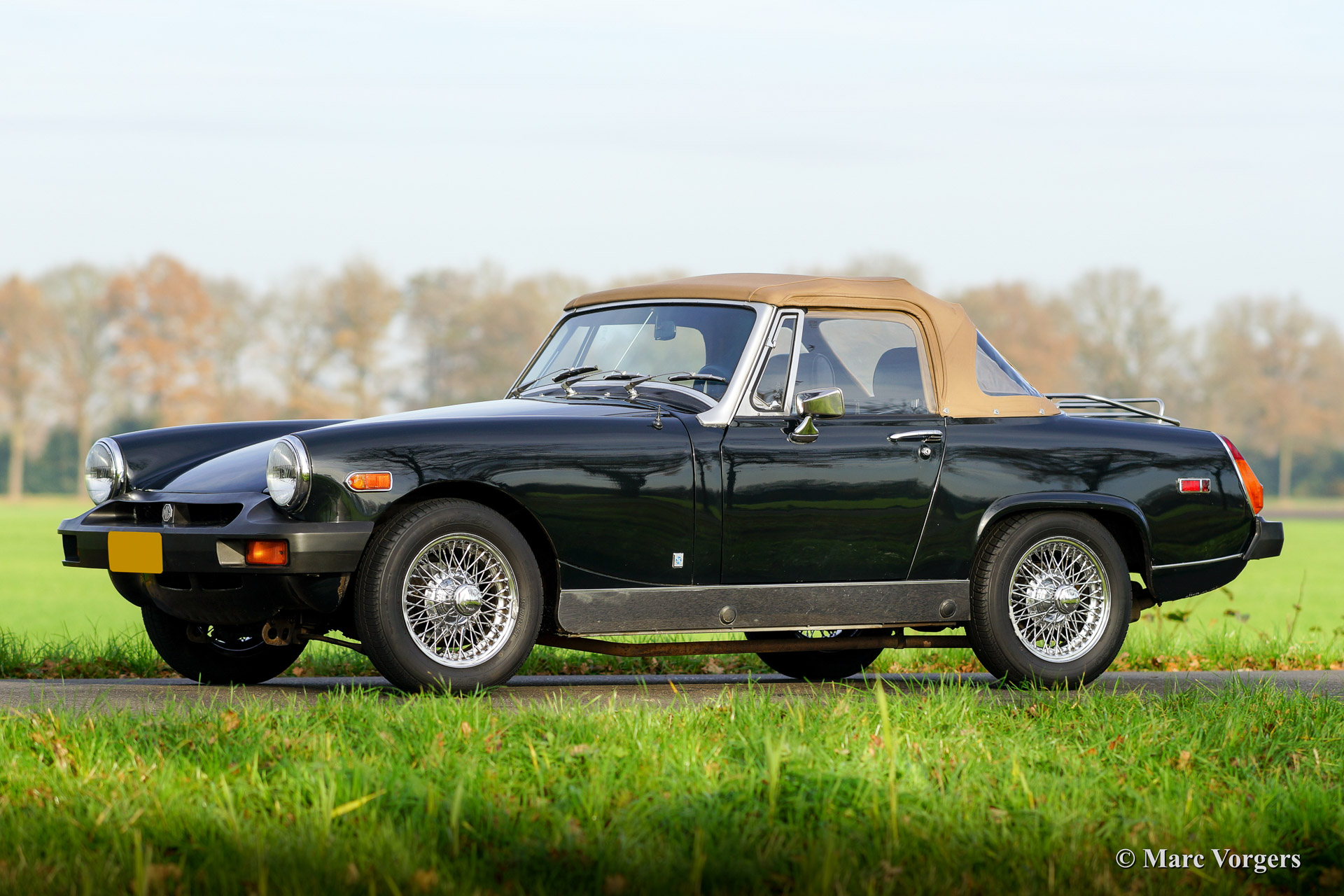 MG Midget 1500 (Mk IV), bouwjaar 1979. Chassis nummer: GAN6UL2223XXX. Kleur donkergroen, bijna zwart. Zwart vinyl interieur met zwart tapijt. Beige soft top en hood cover. Deze leuke MG Midget verkeert in zeer goede tot excellente staat en de auto rijdt voortreffelijk. Dit is een ideale klassieker om kennis te maken met het open Engelse rijgevoel! De MG Midget biedt veel ruimte en een functionele kofferbak. De soft top is eenvoudig op- en neer te klappen. Deze MG is goed onderhouden. De auto is uitgerust met chroom spaakwielen, een chroom kofferrek, een verchroomd kleppendeksel en een fraai klassiek sportstuur.