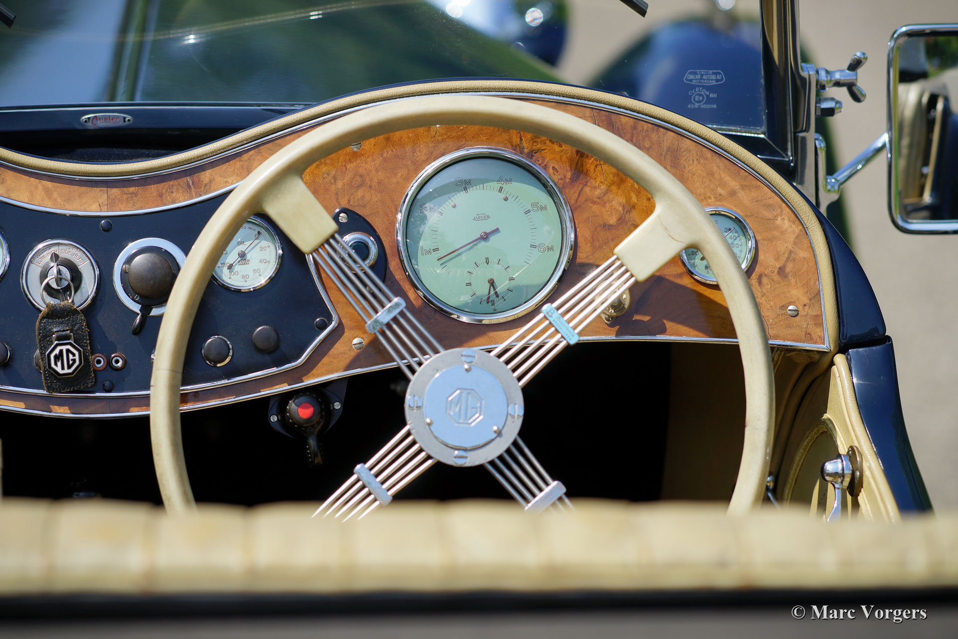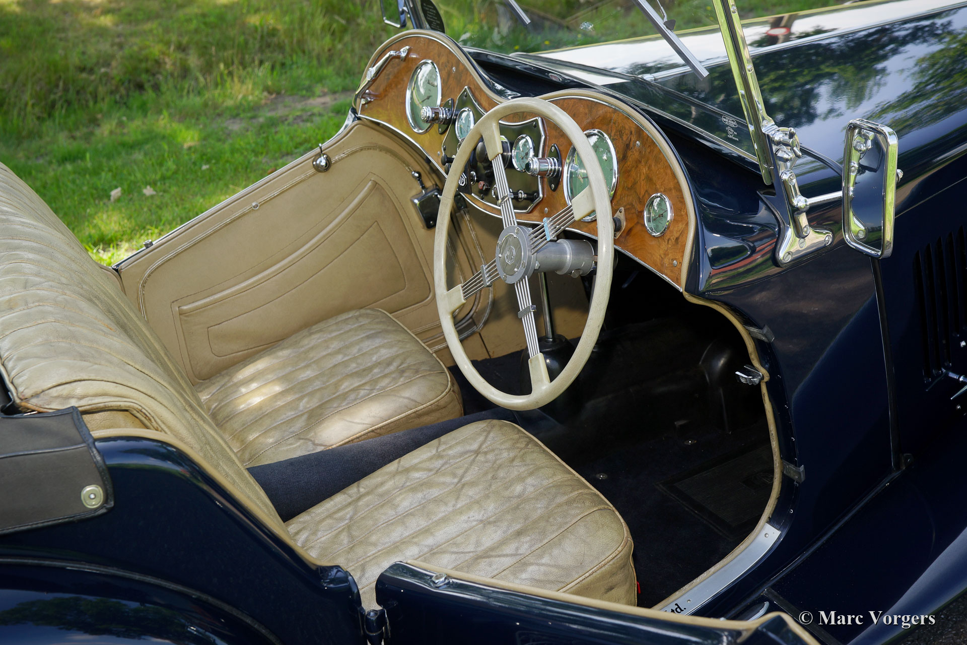 MG TB, jaar 1940. Kleur donkerblauw gecombineerd met een lichtbeige lederen interieur en donkerblauw tapijt. Zwarte soft-top met zwarte omkaderde zijschermen. Dit is een superzeldzame MG TB. Door het uitbreken van WO2 zijn er slechts 379 stuks geproduceerd. Deze MG TB is uitgerust met een viercilinder XPAG-motor. In de jaren '90 werd deze fantastische MG TB in Nederland 'body off' gerestaureerd en gereviseerd. Het interieur leder is nog origineel en in mooie staat. Een fotoverslag van de restauratie is aanwezig. Onlangs is de motor gereviseerd door een gerenommeerde Nederlandse specialist (van Giersbergen). De motor heeft sindsdien 5000 kilometer gelopen. Deze fraaie MG TB wordt geleverd met een volledig gedocumenteerde historie. Vanaf nieuw zijn alle eigenaren bekend en zelfs de originele Britse papieren en kentekenplaat zijn nog aanwezig (BFV17). De auto is voorzien van zilver gelakte spaakwielen en een centraal smeersysteem. De laatste eigenaar heeft deze schoonheid vanaf 1999 gekoesterd. Dit is uw kans om in het bezit te komen van een zeldzame MG TB in uitstekende conditie!