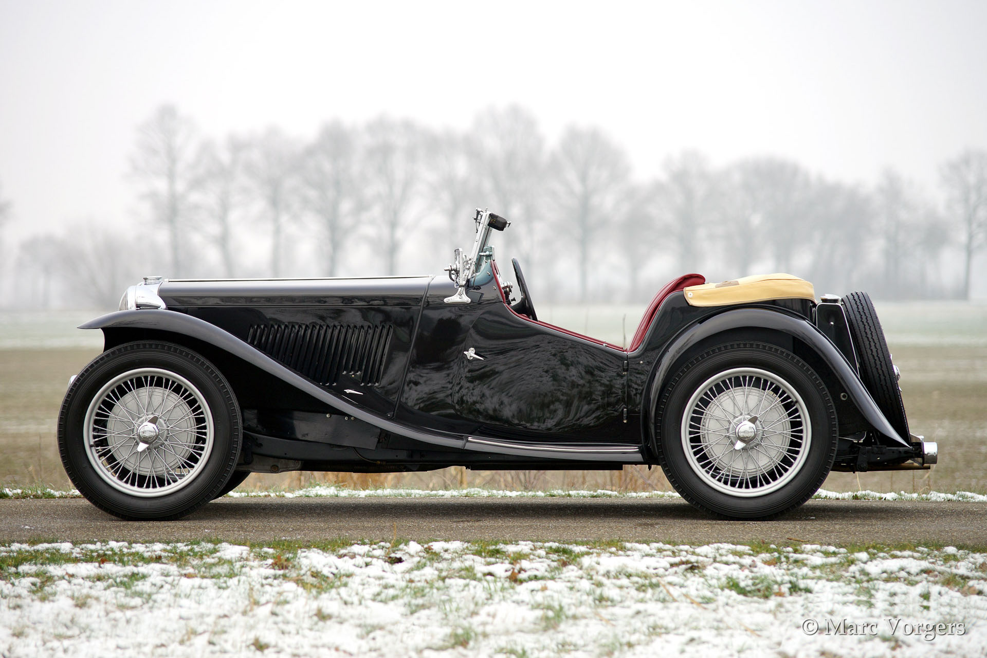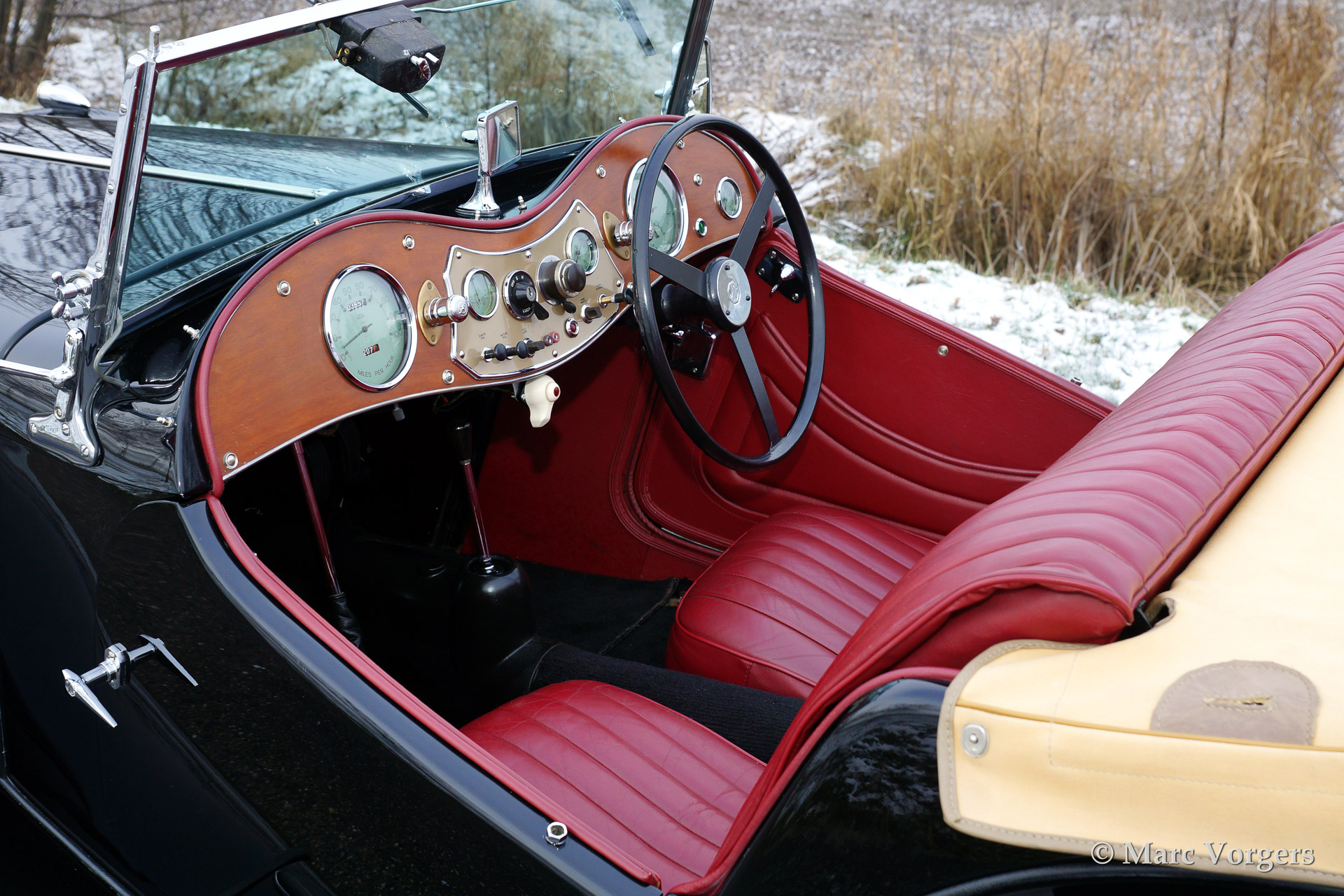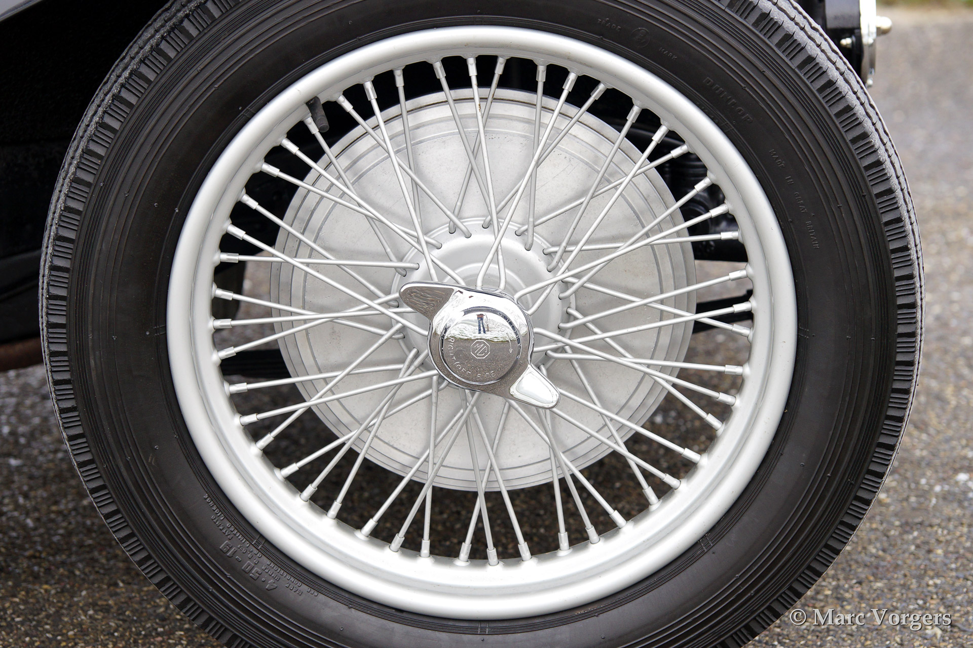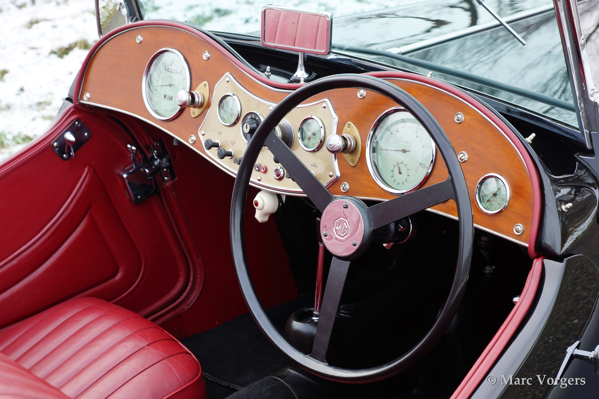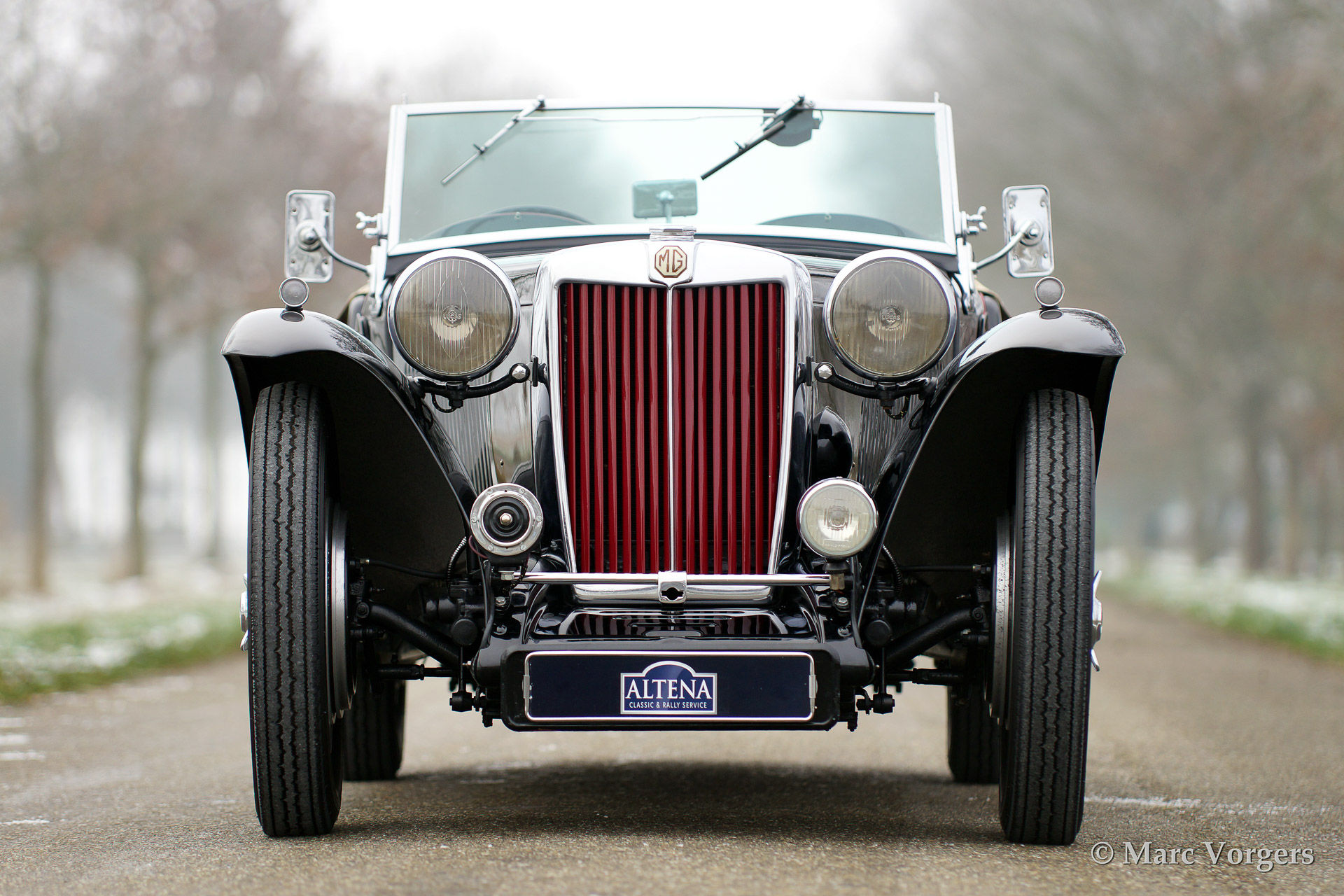 MG TC, bouwjaar 1947. Kleur zwart met een donker rood lederen interieur. Beige soft top, hood cover en tonneau cover. Deze prachtige MG TC werd uitvoerig gerestaureerd naar fabriek specificaties. De auto is uitgerust met spaakwielen, correcte Dunlop banden, originele Lucas lampen, spiegels en een aluminium kleppendeksel.
