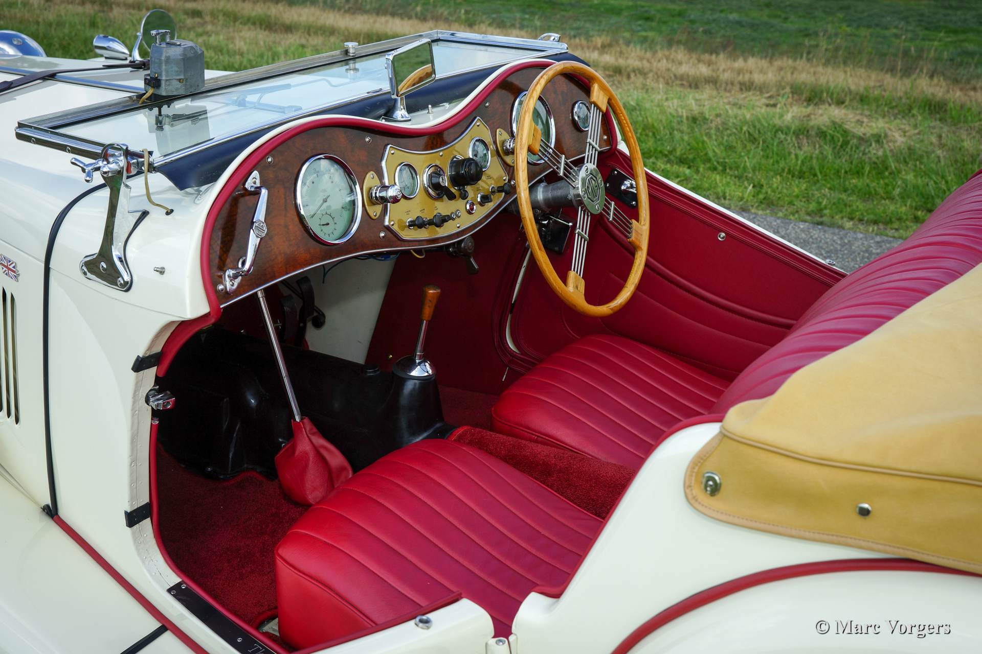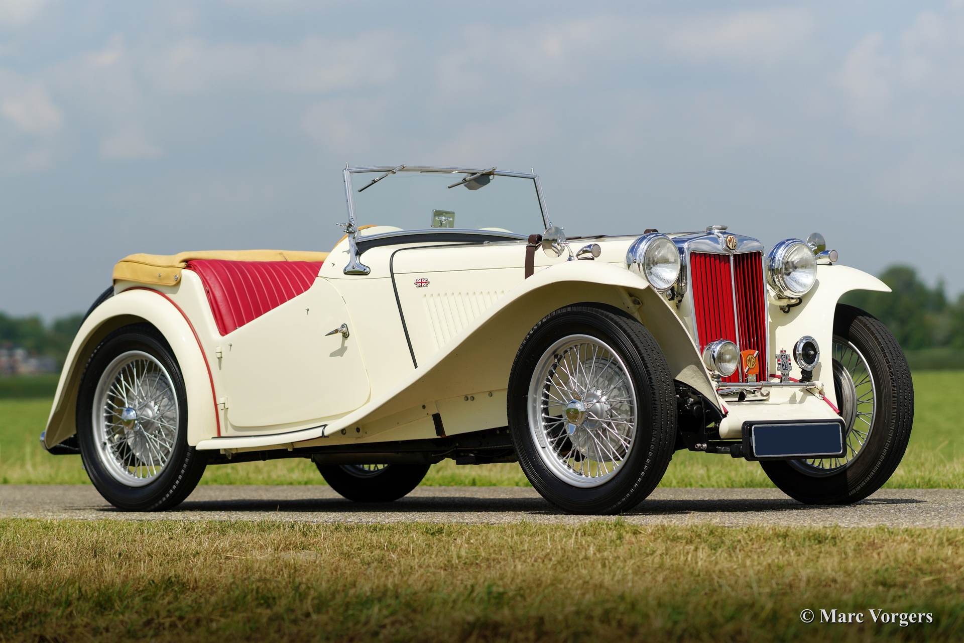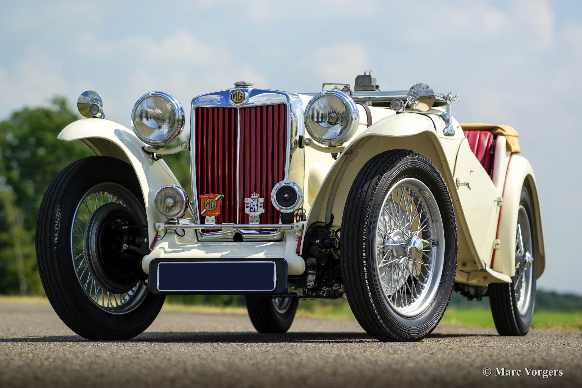 MG TC, bouwjaar 1948. 'Matching numbers'. Kleur Old English White met een rood lederen interieur en zwart tapijt. Beige canvas ‘soft-top’ en ‘side-screens’, beige tonneaucover. Deze prachtige MG TC werd uitvoerig gerestaureerd in Nederland, een reportage van de restauratie is aanwezig. Deze MG TC verkeert in sublieme topstaat en de auto rijdt perfect. Deze MG TC is uitgerust met een 5-versnellingsbak, aluminium remtrommels, een leren riem over de motorkap, twee reservewielen achterop, een RVS uitlaat, Lucas mistlamp, nieuwe spaakwielen en Dunlop banden.