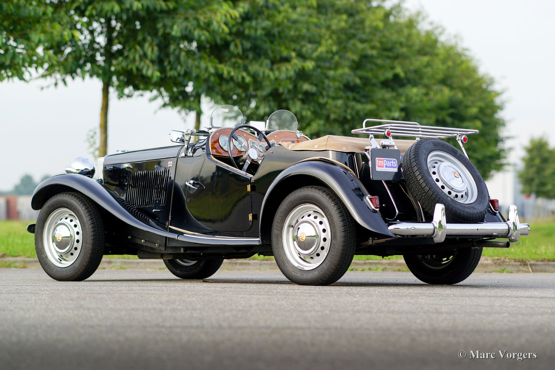 MG TD, bouwjaar 1951. Kleur zwart met een beige lederen interieur en zwart tapijt. Beige kap, tonneau cover en opsteek-zijruiten. Deze prachtige MG TD werd enige jaren geleden uitvoerig en grondig gerestaureerd. De automobiel verkeert in excellente staat! Deze MG TD is uitgerust met de originele ‘disc wheels’, Brooklands race ruitjes, Brooklands stuurwiel en een chroom kofferrek.