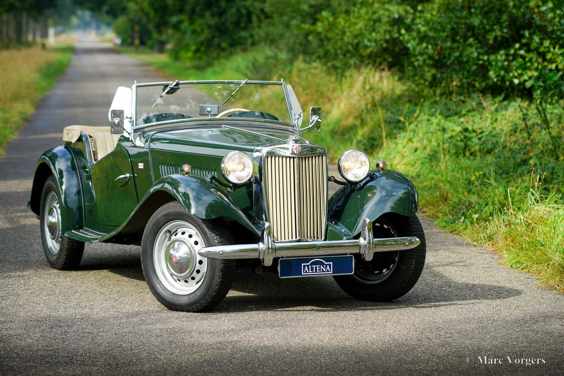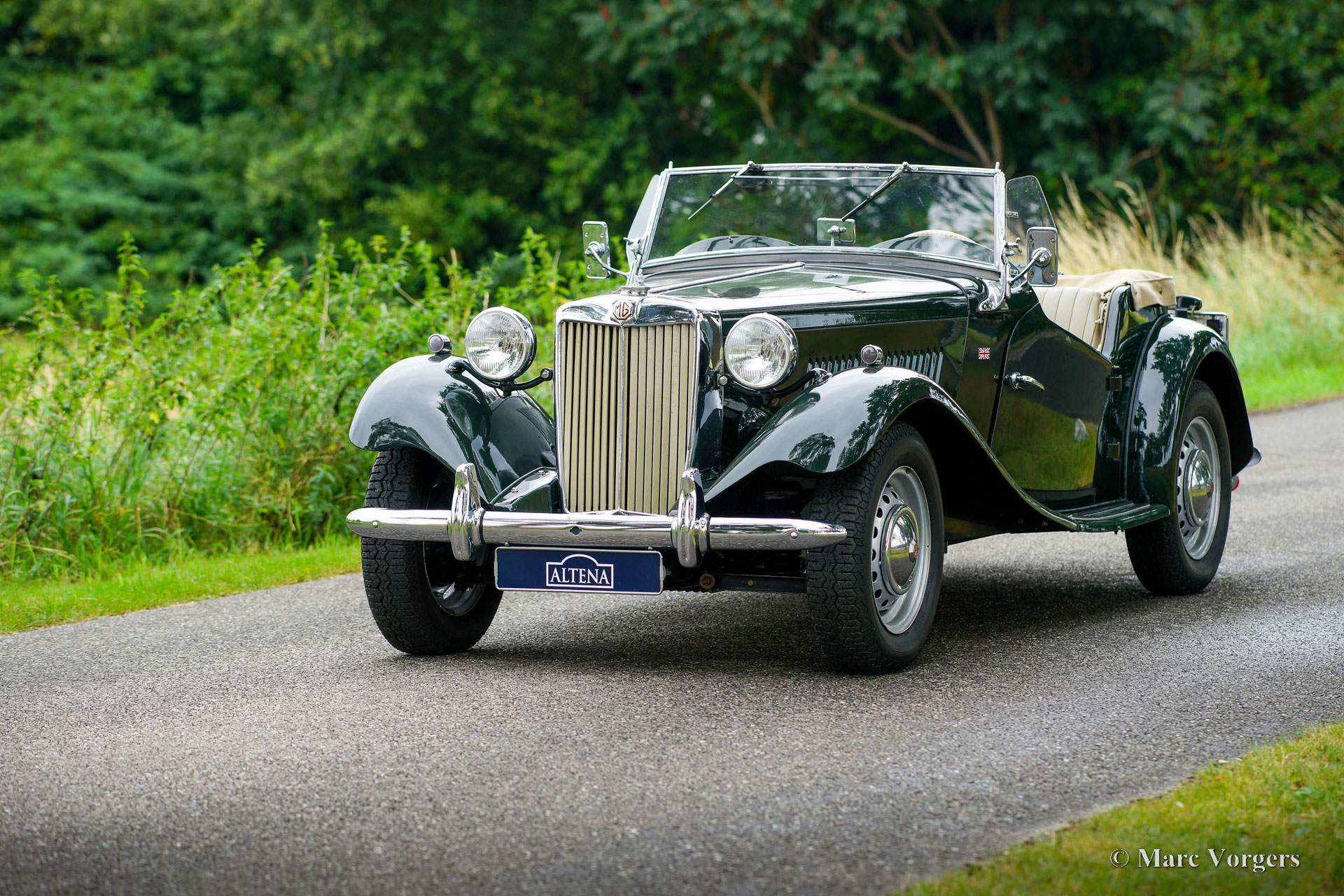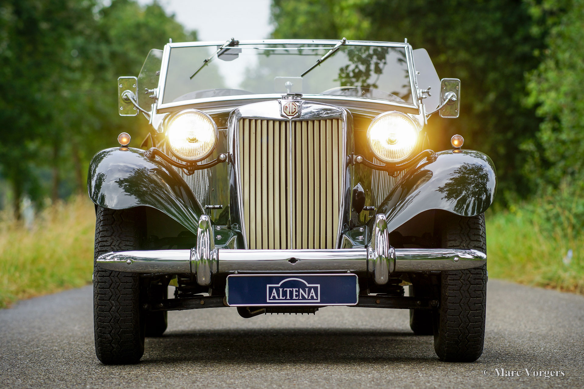 MG TD, jaar 1952. Kleur British Racing Green gecombineerd met magnolia (lichtbeige) interieur met lederen stoelen en zwart tapijt. Beige vinyl kap en beige mohair tonneau cover. Deze prachtige MG TD is nieuw verkocht in de Verenigde Staten, de auto is in het jaar 2000 naar Nederland geïmporteerd. Na aankomst in Nederland is de auto uitvoerig naar perfectie gerestaureerd (inclusief de kabelboom). Sindsdien heeft de auto slechts 4852 mijl gereden. De afgelopen 22 jaar is de MG gekoesterd door MG-liefhebbers die de auto in uitstekende staat hebben gehouden! De MG ‘EPAG’-motor loopt feilloos en alle bedieningselementen werken zoals het hoort. Deze MG TD toont alle originele details zoals het originele stuur en de stalen wielen met chromen wieldoppen. Deze prachtige en super originele MG TD kan in elk land geïmporteerd worden. Deze fraaie MG TD is een waar pareltje voor de liefhebber.