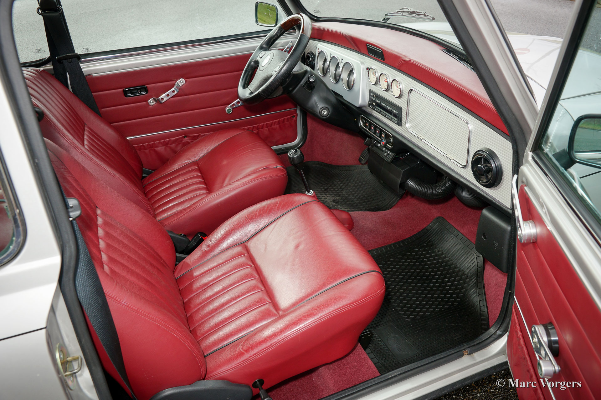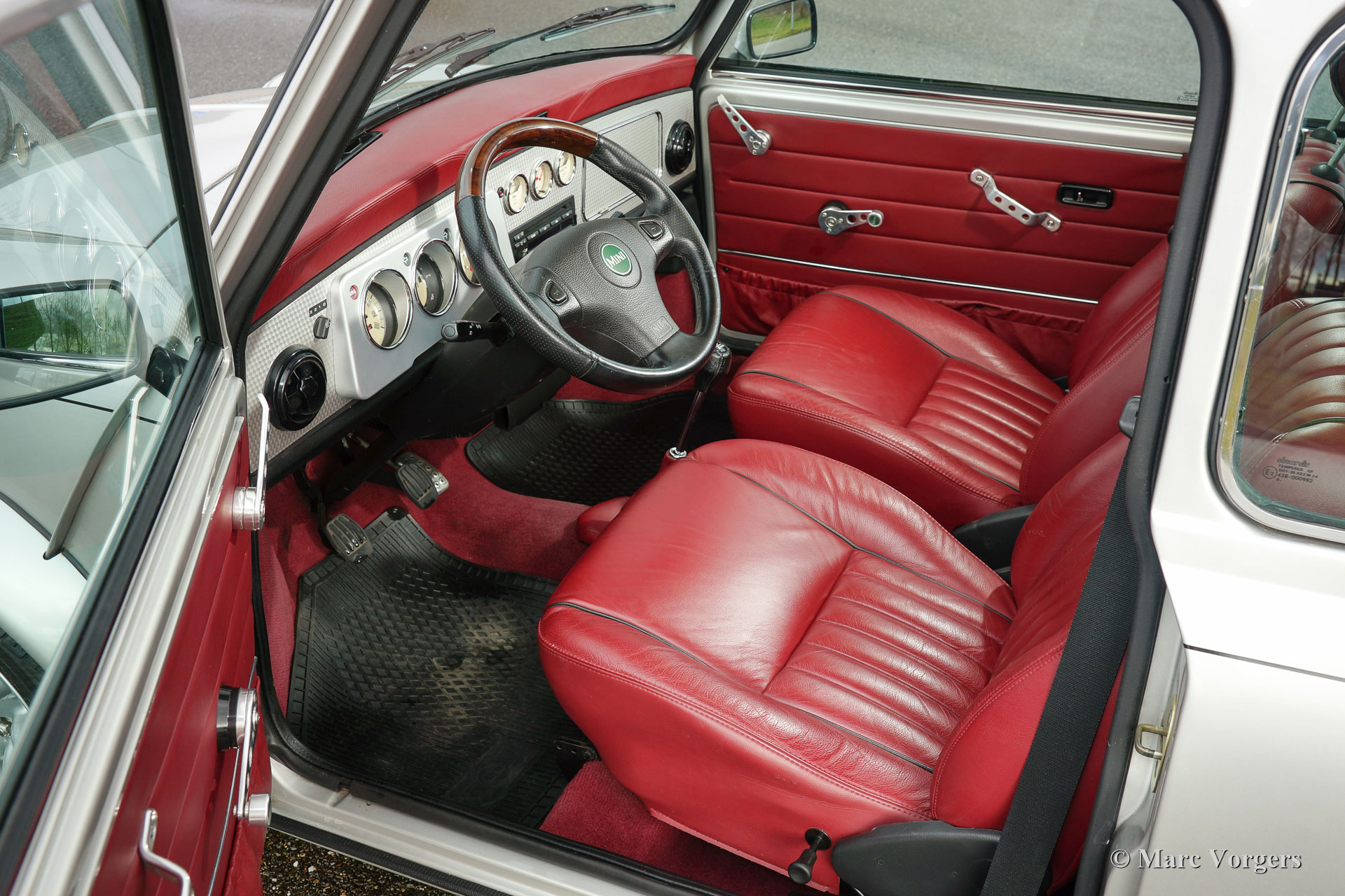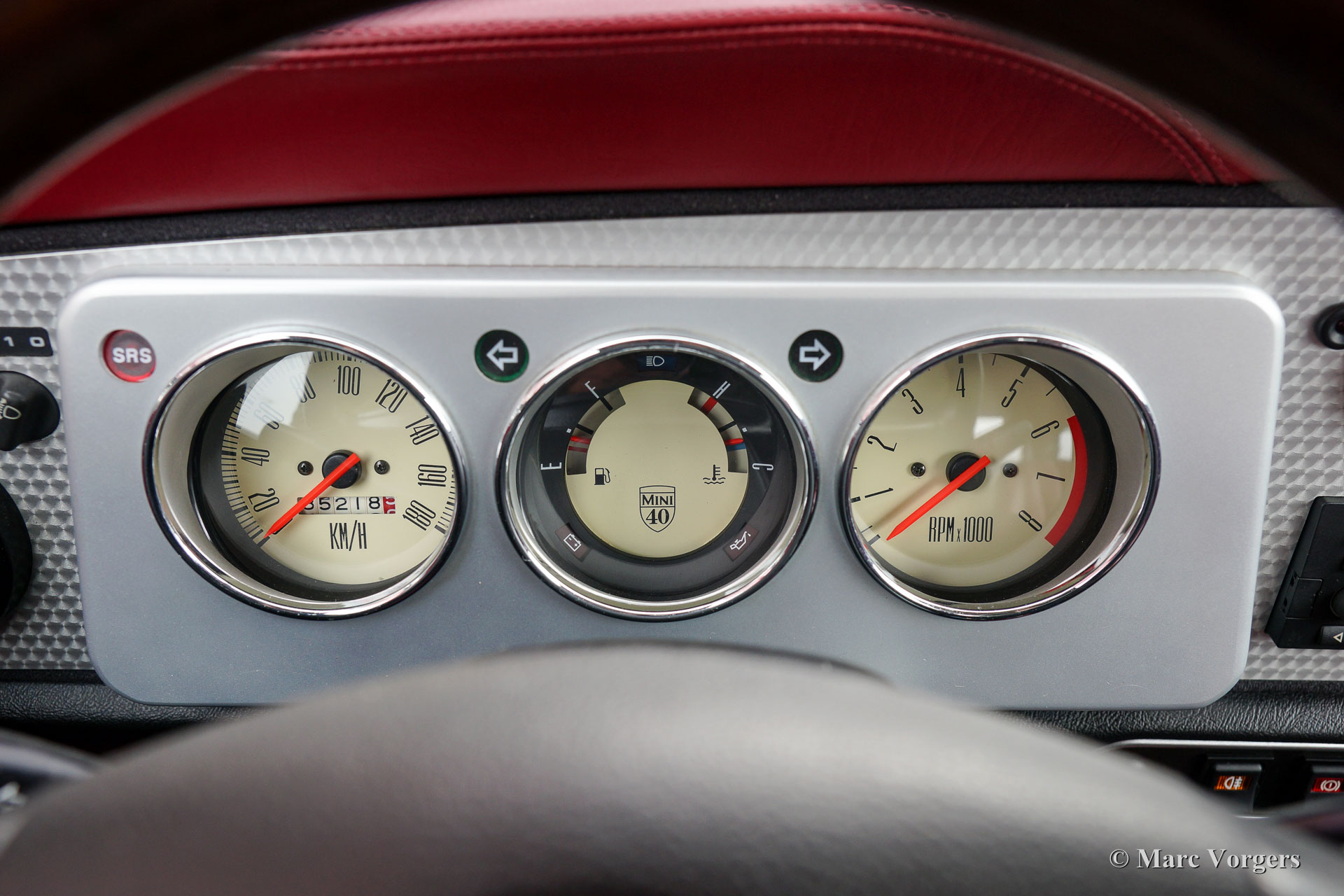 Rover Mini 40th Anniversary, jaar 2001. Kleur ‘Platinum’ zilver metallic met een ‘Burgundy’ roodlederen interieur en rood tapijt. Deze geweldige Mini werd in 2003 vanuit Duitsland ingevoerd. De auto verkeert in sublieme originele staat, de auto rijdt geweldig en heeft vanaf nieuw slechts 35.000 km gereden! De auto toont prachtige details zoals een gepolijst aluminium dashboard, aluminium deurgrepen, magnolia dashboard instrumenten met het 40 logo erin. Aan de buitenkant vallen de wielkastverbreders op en de prachtige lichtmetalen wielen. Alle ‘badges’ op de carrosserie inclusief de ‘GB’ aanduiding zijn origineel voor deze zeldzame uitvoering. Er werden slechts 800 exemplaren gebouwd in zeven kleuren. De auto is enige maanden geleden voorzien van nieuwe banden en er is een Nederlands instructieboekje aanwezig.