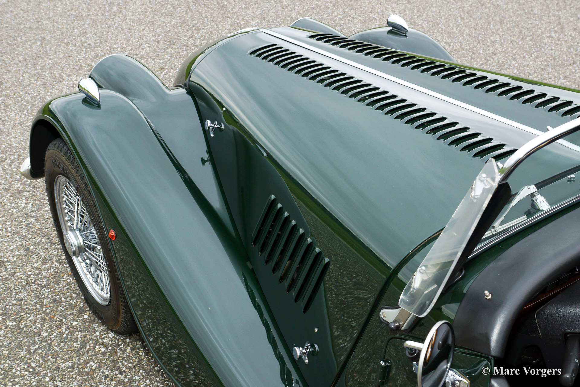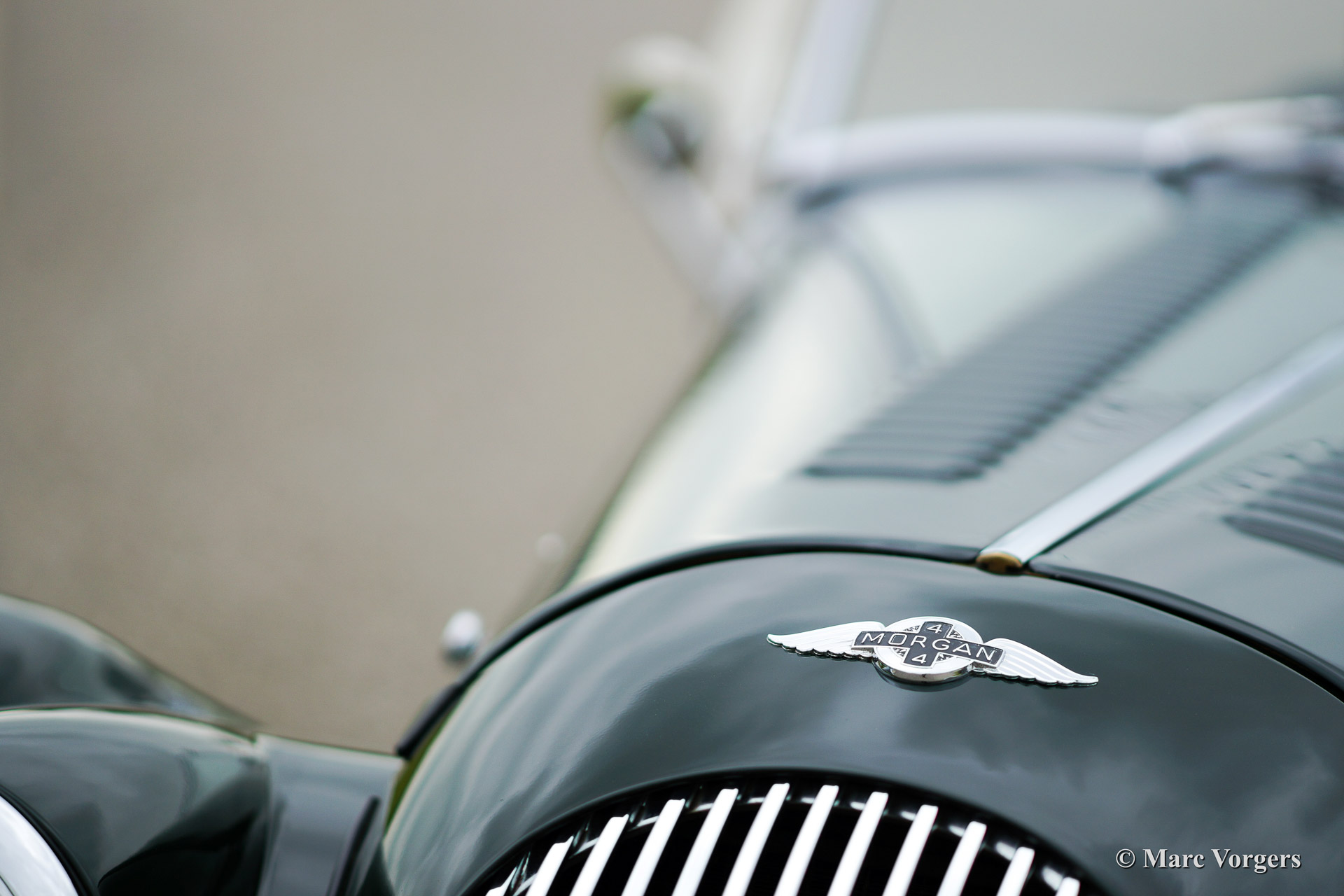 Morgan 4/4 1800, bouwjaar 1997. Kleur donker 'British Racing Green' met een groen lederen interieur afgebiest met groene 'piping'. Groen tapijt, zwarte vinyl soft top en tonneau cover. Deze Morgan 4/4 is uitgerust met chroom spaakwielen, chroom wielmoeren, een RVS uitlaat, chroom kofferrek, verchroomde bumpers, sportstuur met houten rand, houten dashboard, stoelen met hoofdsteunen en een 'badge bar'.
