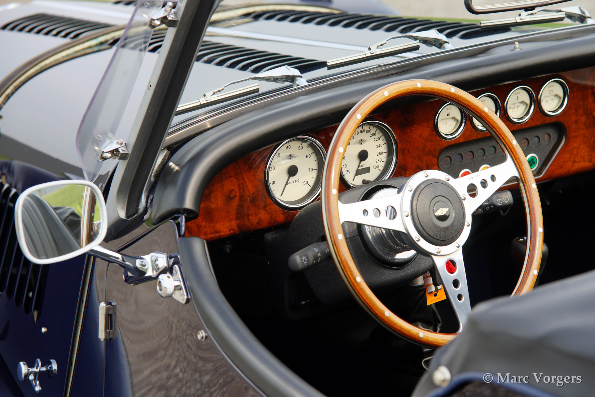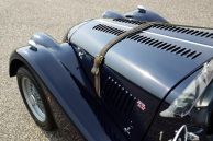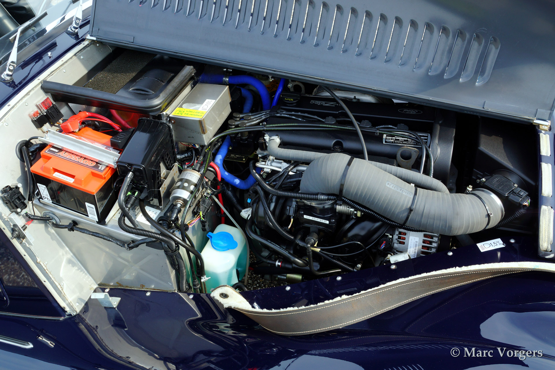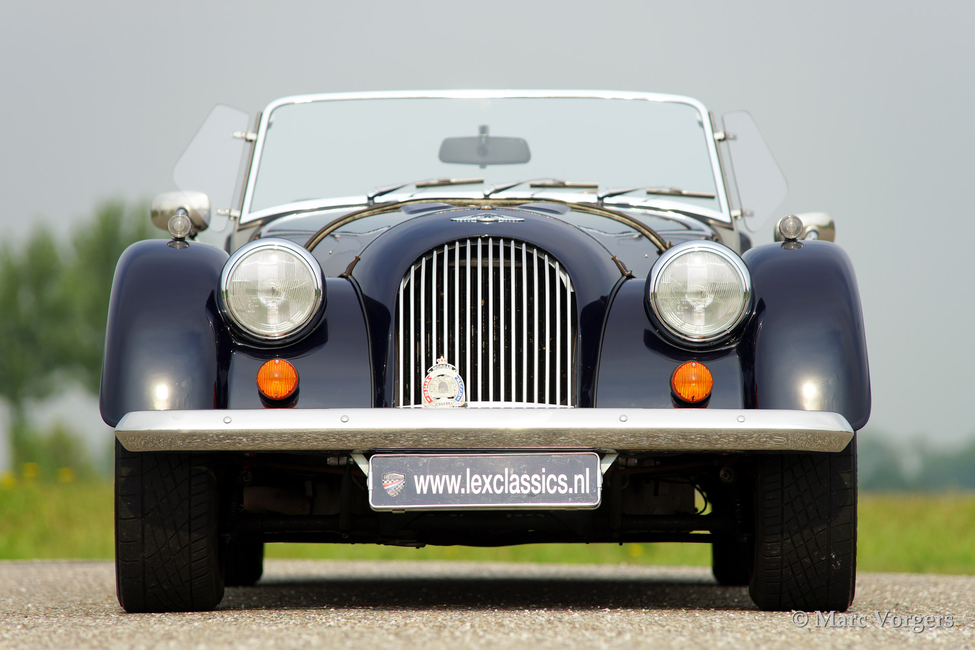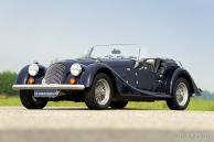 Morgan 4/4 1800 Zetec, bouwjaar 2003. Kleur donkerblauw met een zwart lederen interieur. Zwarte soft top met blauwe 'piping', zwarte tonneau cover. Deze prachtige Morgan 4/4 is voorzien van een houten dashboard, een MotoLita stuur met houten rand, RVS kofferrek, RVS uitlaat, aluminium 'side screens', 3e remlicht, 'badge bar' en een mistlamp achter.
