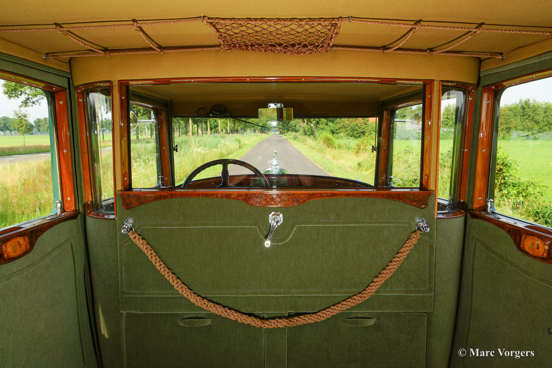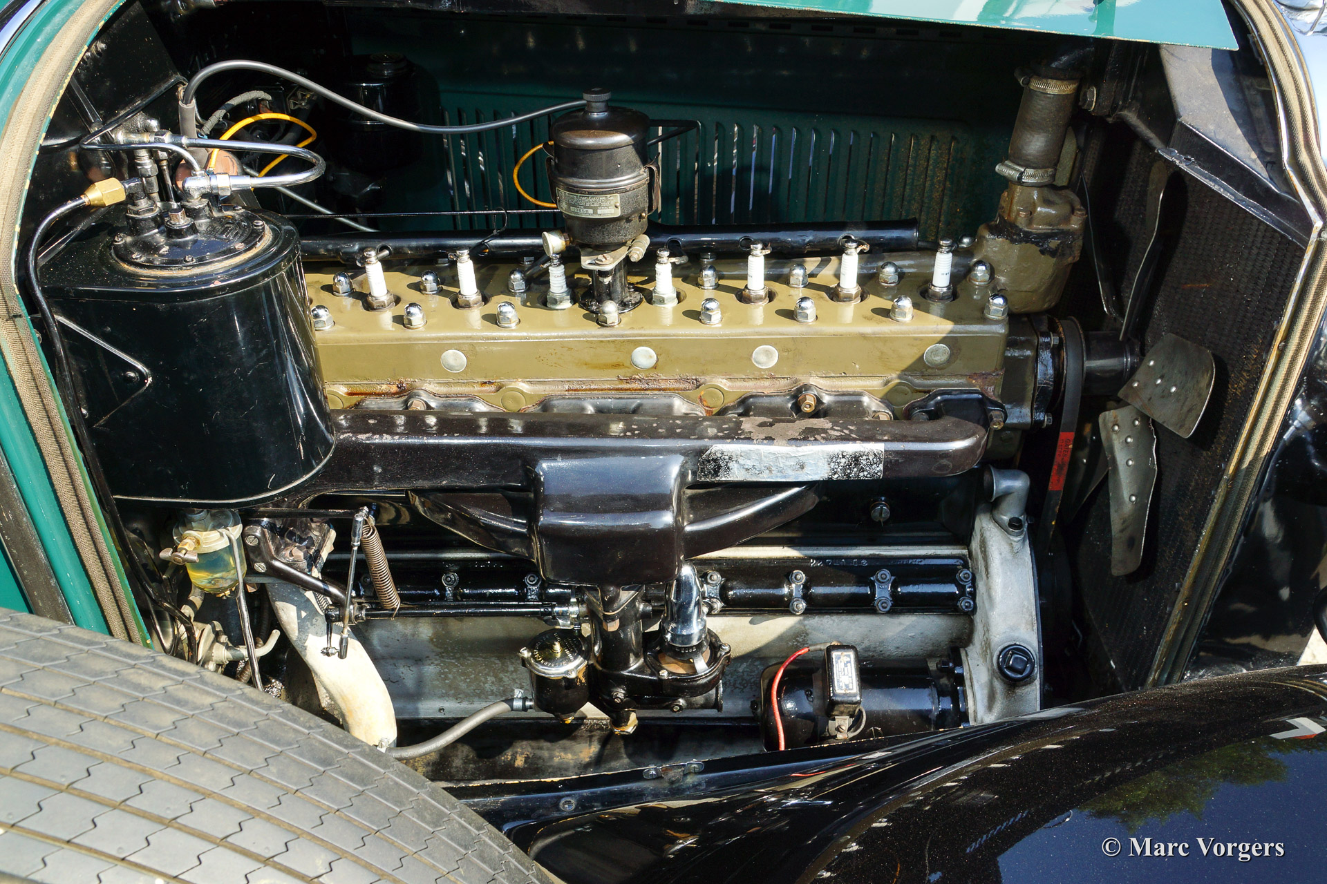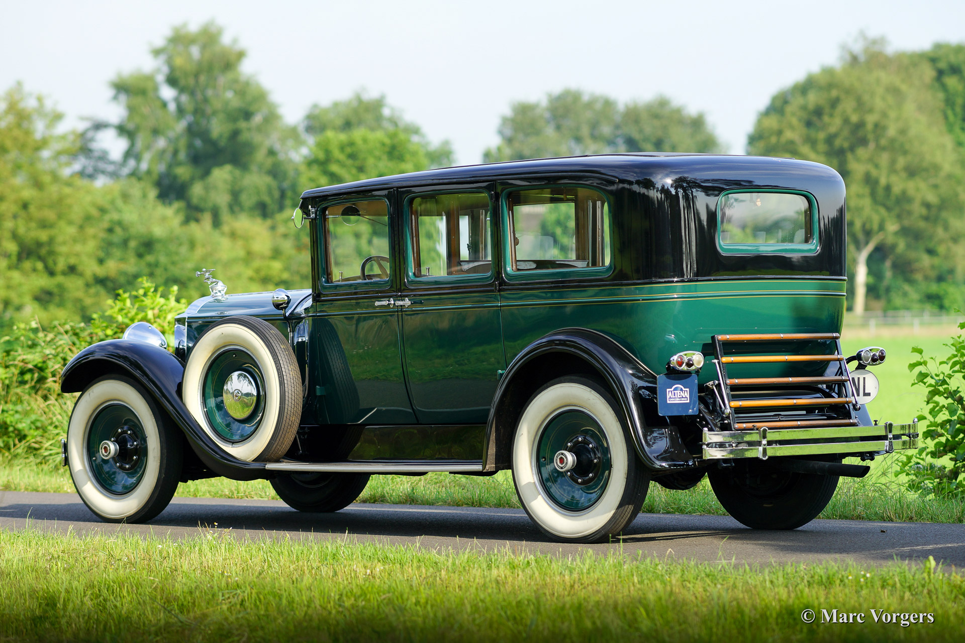 Packard 640 Custom 8 saloon, bouwjaar 1928. Kleur 'two-tone' groene carrosserie met zwarte spatborden. Groen beige velours interieur. Deze indrukwekkende Packard werd in 1929 nieuw uitgeleverd via Packard vertegenwoordiger 'Pilette' in Brussel, België. Packard automobielen waren in de jaren 1920 de duurste auto's die voor geld te koop waren. Zeer hoge kwaliteit en vakmanschap stralen van el detail. Deze prachtige Packard 640 Custom 8 werd uitvoerig en zeer fraai gerestaureerd, de automobiel verkeert in subliem topstaat en de auto rijdt verrassend fijn. De achtcilinder lijnmotor draait bijzonder soepel en de versnellingsbak schakelt voortreffelijk. Tussen het chauffeurs en passagiersgedeelte bevindt zich een op- en neerlaatbare scheidingsruit. Voorin treft men een lederen bank voor de chauffeur en een prachtig houten dashboard. Het passagiers compartiment ademt een welhaast koninklijke luxe met fraaie velours bekledingsstoffen, prachtig houtsnijwerk, inlegwerk en lakwerk. Verder hebben de passagiers de beschikking over rolgordijnen, een klok, voetsteunen, kortom aan alle comfort is gedacht. Dit is een zeldzame automobiel uit de gouden jaren 1920 toen alles mogelijk was en het levensgenot van de westerse mens op zijn hoogtepunt was. Een hoogst begerenswaardige automobiel voor de kenner/verzamelaar.