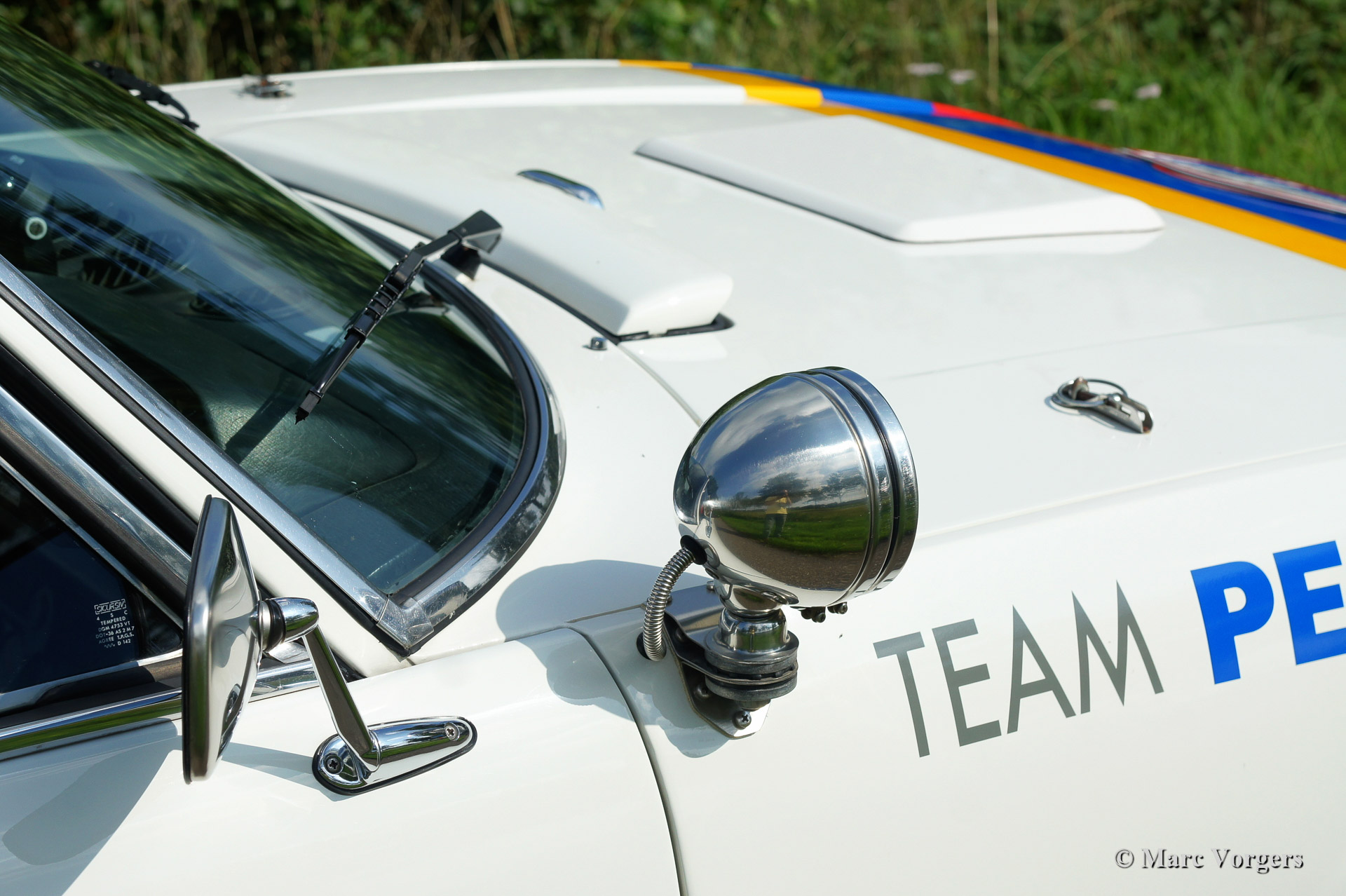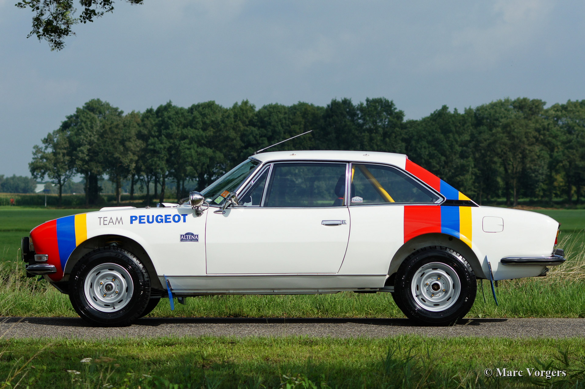Peugeot 504 Coupe (C12) auto, bouwjaar 1976. Kleur wit met Team Peugeot rally 'striping', zwart rally interieur met blauwe rally stoelen.