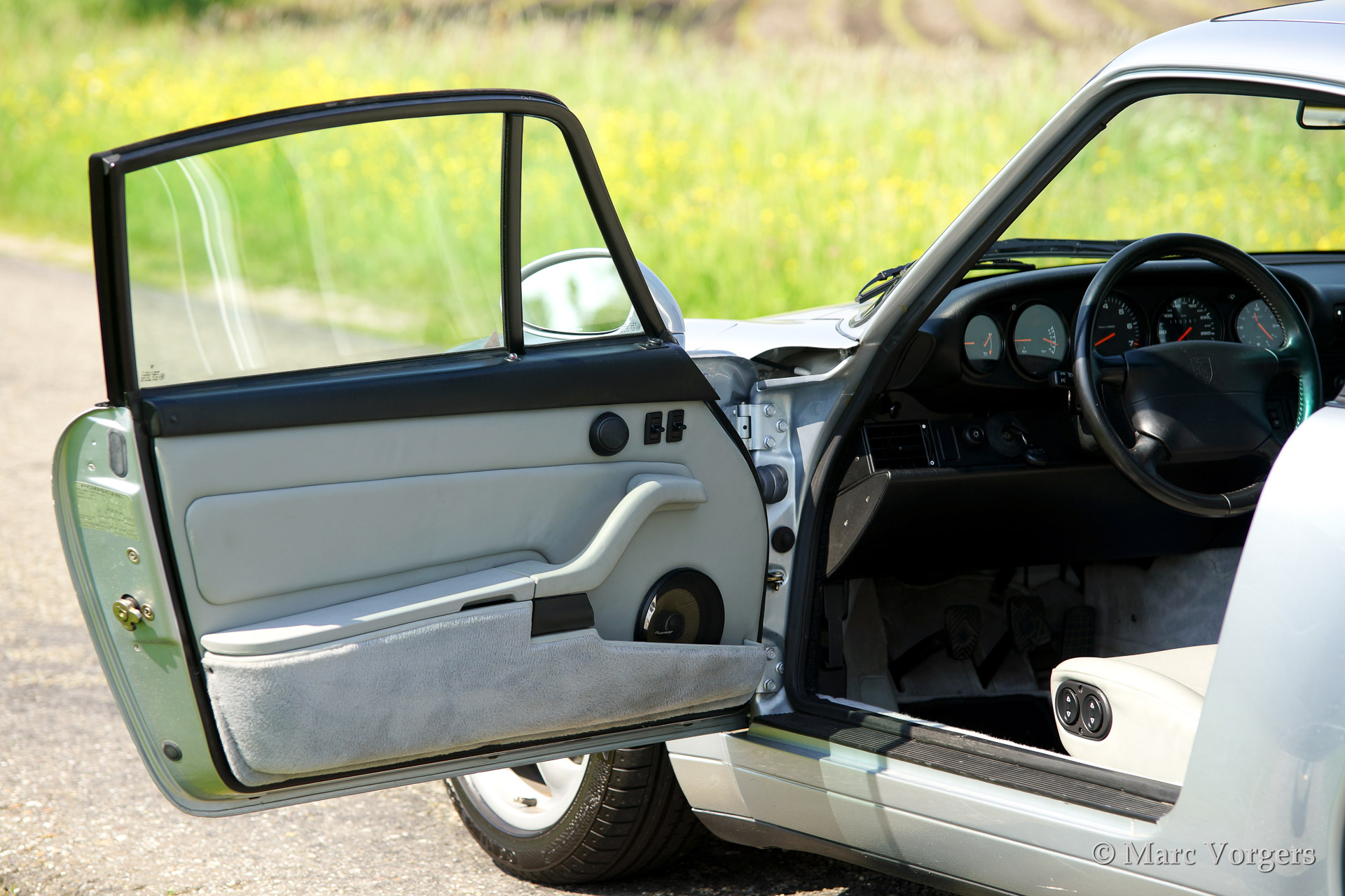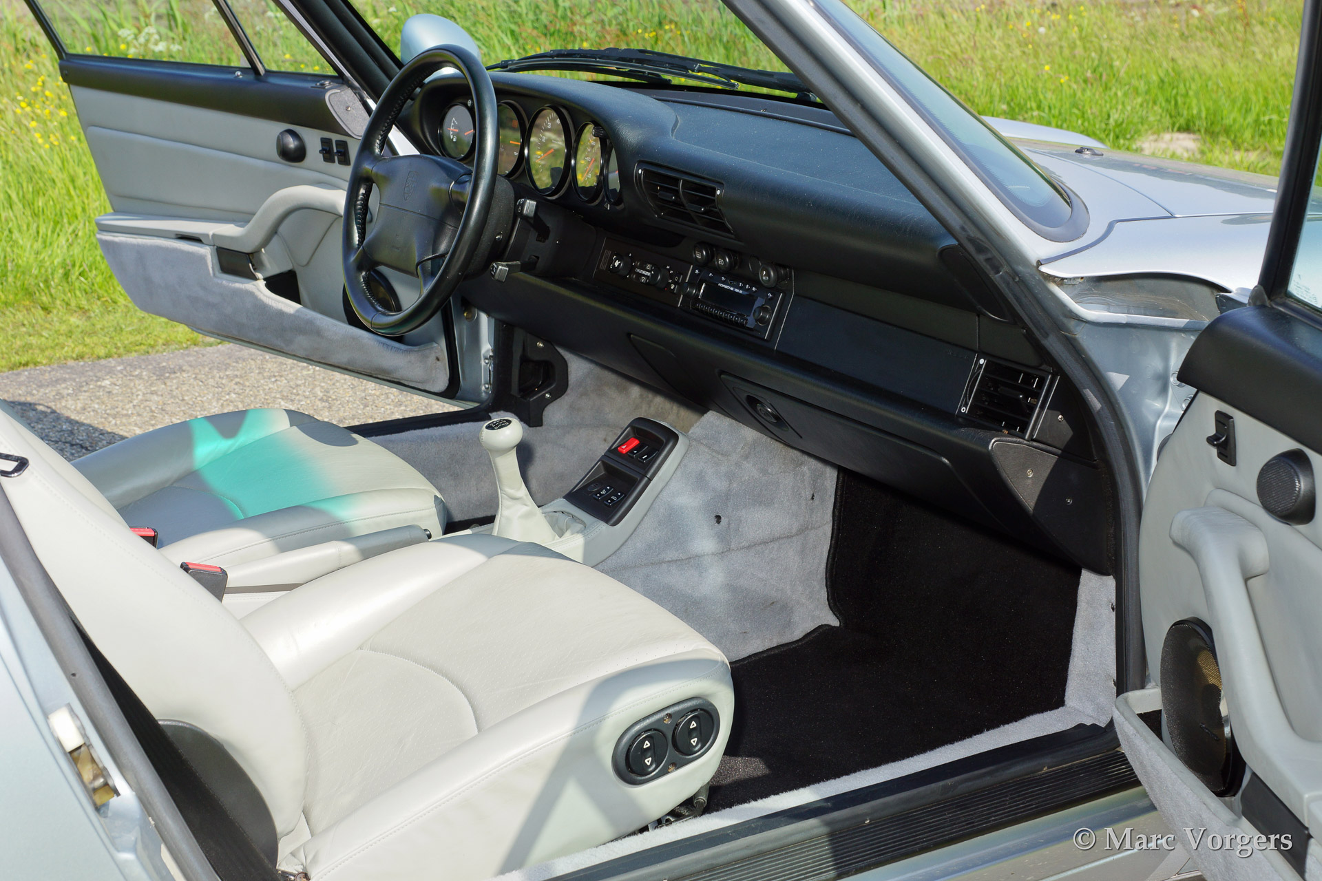 Porsche 911 (993) Carrera (993), bouwjaar 1995. Kleur zilvergrijs metallic met een grijs lederen interieur. Deze prachtige Porsche 911 werd nieuw afgeleverd in Amerika. De automobiel is uitgerust met originele lichtmetalen 'Cup' wielen en een elektrisch schuifdak.