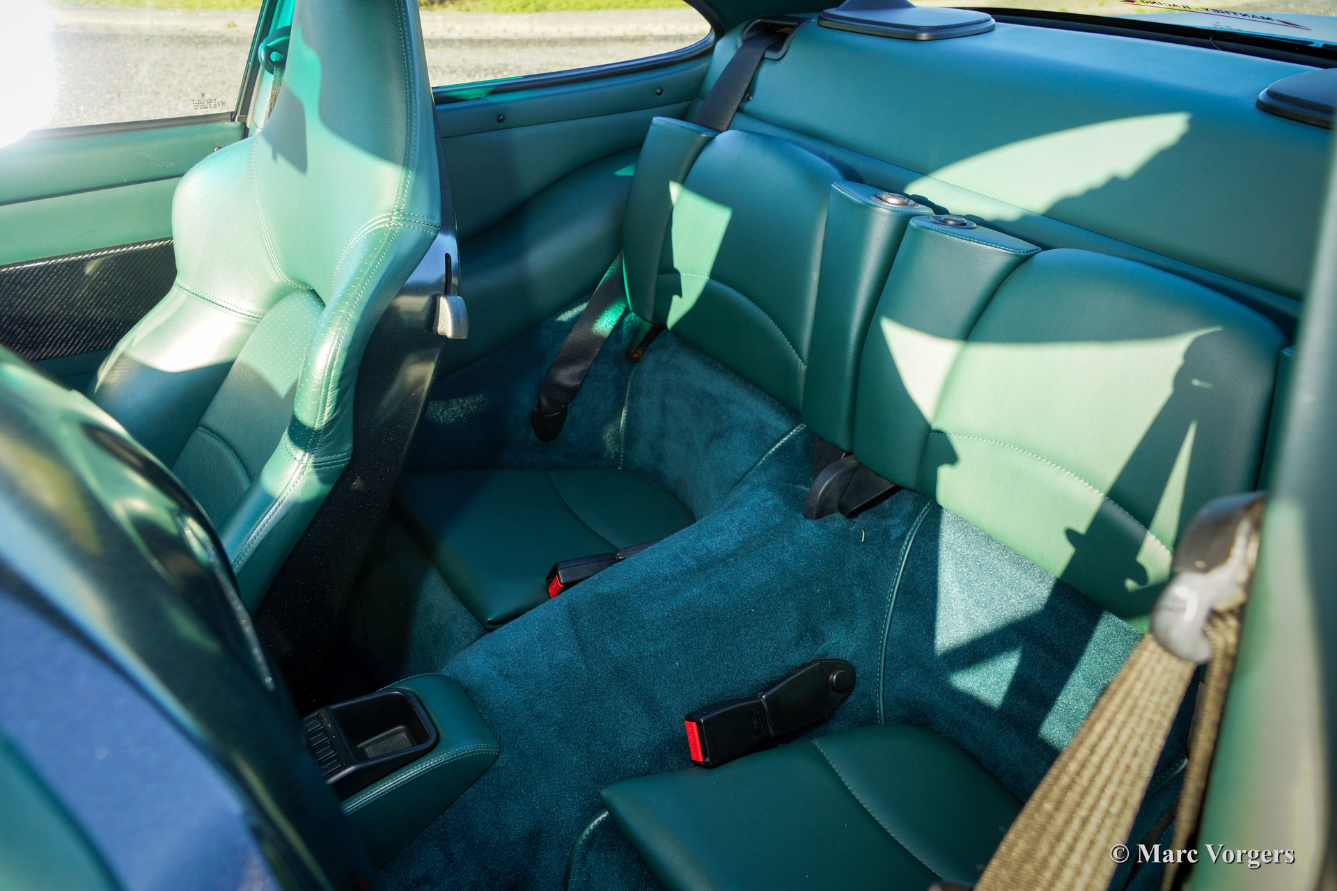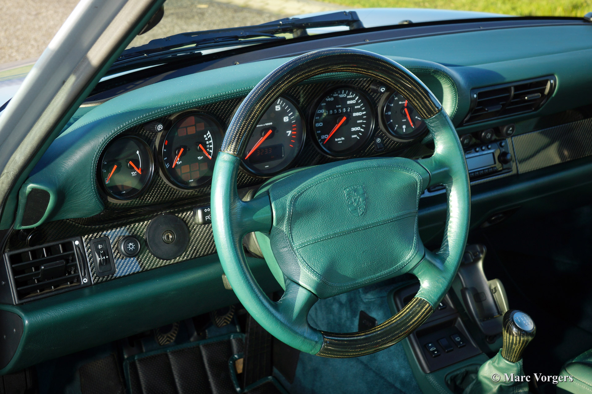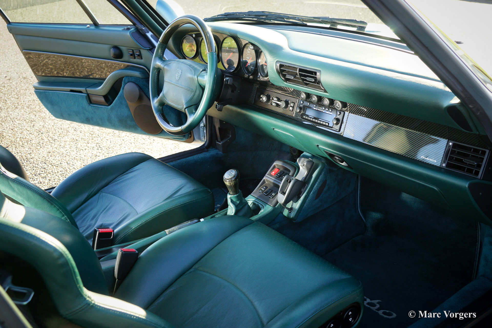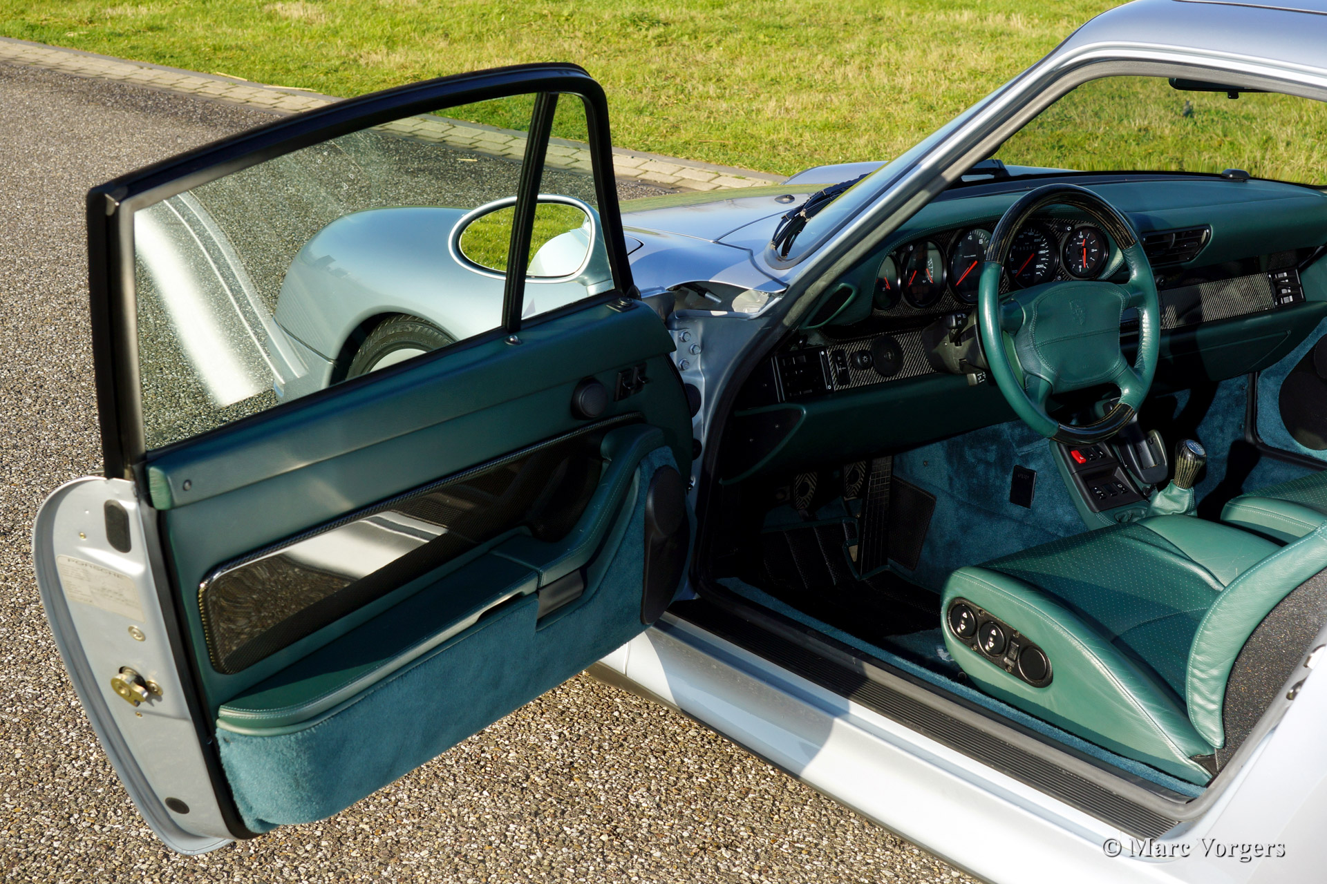 Porsche 911 (993) Turbo, bouwjaar 1996. Kleur 'Polar' zilver metallic met een 'Ceder' groen lederen 'sport' interieur. Deze 911 Turbo beschikt over vele zichtbare opties zoals: origineel elektrisch schuifdak, versnellingspook en handrem-greep uitgevoerd in carbon en carbon accenten op het dashboard en op de deurpanelen.