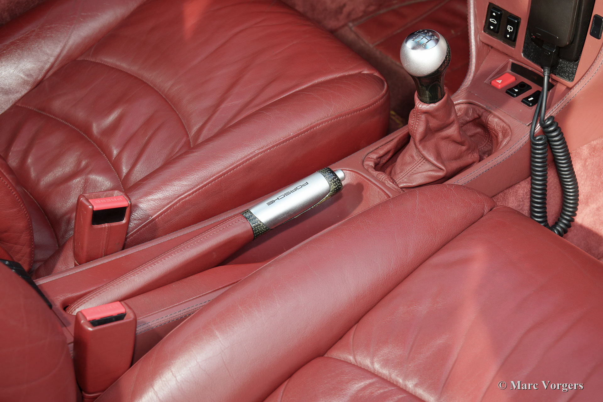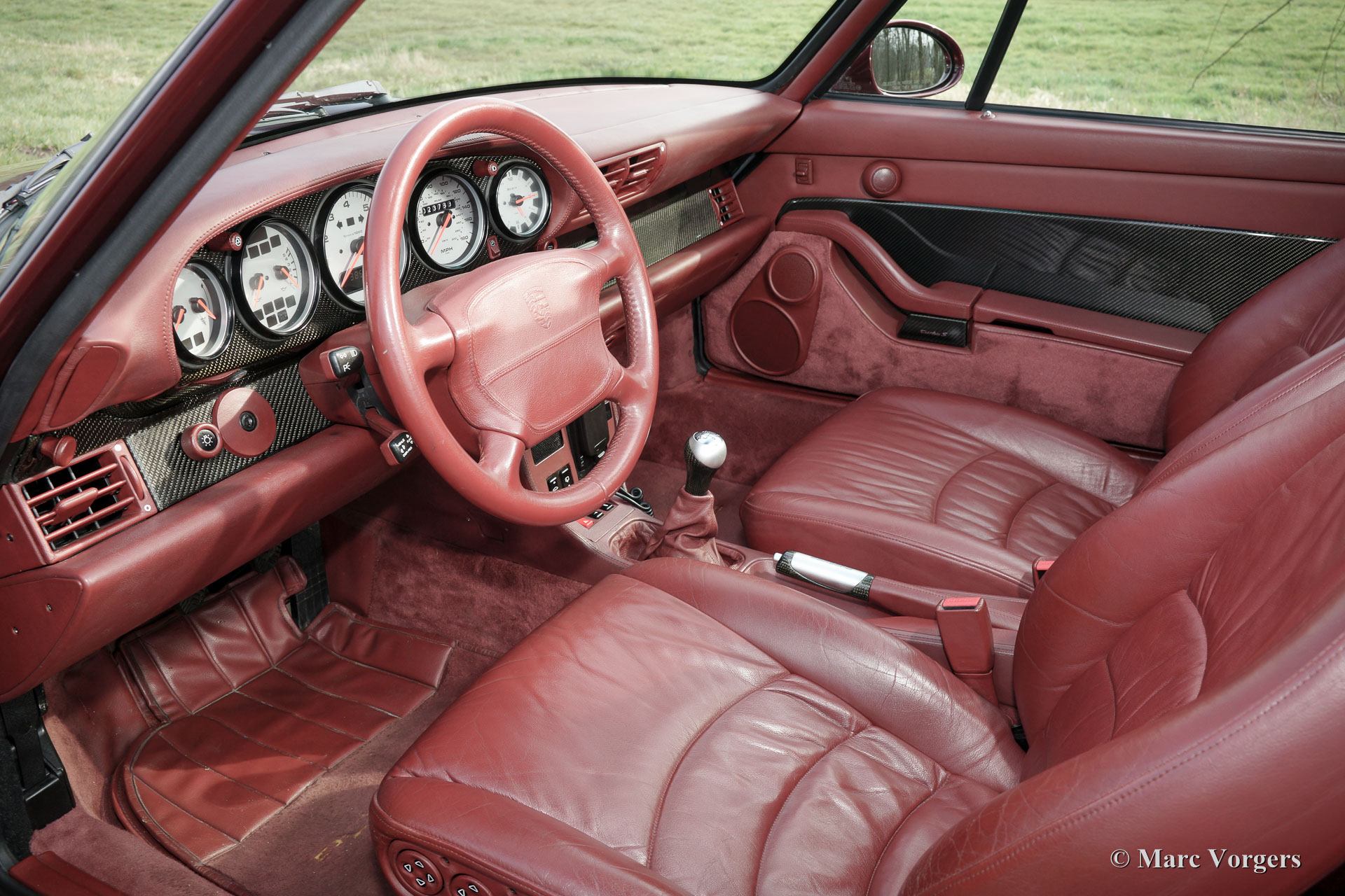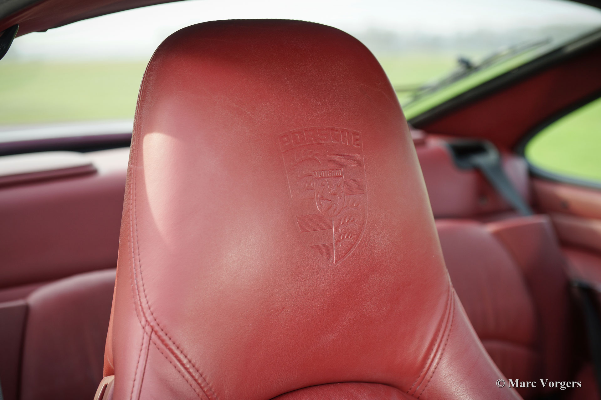 Porsche 911 (993) Turbo S, jaar 1997. Kleur Arenarood metallic (kleurcode L84S) met een Bordeauxrood vol-lederen interieur en hoofdsteunen met speciaal af fabriek aangebrachte Porsche logo’s.