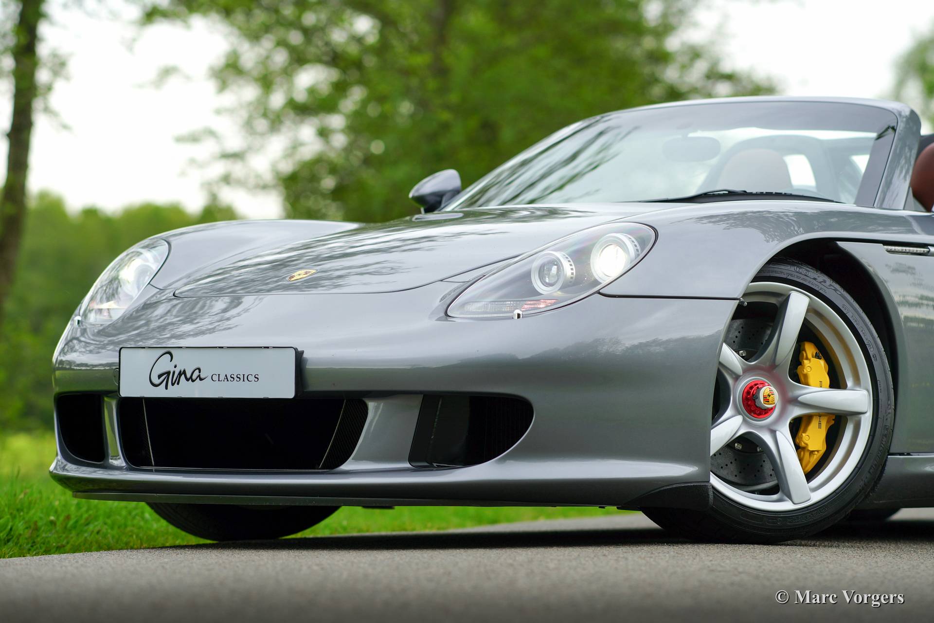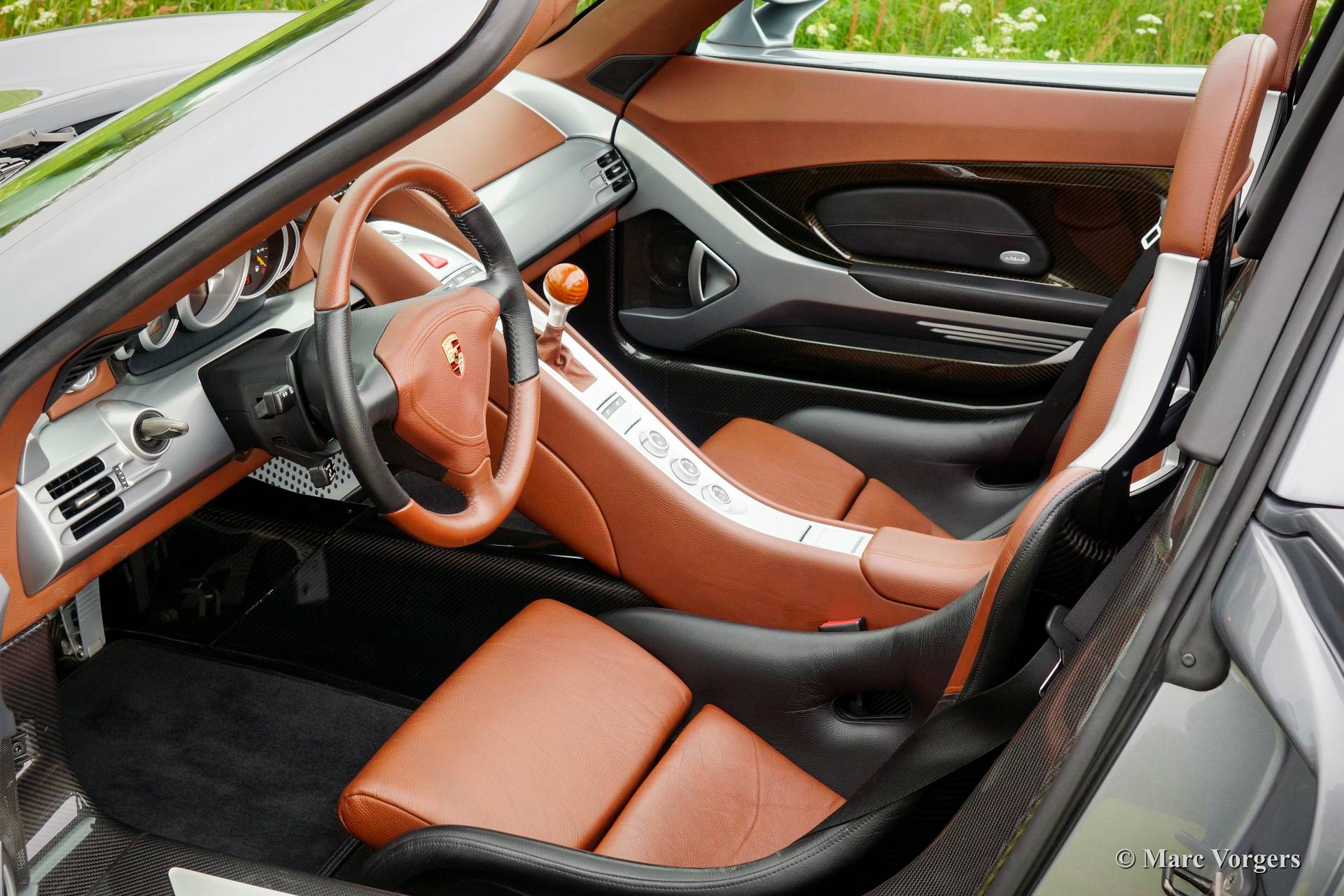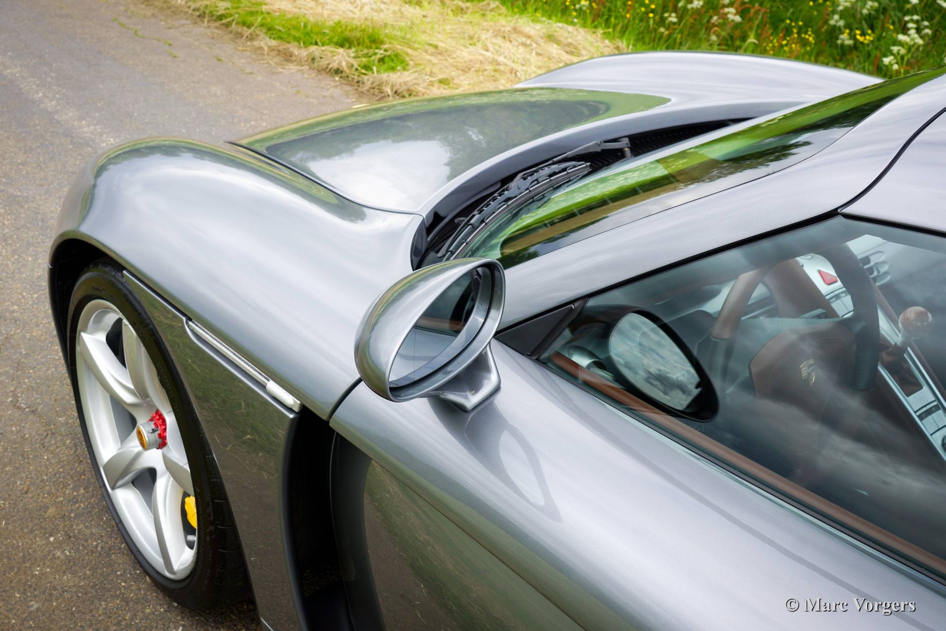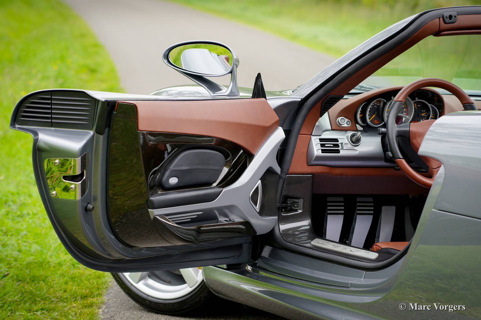 Porsche Carrera GT, bouwjaar december 2004. Kleur ‘Seal Grey’ (grijs metallic) met een tweekleurig lederen interieur in Ascot bruin met zwart. De Porsche Carrera GT is een zeer exclusieve super sport auto. Er werden slechts 1270 exemplaren gebouwd.