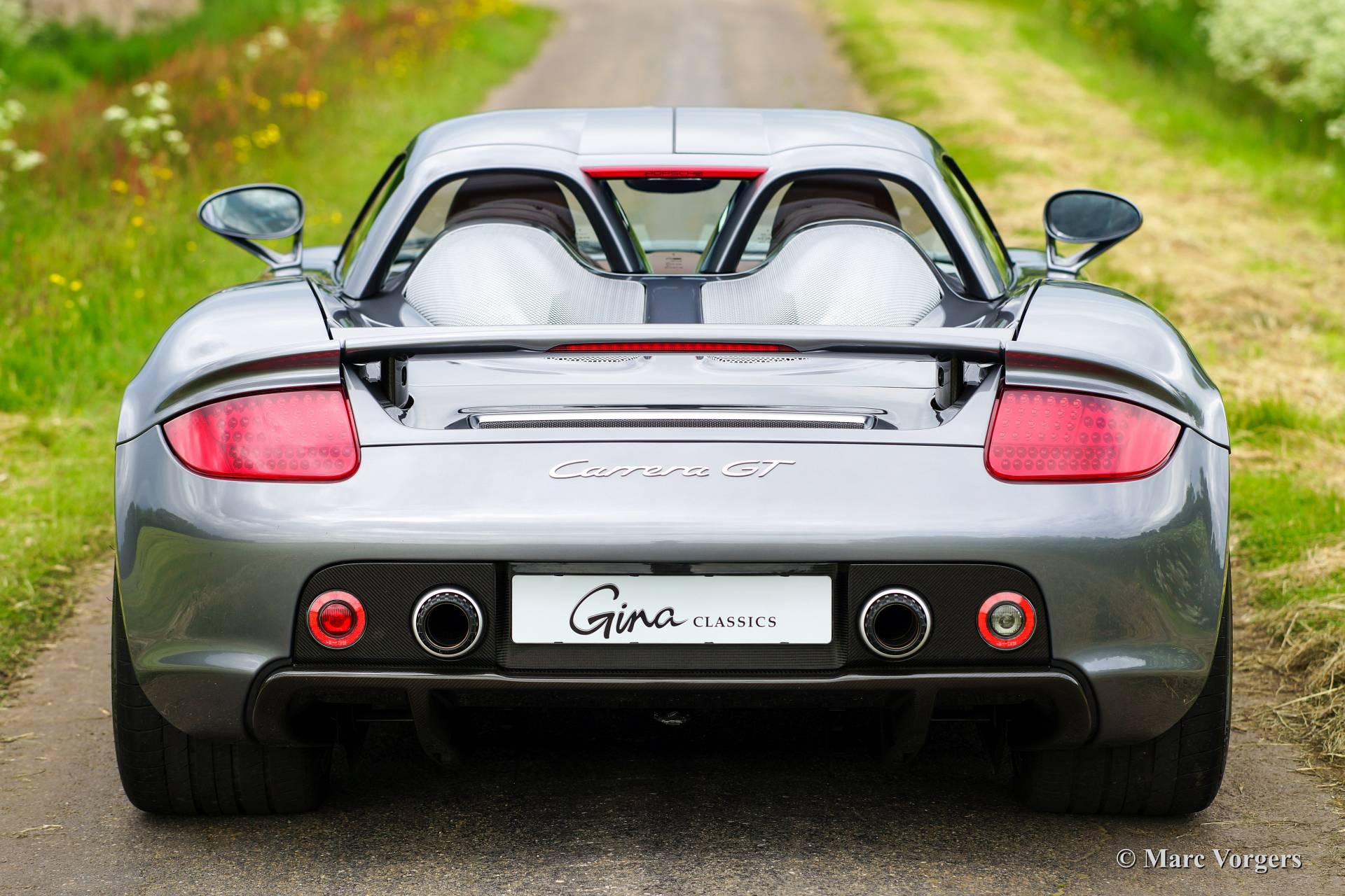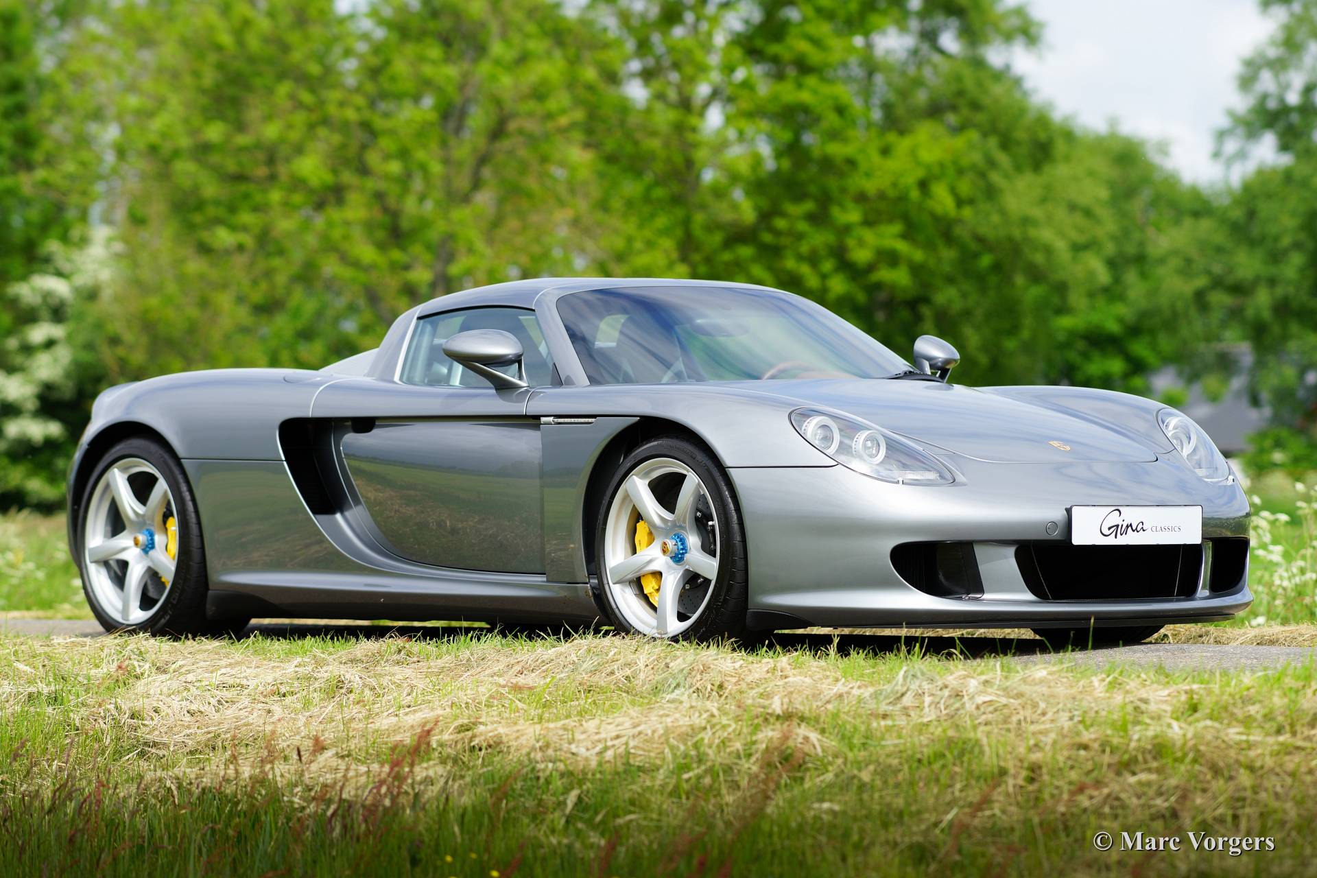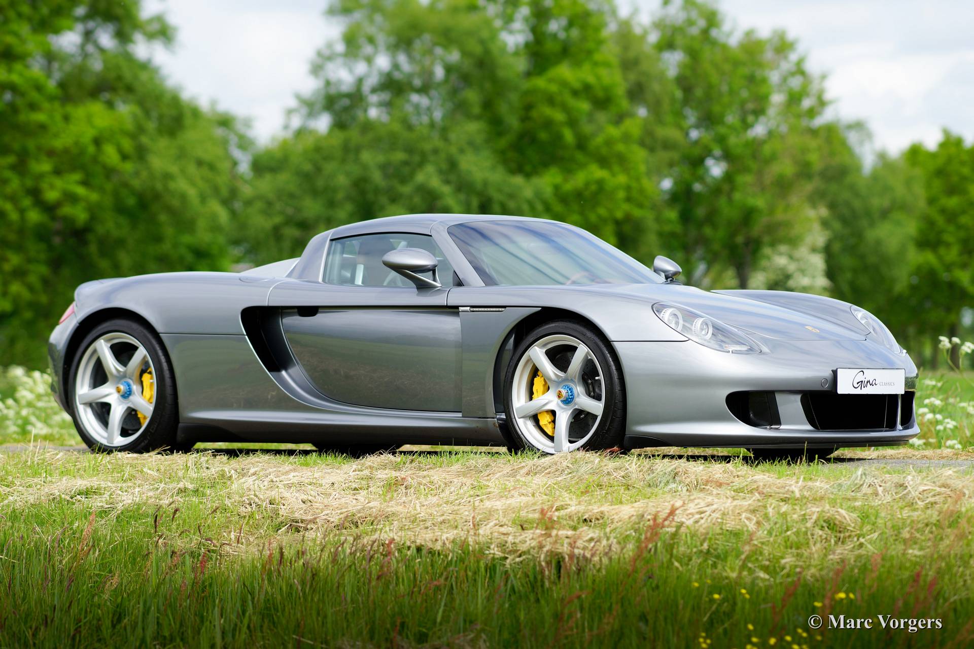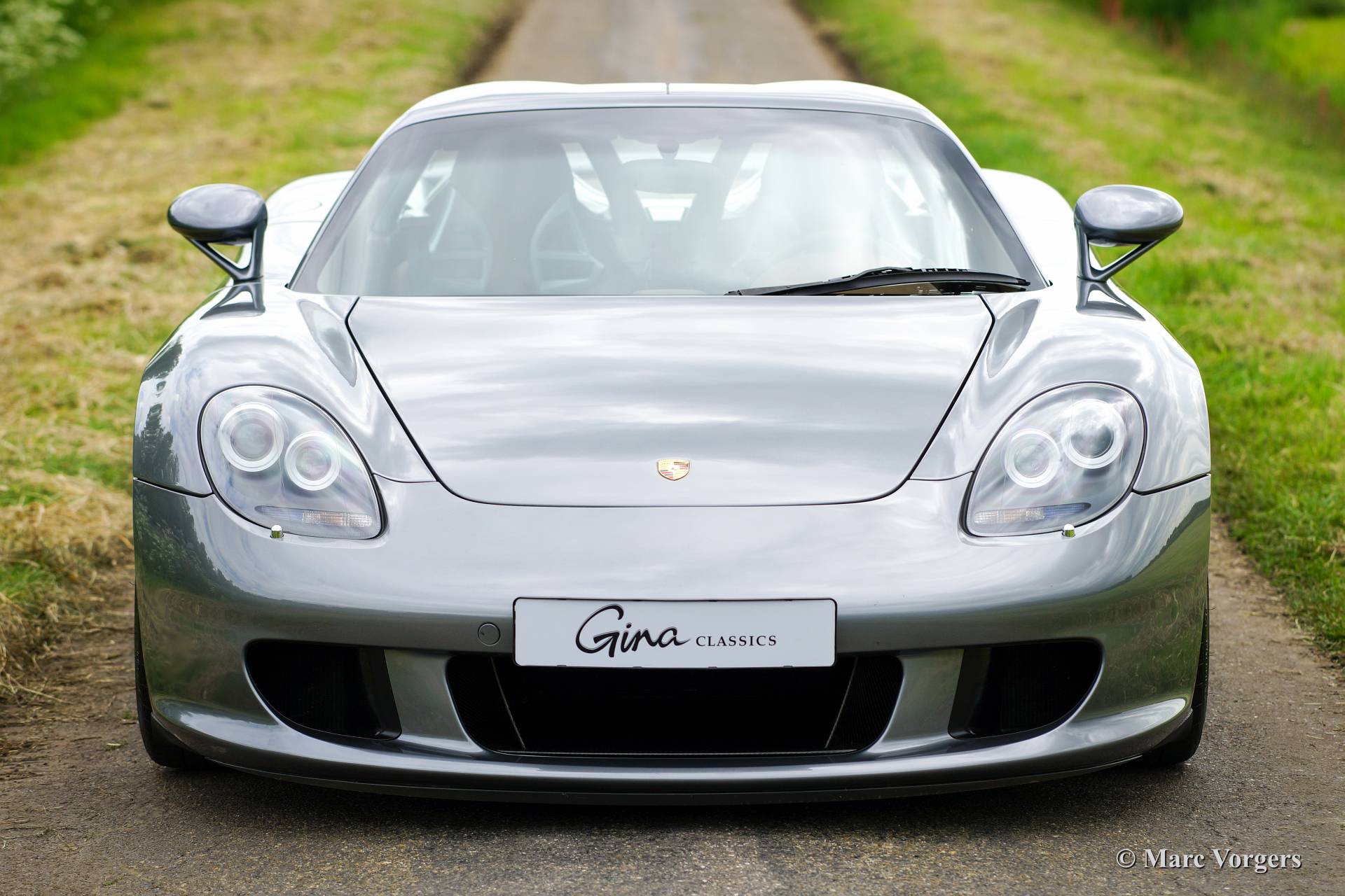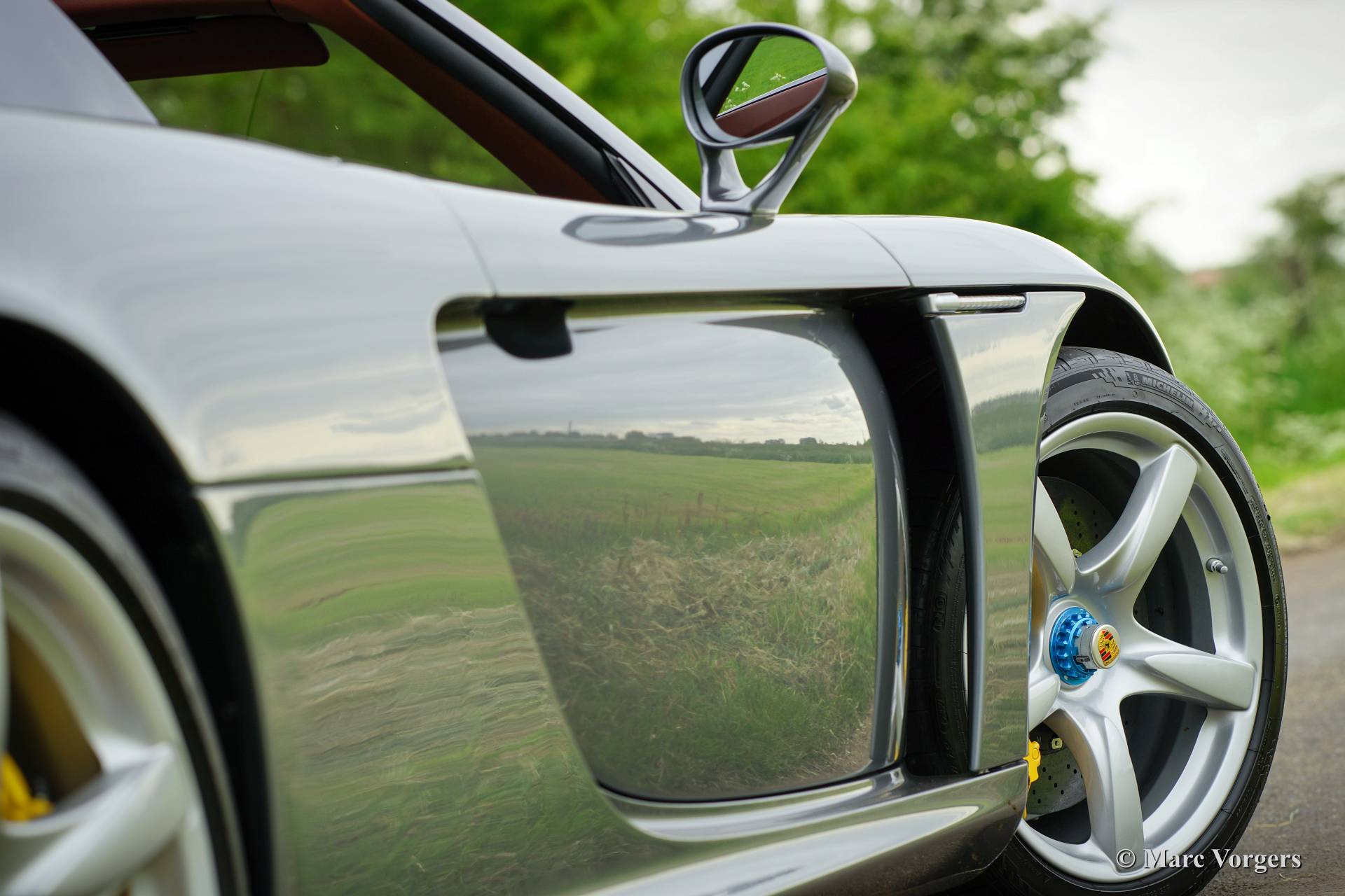Porsche Carrera GT, bouwjaar december 2004. Kleur ‘Seal Grey’ (grijs metallic) met een tweekleurig lederen interieur in Ascot bruin met zwart. De Porsche Carrera GT is een zeer exclusieve super sport auto. Er werden slechts 1270 exemplaren gebouwd.