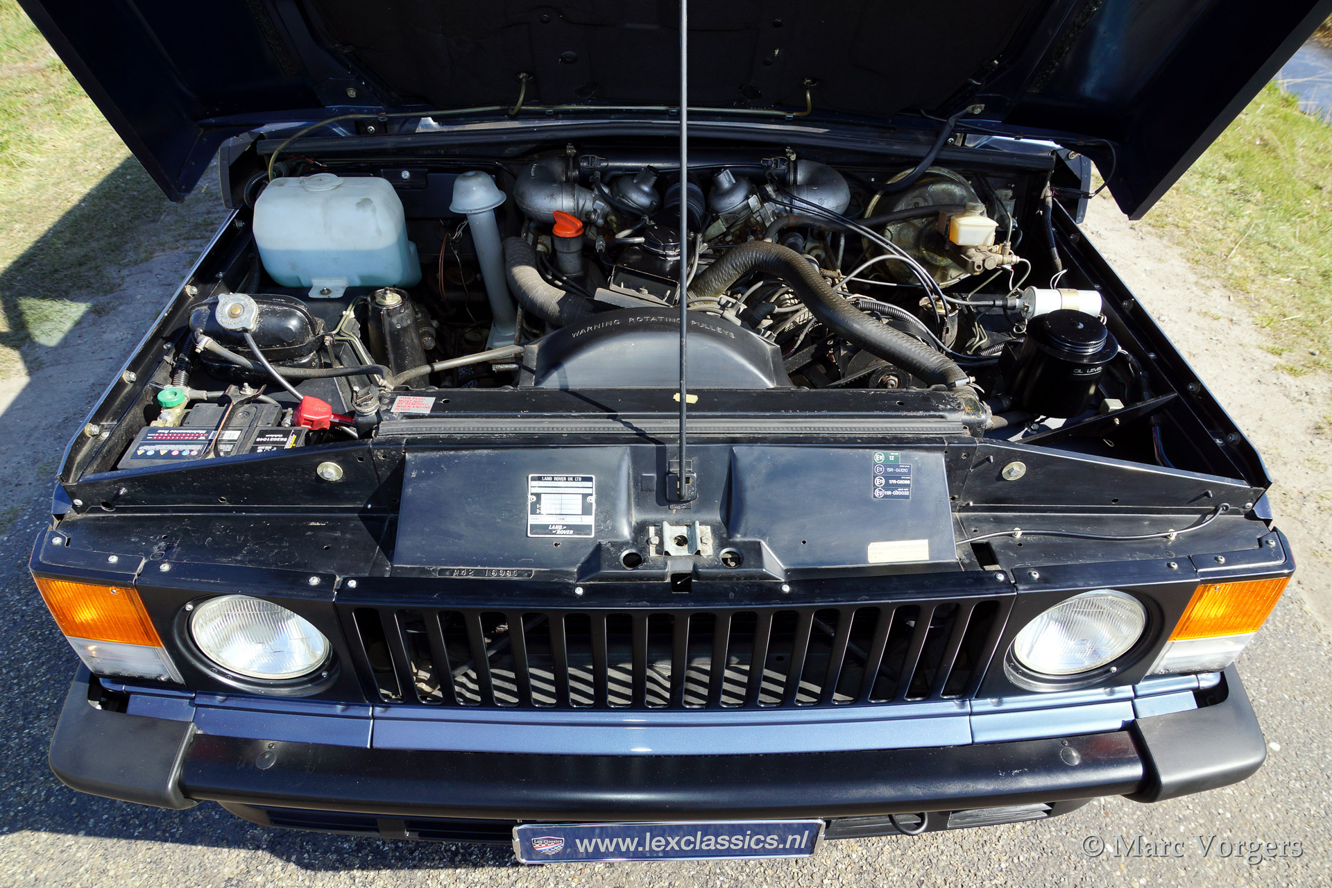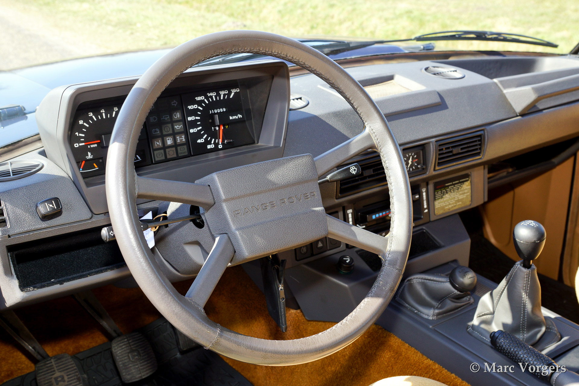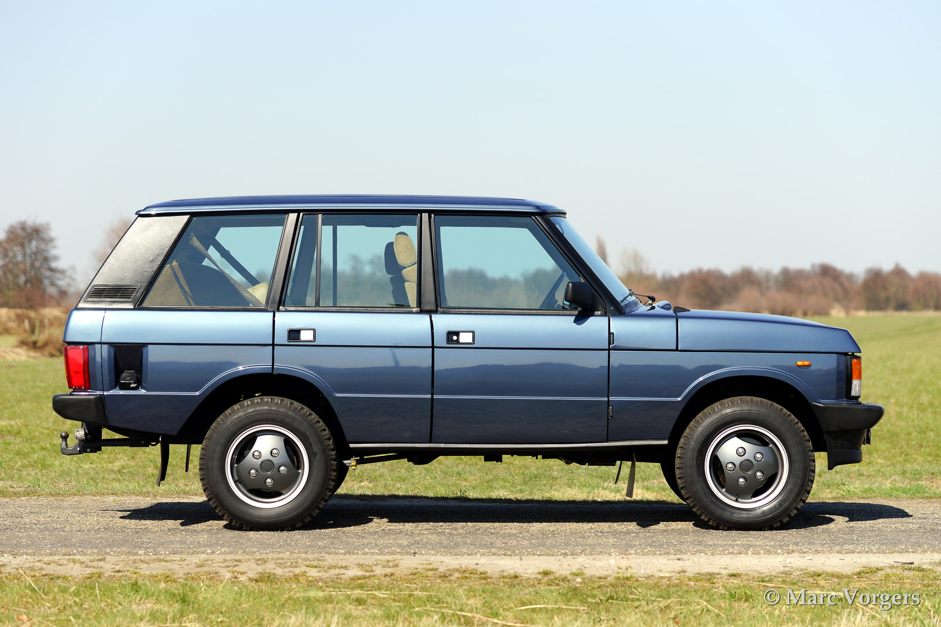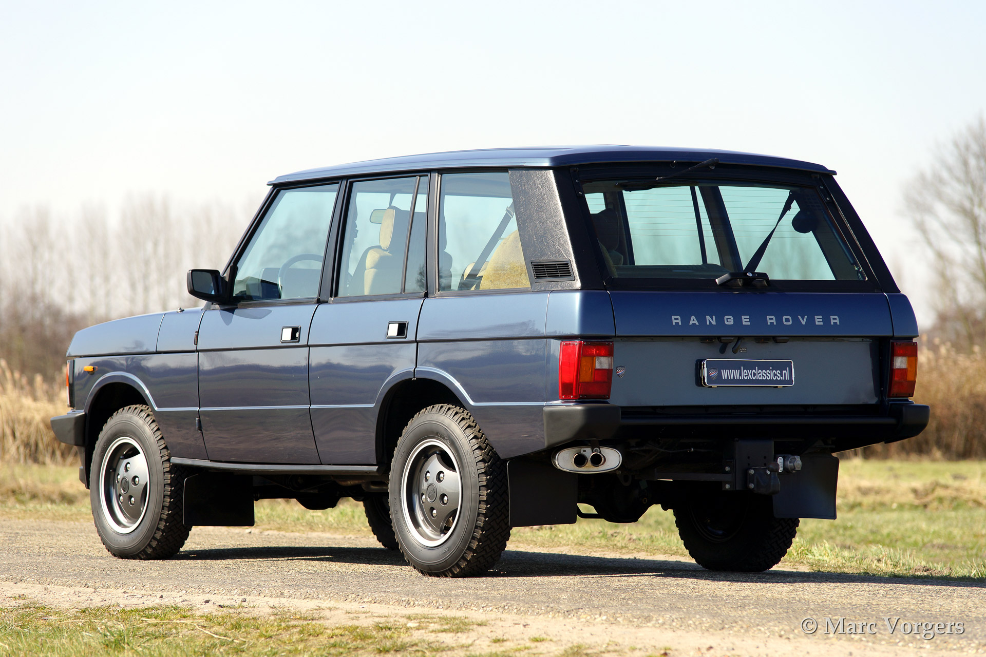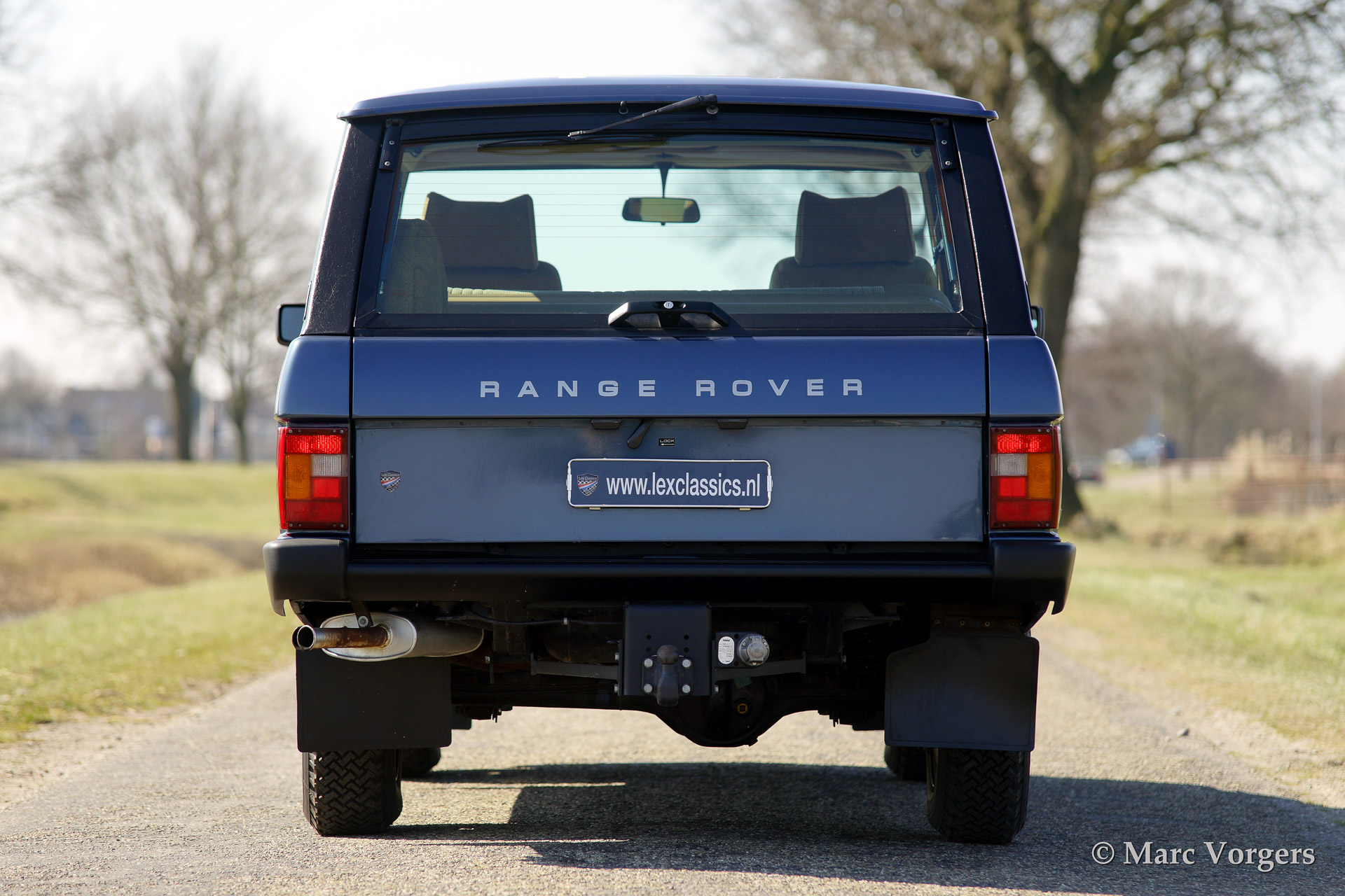 Range Rover classic, bouwjaar 1988. Kleur blauw metallic met een beige 'broque' interieur. De auto is voorzien van originele Range rover lichtmetalen wielen in carrosseriekleur.