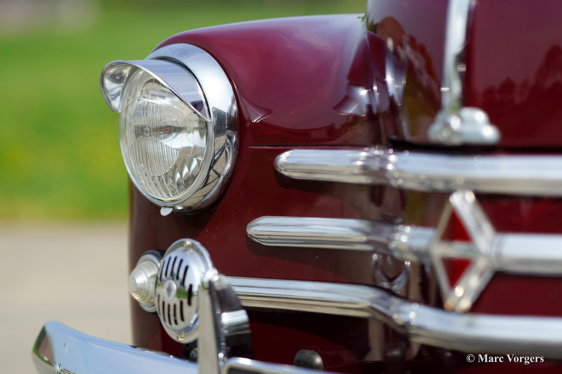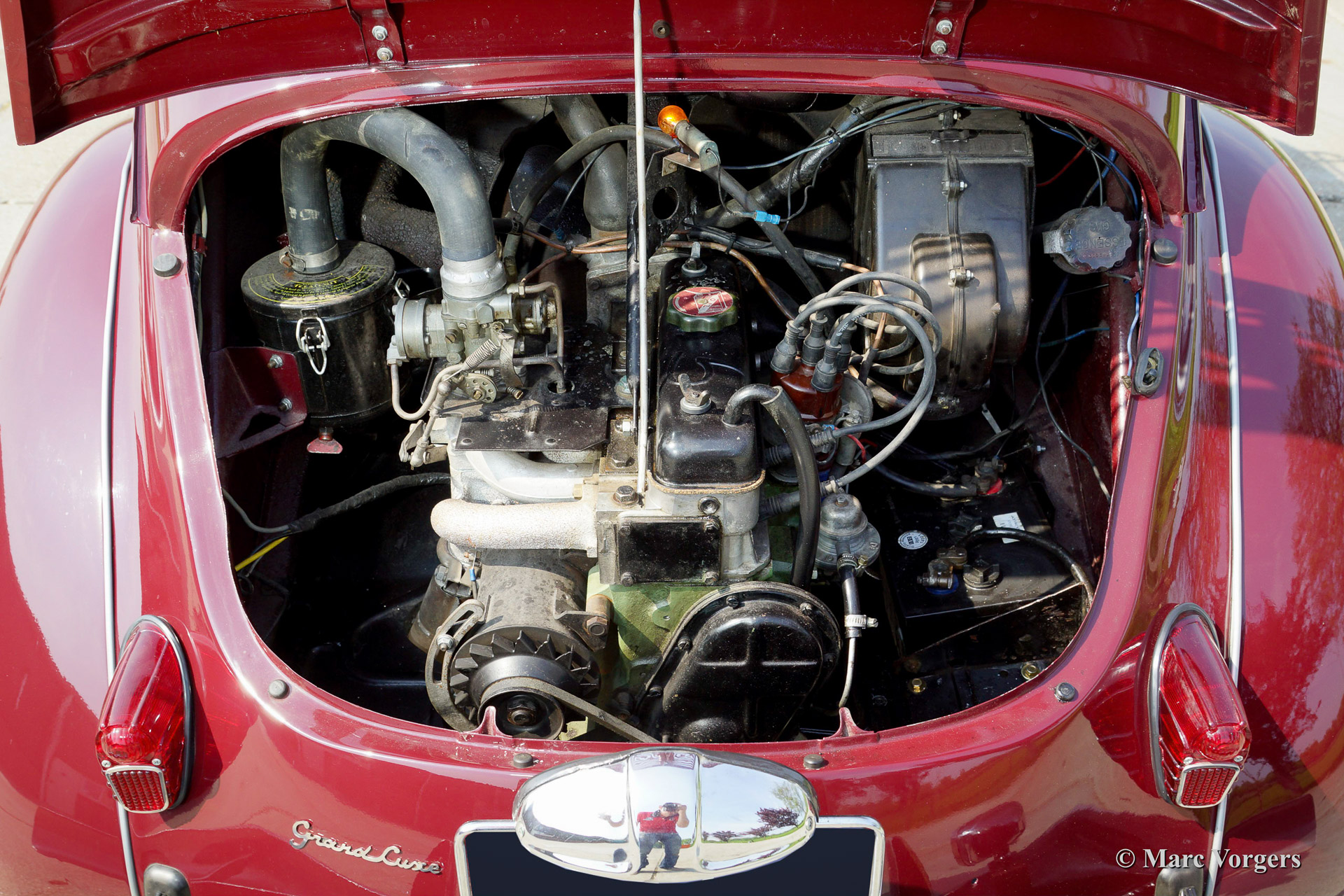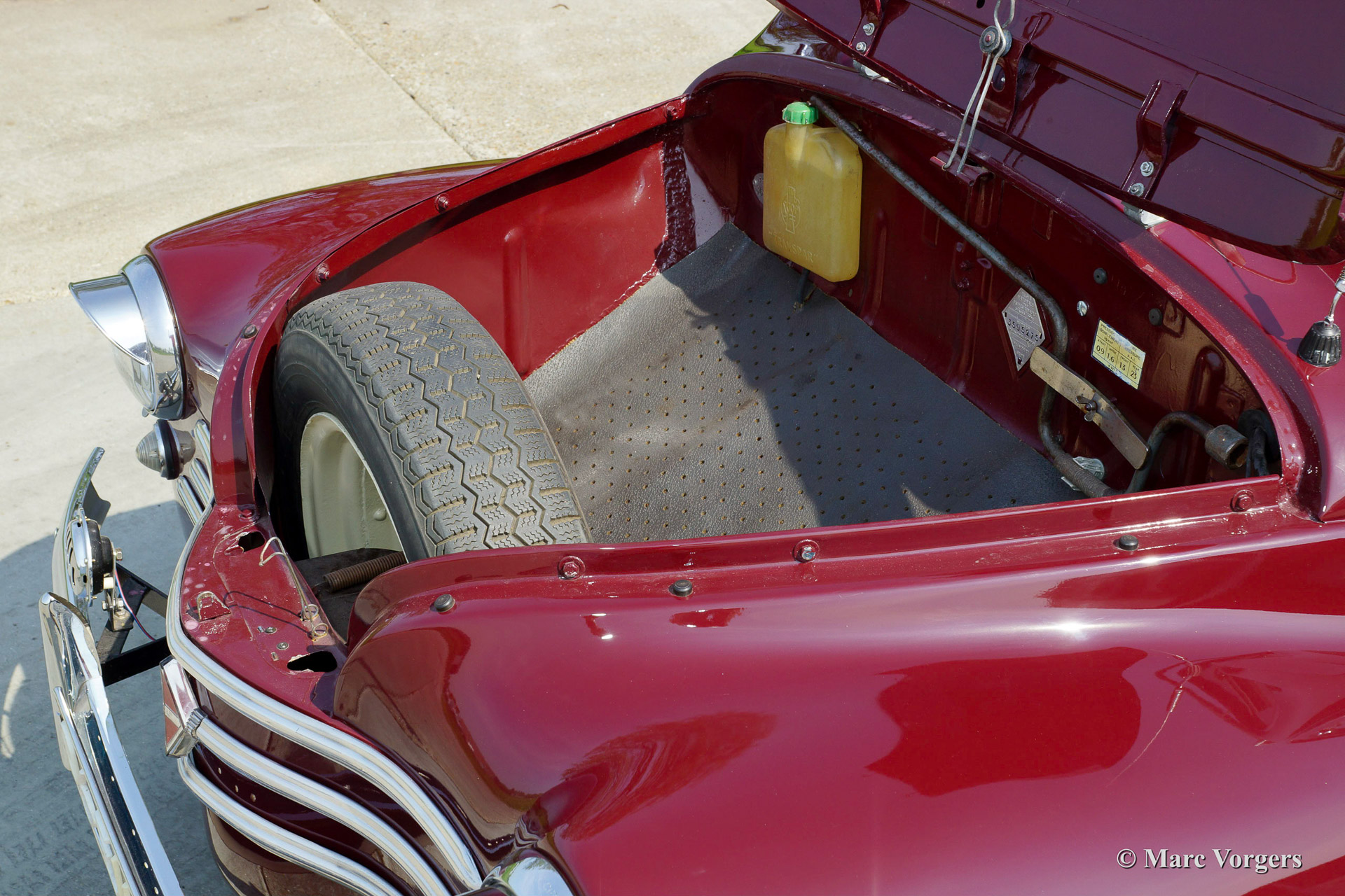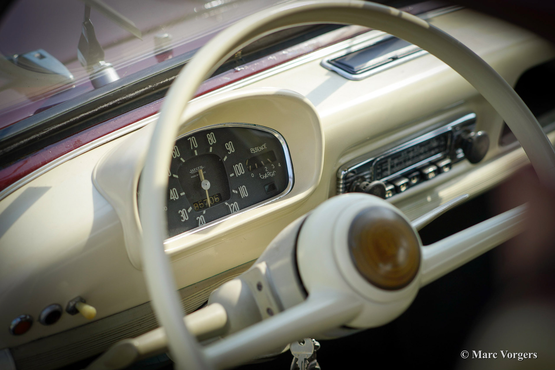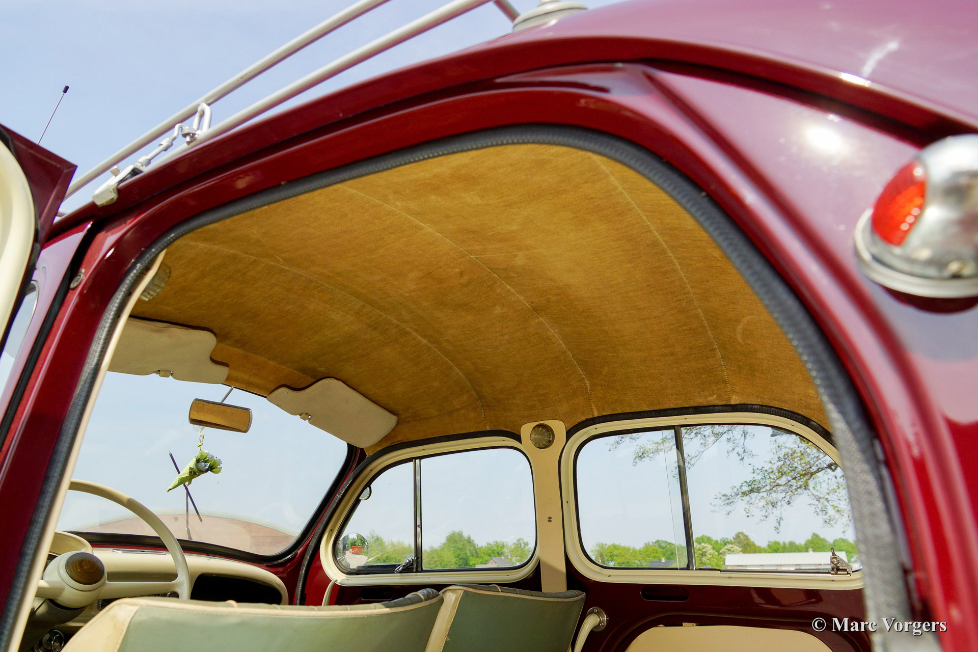 Renault 4 CV, bouwjaar 1958. Kleur Bordeaux rood met een grijs/crème vinyl interieur. Deze prachtige Renault 4 CV werd uitvoerig gerestaureerd met oog voor originaliteit; alle originele dalen werden behouden en gerestaureerd/gerepareerd. Deze Renault is uitgerust met een fraai afneembaar imperiaal en een mooie klassieke radio!