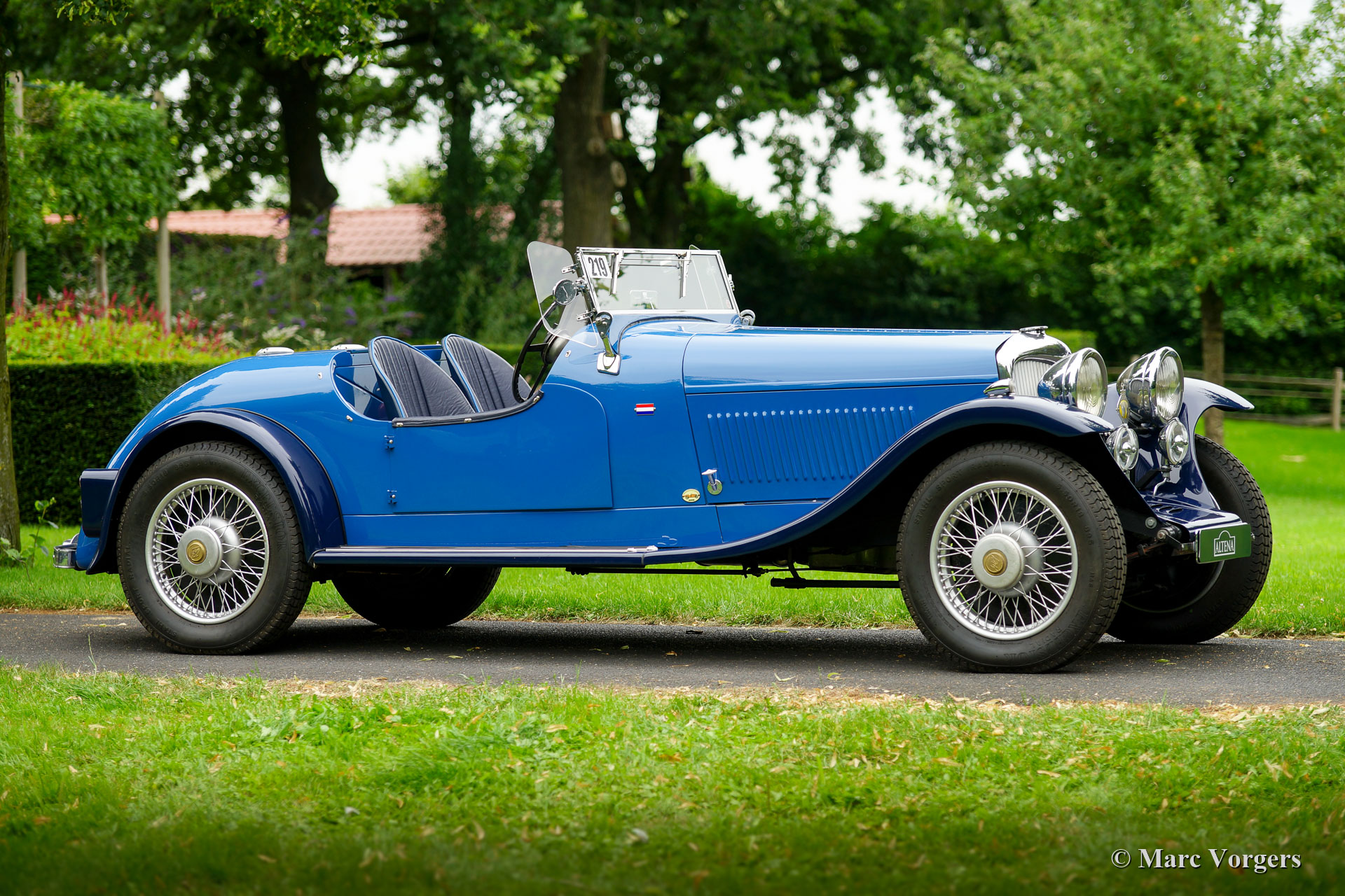 Riley 2.5 Litre ‘Big Four’ special, jaar 1937. Kleur, tweekleurig blauw met zilver gelakte spaakwielen. Donkerblauwe leren stoelen afgewerkt met blauwe biezen. Deze prachtige Riley special werd gebouwd op een van de beste vooroorlogse Riley chassis met de geweldige ‘Big Four’ viercilinder motor. De carrosserie is met de hand vervaardigd door een Nederlandse carrosseriebouwer naar wensen van de opdrachtgever. De mechaniek (motor en versnellingsbak) zijn gereviseerd door de firma van Giersbergen. Werkelijk alles is onder handen genomen en alles verkeert in sublieme conditie. Een fotoreportage van de bouw en de revisie is aanwezig. Deze Riley rijdt, stuurt schakelt en remt uitstekend. Sinds de bouw heeft deze bijzondere Riley special maximaal 3000 kilometer gereden. Deze automobiel kan in elk land worden toegelaten. Een begeerlijke en unieke Riley ‘Big Four’ special in sublieme conditie met een uitstekende prijs / kwaliteit verhouding!