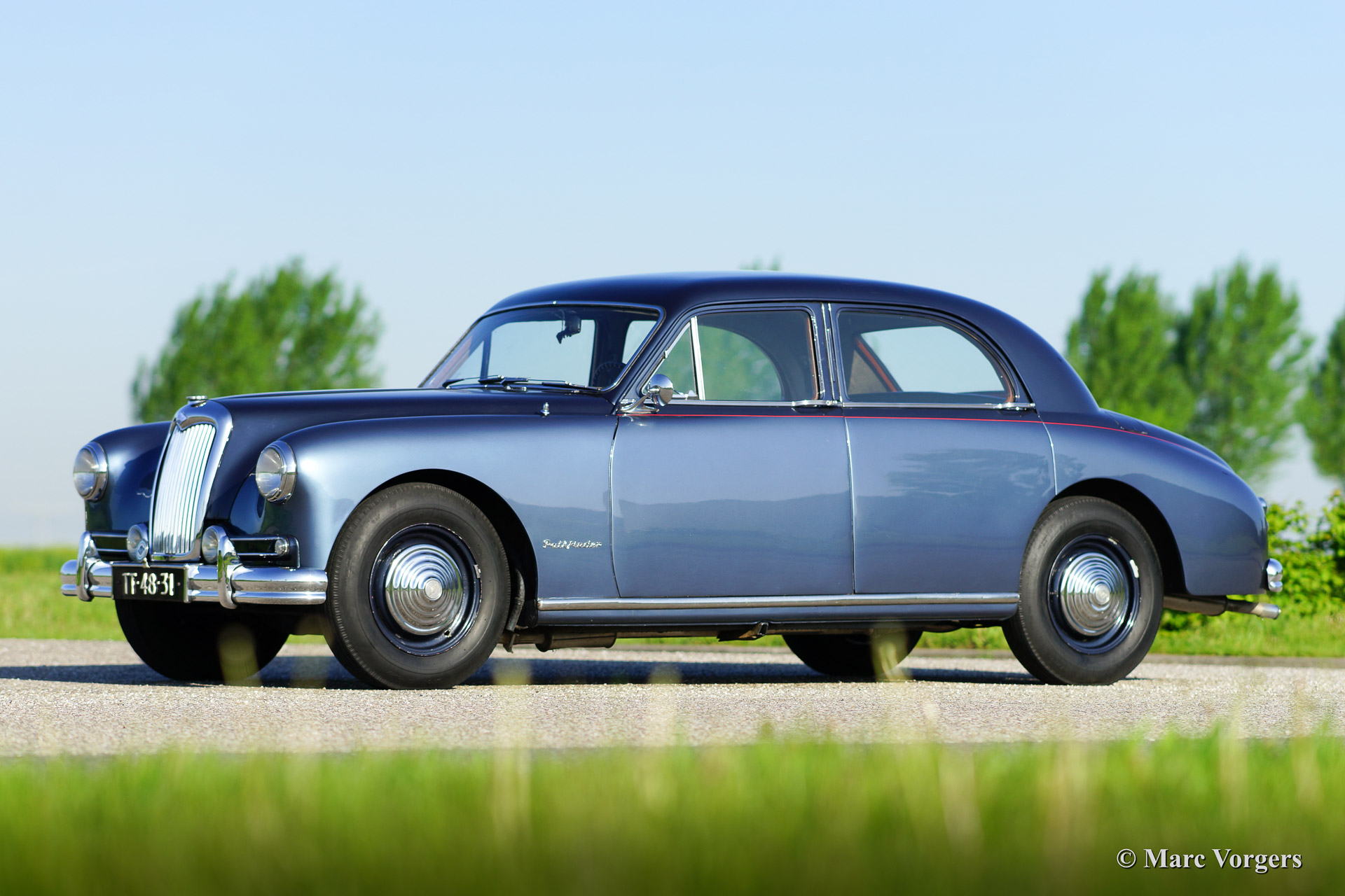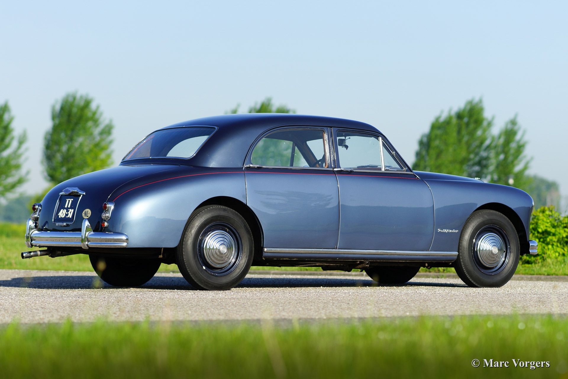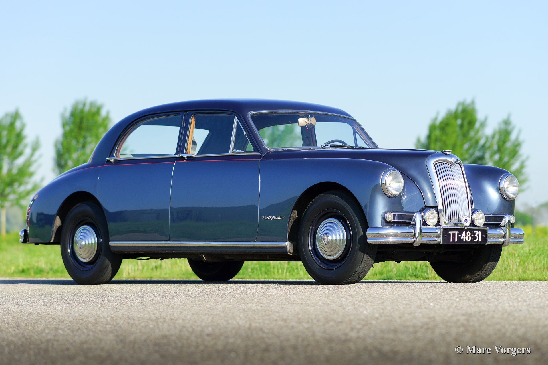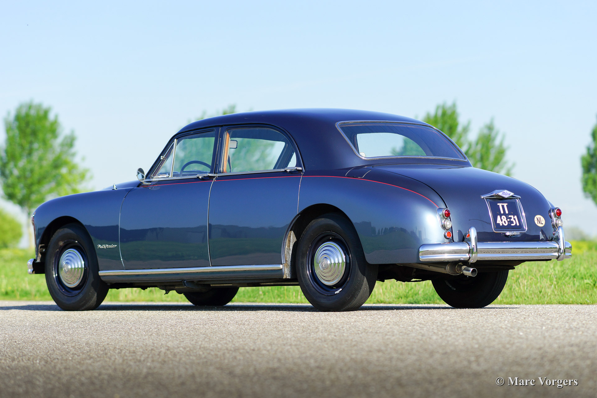 Riley Pathfinder, bouwjaar 1956. Chassisnummer 42XX, motornummer DP25R24XXX. Kleur ‘two-tone’ blauw metallic met een rode bies ‘pin-stripe’ over de flanken. Interieur lichtgrijs leder met blauw tapijt. Deze bijzondere en schaarse Riley Pathfinder werd nieuw verkocht in Nederland. De auto is afkomstig van de derde eigenaar. Alle voorgaande eigenaren evenals de historie zijn bekend. Van 1953 tot en met 1957 werden er 5152 exemplaren gebouwd. Bijzonder zijn de uitstekende Riley vier cilinder ‘twin cam’ motor, de linksgeplaatste schakelpook en het rijkelijk met hout beklede interieur. De automobiel verkeert in goede tot zeer goede staat. U zult niet snel een tweede Riley Pathfinder tegenkomen!