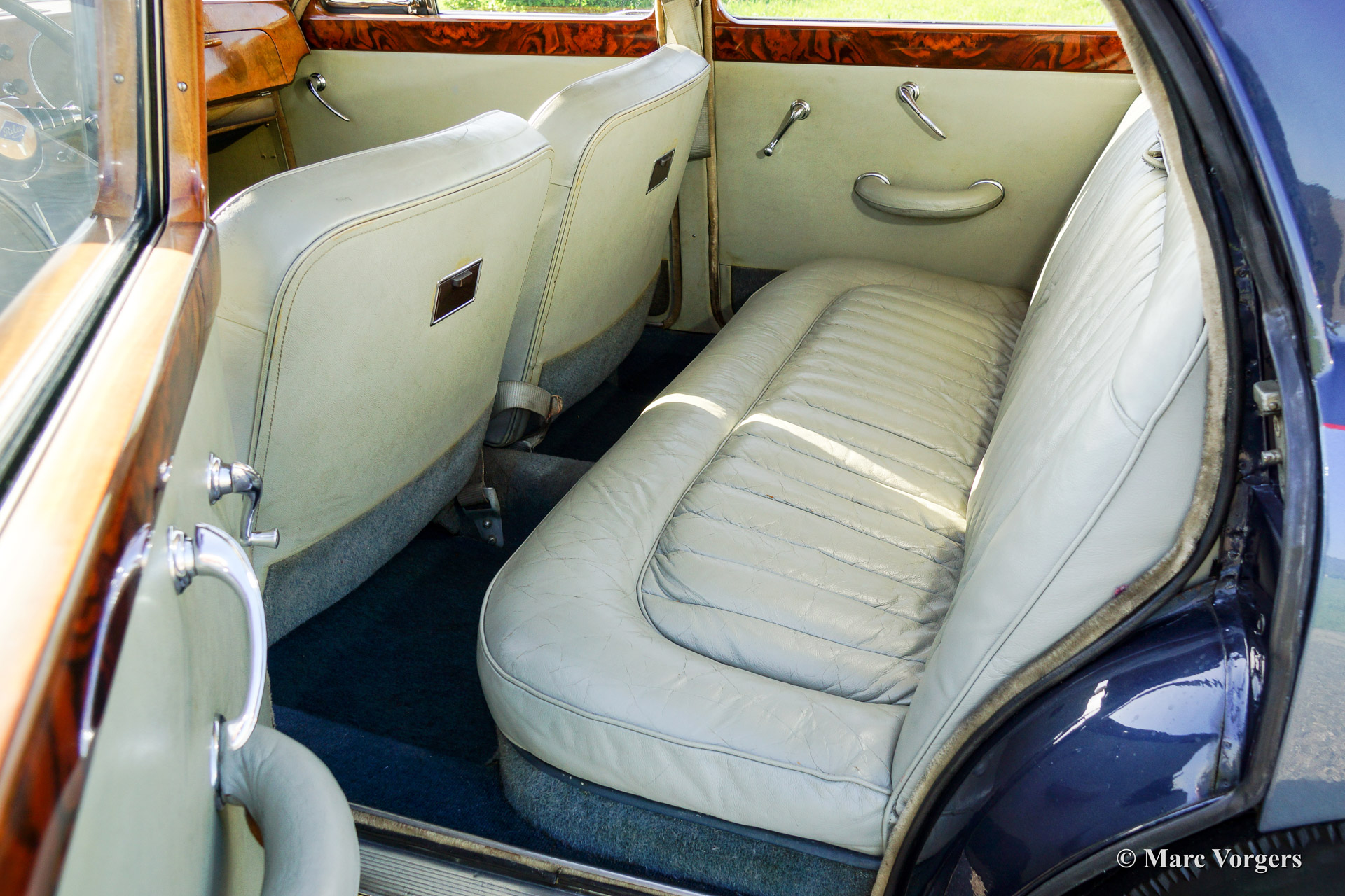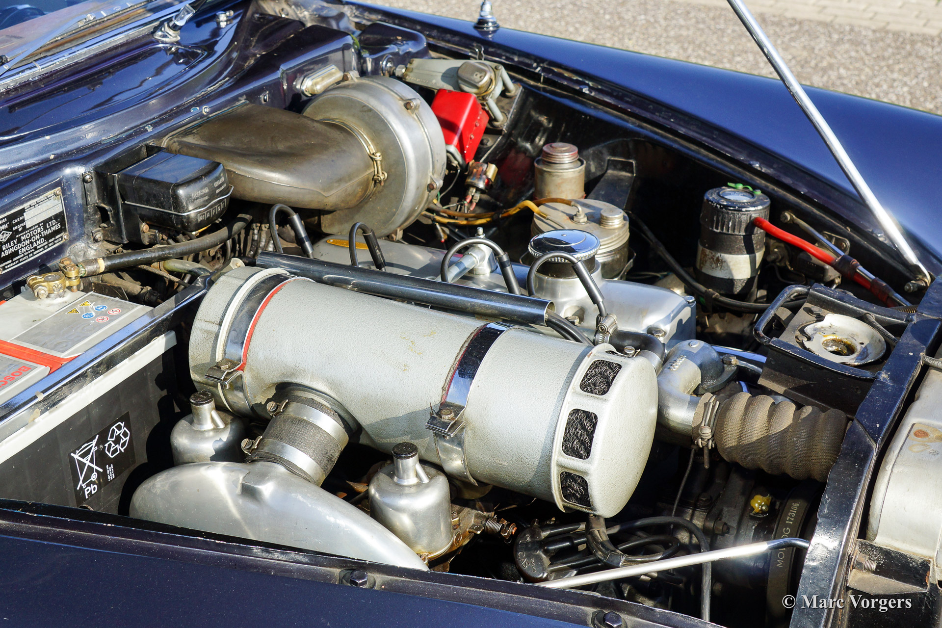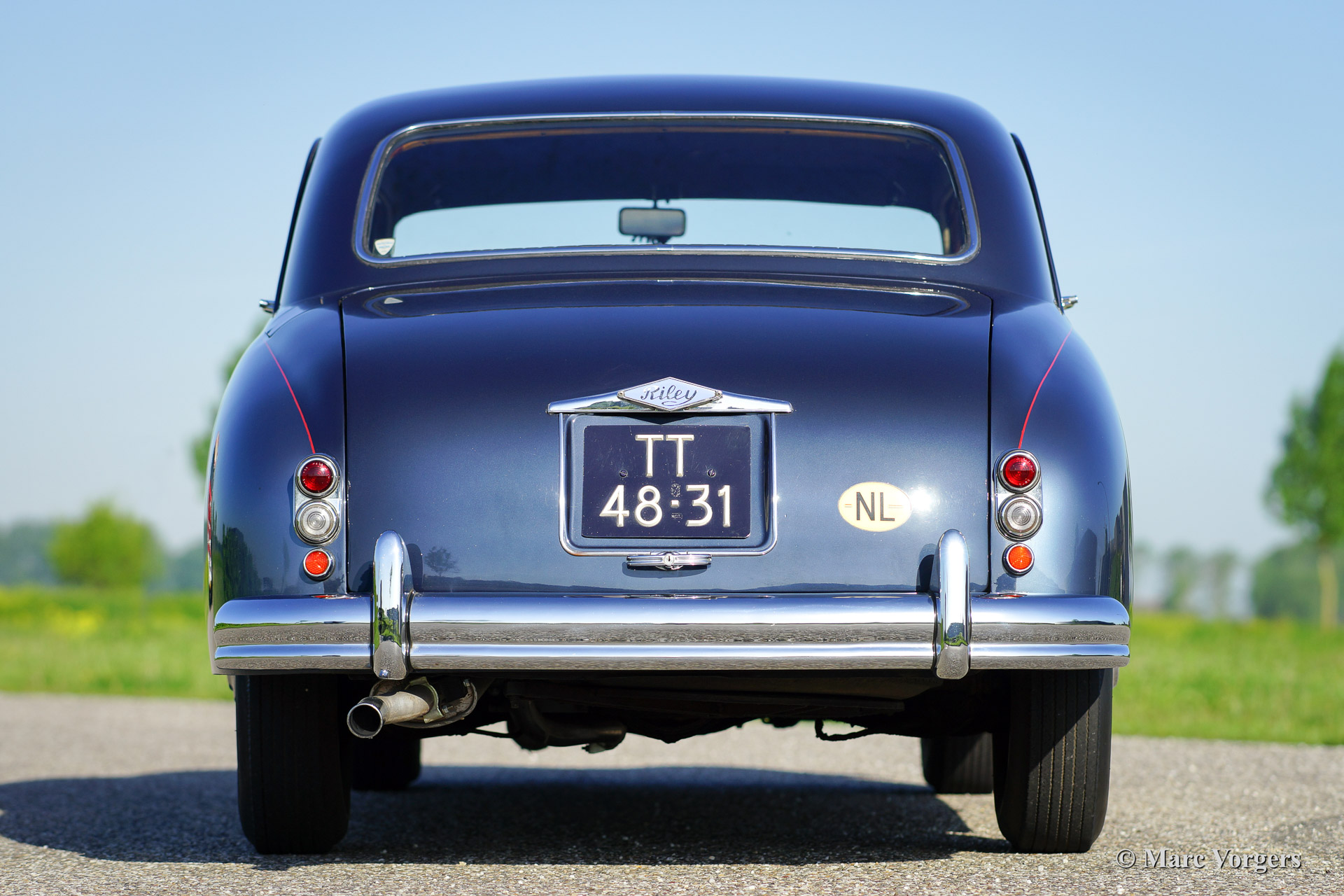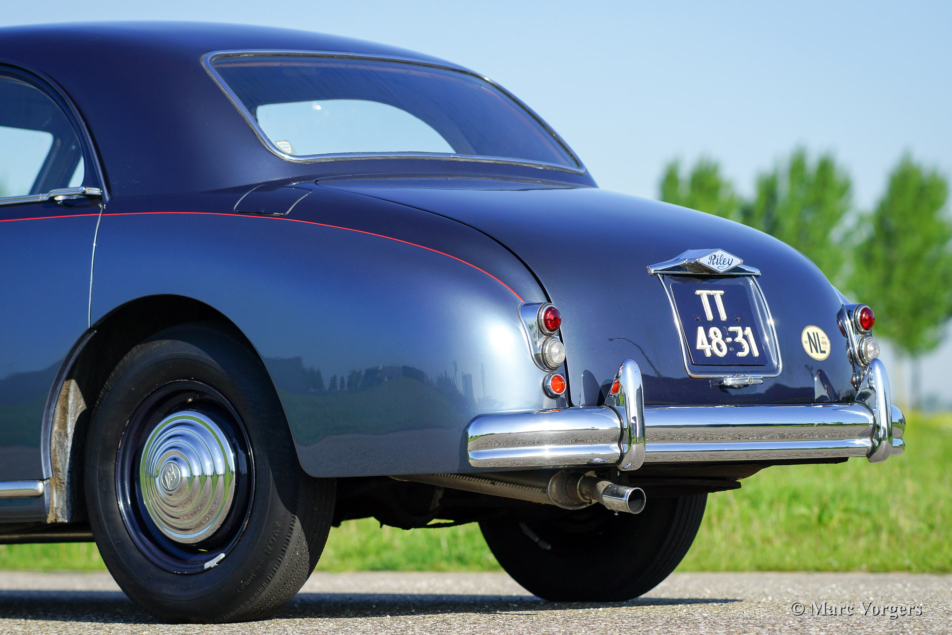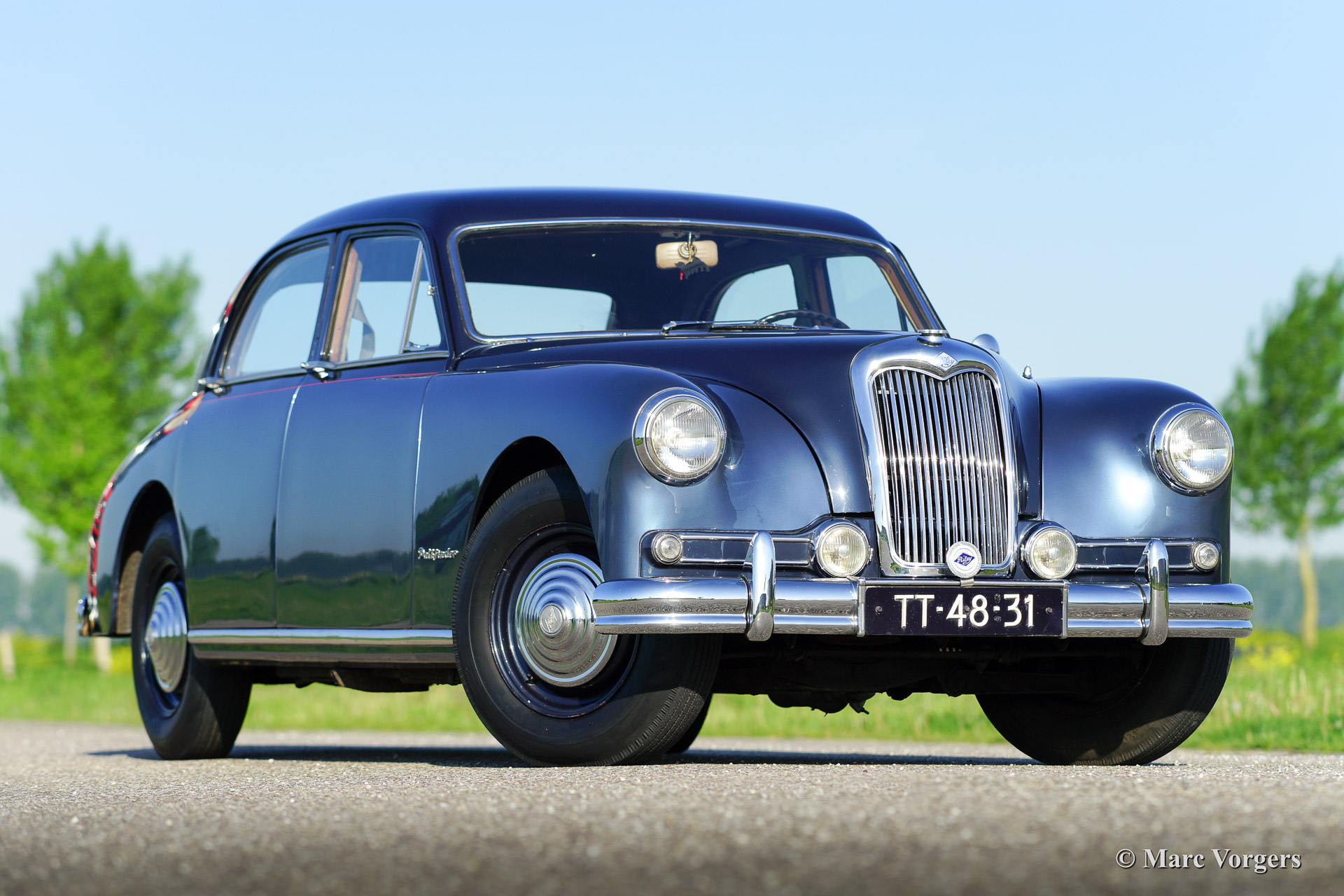 Riley Pathfinder, bouwjaar 1956. Chassisnummer 42XX, motornummer DP25R24XXX. Kleur ‘two-tone’ blauw metallic met een rode bies ‘pin-stripe’ over de flanken. Interieur lichtgrijs leder met blauw tapijt. Deze bijzondere en schaarse Riley Pathfinder werd nieuw verkocht in Nederland. De auto is afkomstig van de derde eigenaar. Alle voorgaande eigenaren evenals de historie zijn bekend. Van 1953 tot en met 1957 werden er 5152 exemplaren gebouwd. Bijzonder zijn de uitstekende Riley vier cilinder ‘twin cam’ motor, de linksgeplaatste schakelpook en het rijkelijk met hout beklede interieur. De automobiel verkeert in goede tot zeer goede staat. U zult niet snel een tweede Riley Pathfinder tegenkomen!