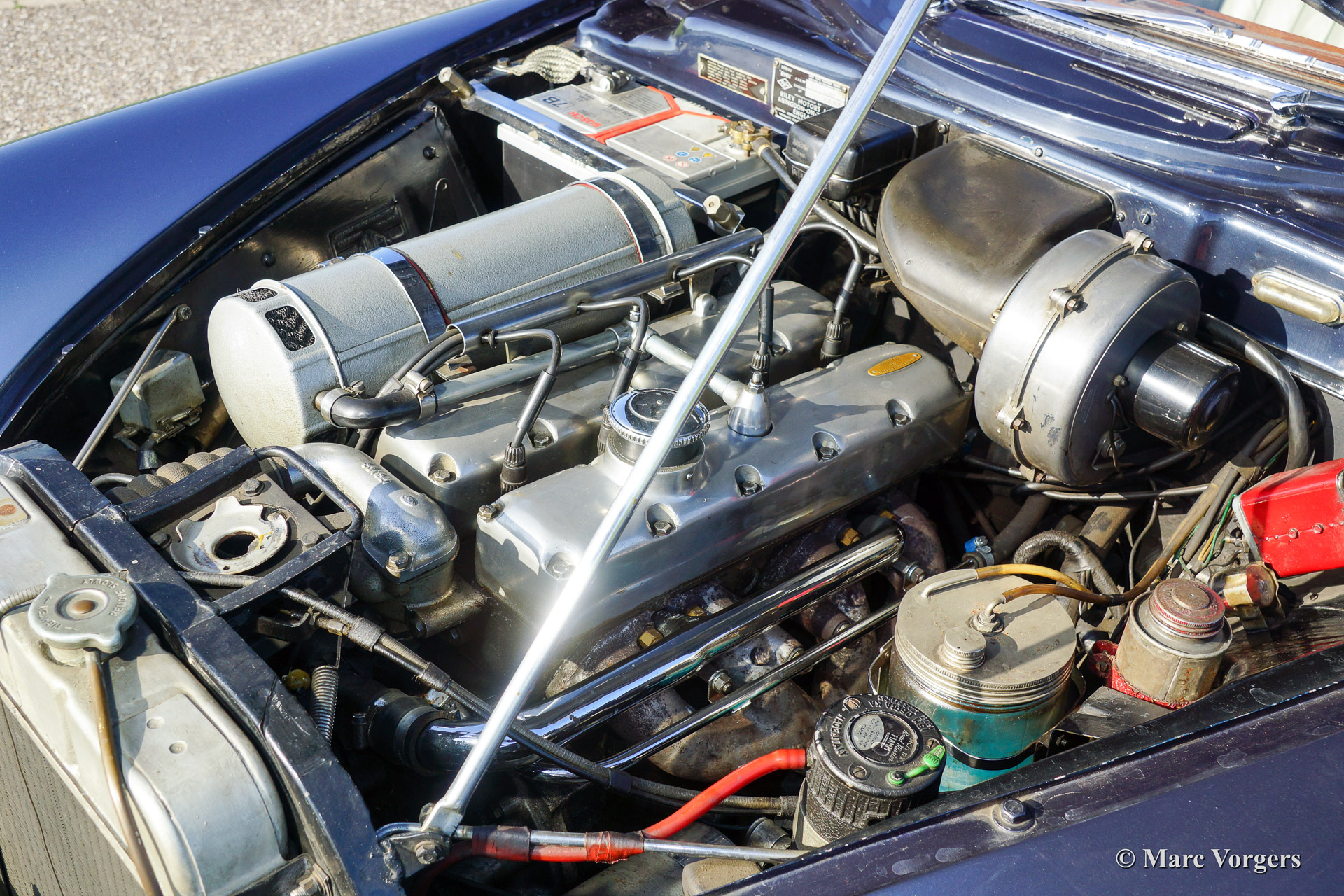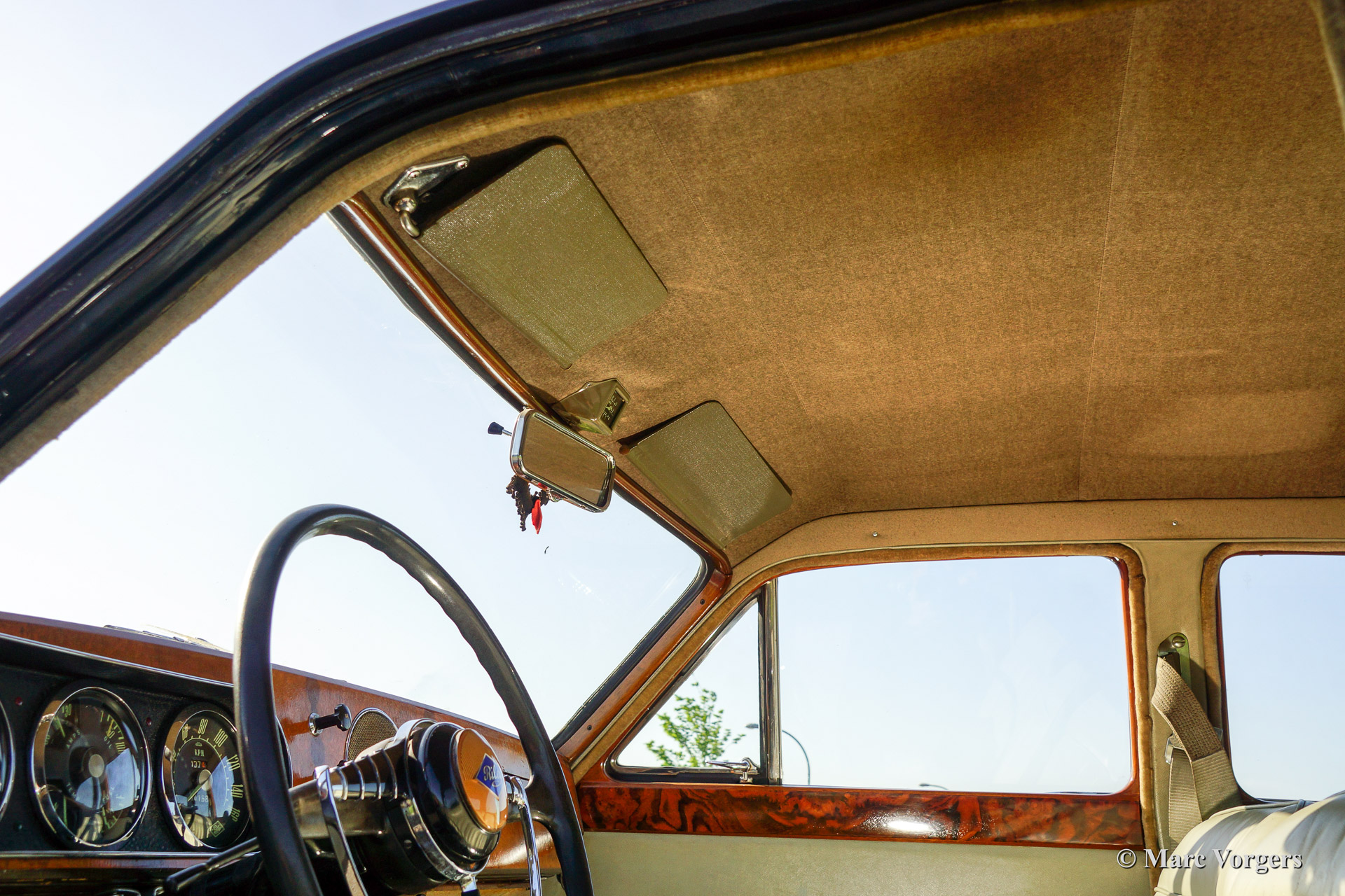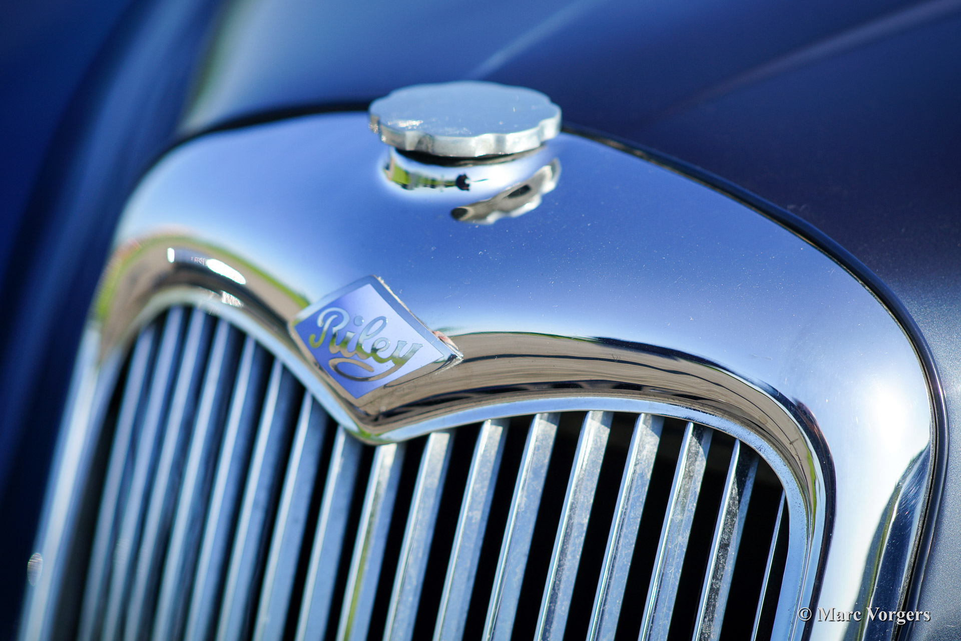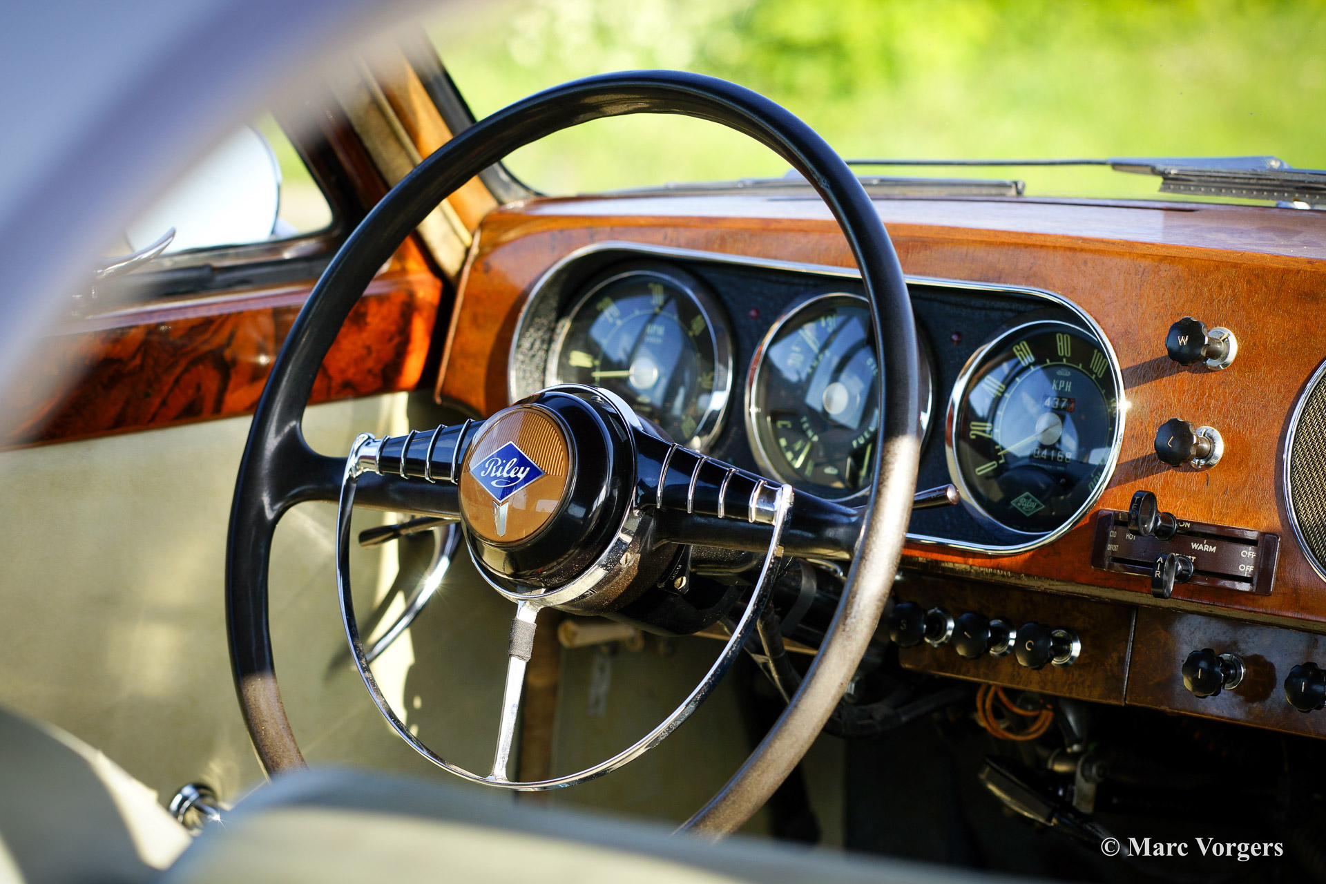Riley Pathfinder, bouwjaar 1956. Chassisnummer 42XX, motornummer DP25R24XXX. Kleur ‘two-tone’ blauw metallic met een rode bies ‘pin-stripe’ over de flanken. Interieur lichtgrijs leder met blauw tapijt. Deze bijzondere en schaarse Riley Pathfinder werd nieuw verkocht in Nederland. De auto is afkomstig van de derde eigenaar. Alle voorgaande eigenaren evenals de historie zijn bekend. Van 1953 tot en met 1957 werden er 5152 exemplaren gebouwd. Bijzonder zijn de uitstekende Riley vier cilinder ‘twin cam’ motor, de linksgeplaatste schakelpook en het rijkelijk met hout beklede interieur. De automobiel verkeert in goede tot zeer goede staat. U zult niet snel een tweede Riley Pathfinder tegenkomen!