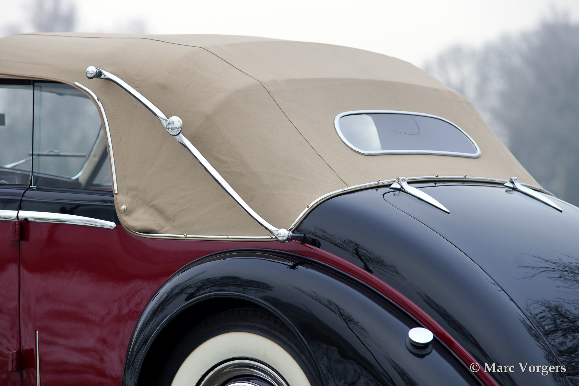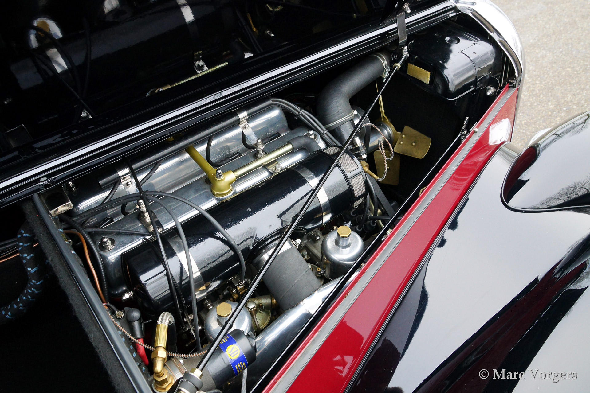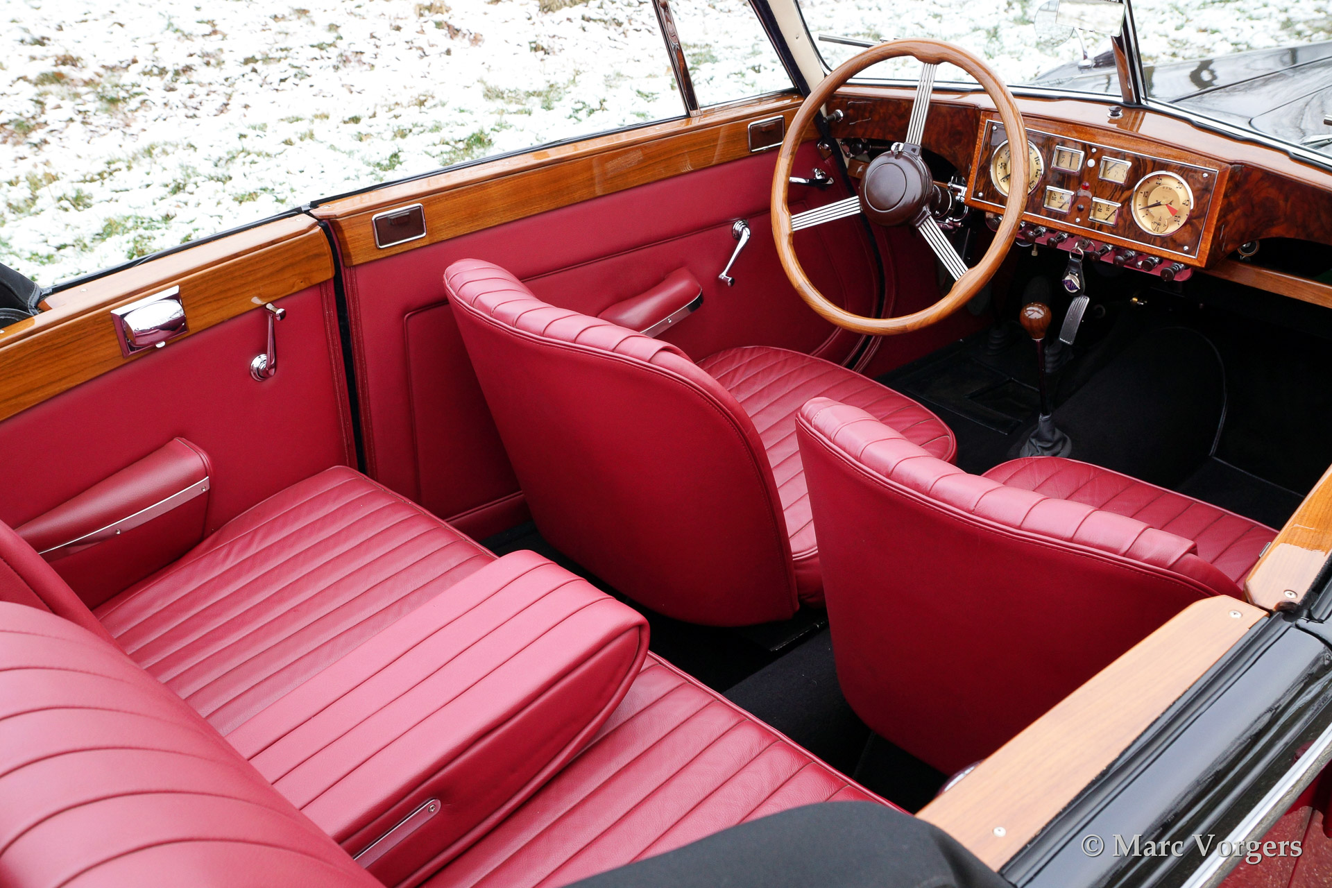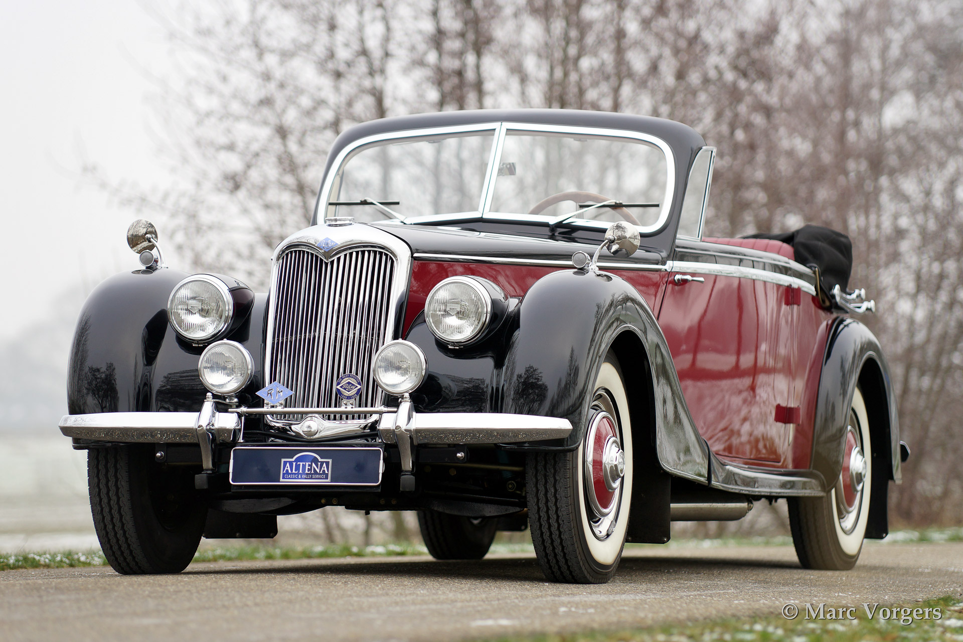 Riley RMD Drophead Coupe, bouwjaar 1951. Kleur two-tone, donker rood boven zwart. Rood lederen interieur met zwart tapijt. Beige cabrioletkap en een zwarte hood cover. Deze geweldige Riley is een van de slechts 502 gebouwde RMD Drophead Coupe modellen. De auto werd naar concoursstaat gerestaureerd. Een bijzonder fraaie vier-persoons 'tourer' met een oogstrelend dashboard, een fraai werkende cabrioletkap en bijzonder mooie 'frameloze' neerdraaibare zijramen.
