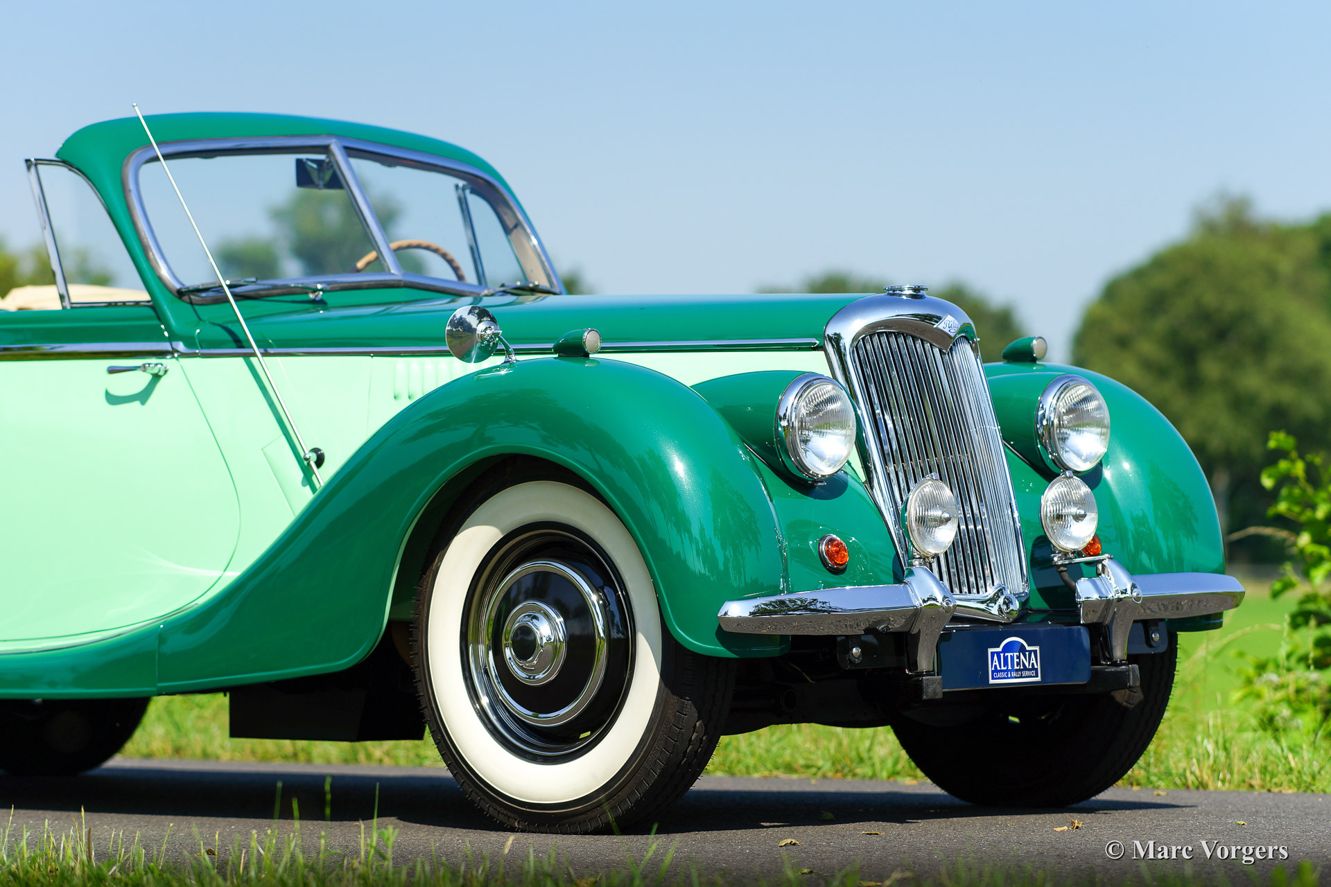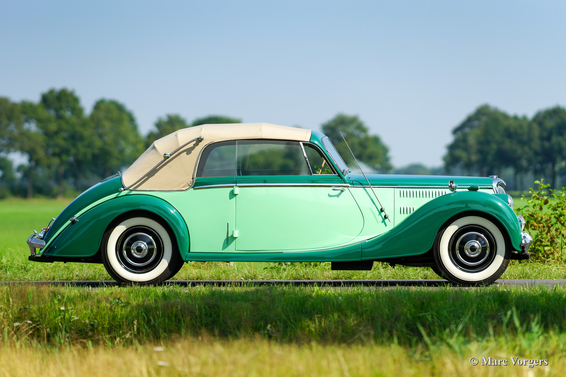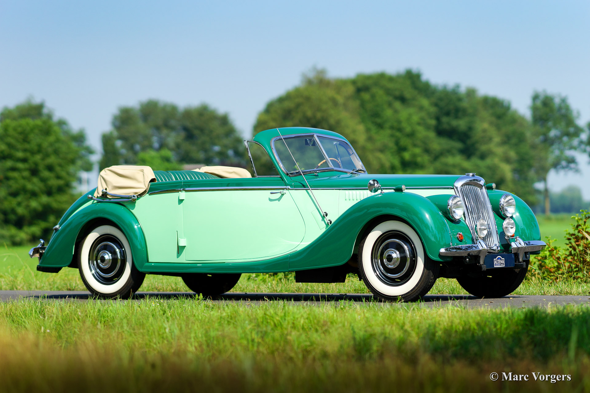 Riley RMD Drophead Coupe, bouwjaar 1951. Chassisnummer 60F72XX. Kleur 'two-tone', groen/lichtgroen. Groen lederen interieur met groen tapijt. Beige cabrioletkap en hood cover. Deze geweldige Riley is een van de slechts 502 ooit gebouwde RMD Drophead Coupe modellen. De automobiel werd in het verleden uitvoerig gerestaureerd. Deze linksgestuurde Riley RMD DHC verkeert in sublieme topstaat en de auto is een genot om te rijden! Een geweldige vierpersoons cabriolet met een bijzonder fraai houten dashboard, een 'period' radio, een eenvoudig te bedienen cabrioletkap en 'frameloze' op- en neerdraaibare zijruiten. Zeldzaam, prachtig gerestaureerd en exclusief. Zowaar nog binnen het bereik van de ware liefhebber.