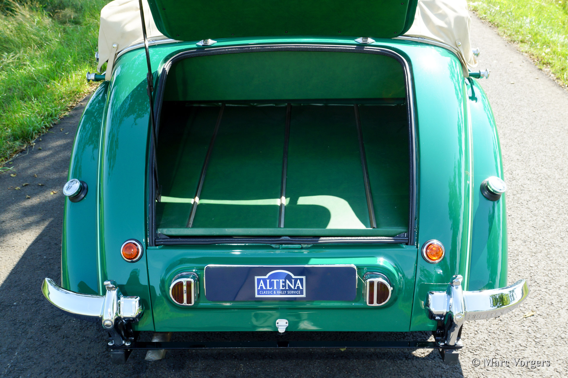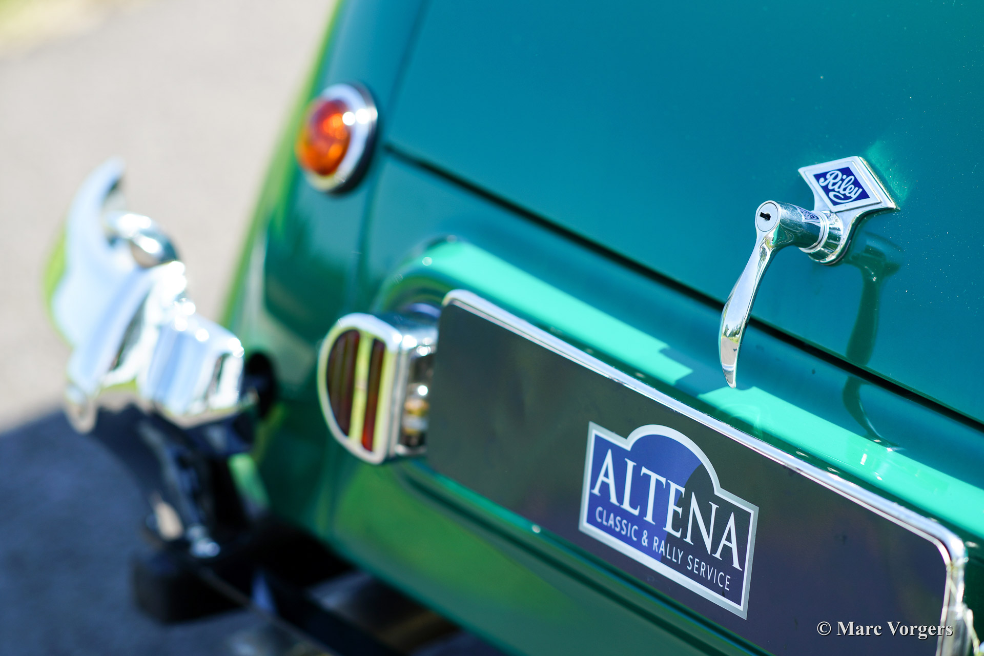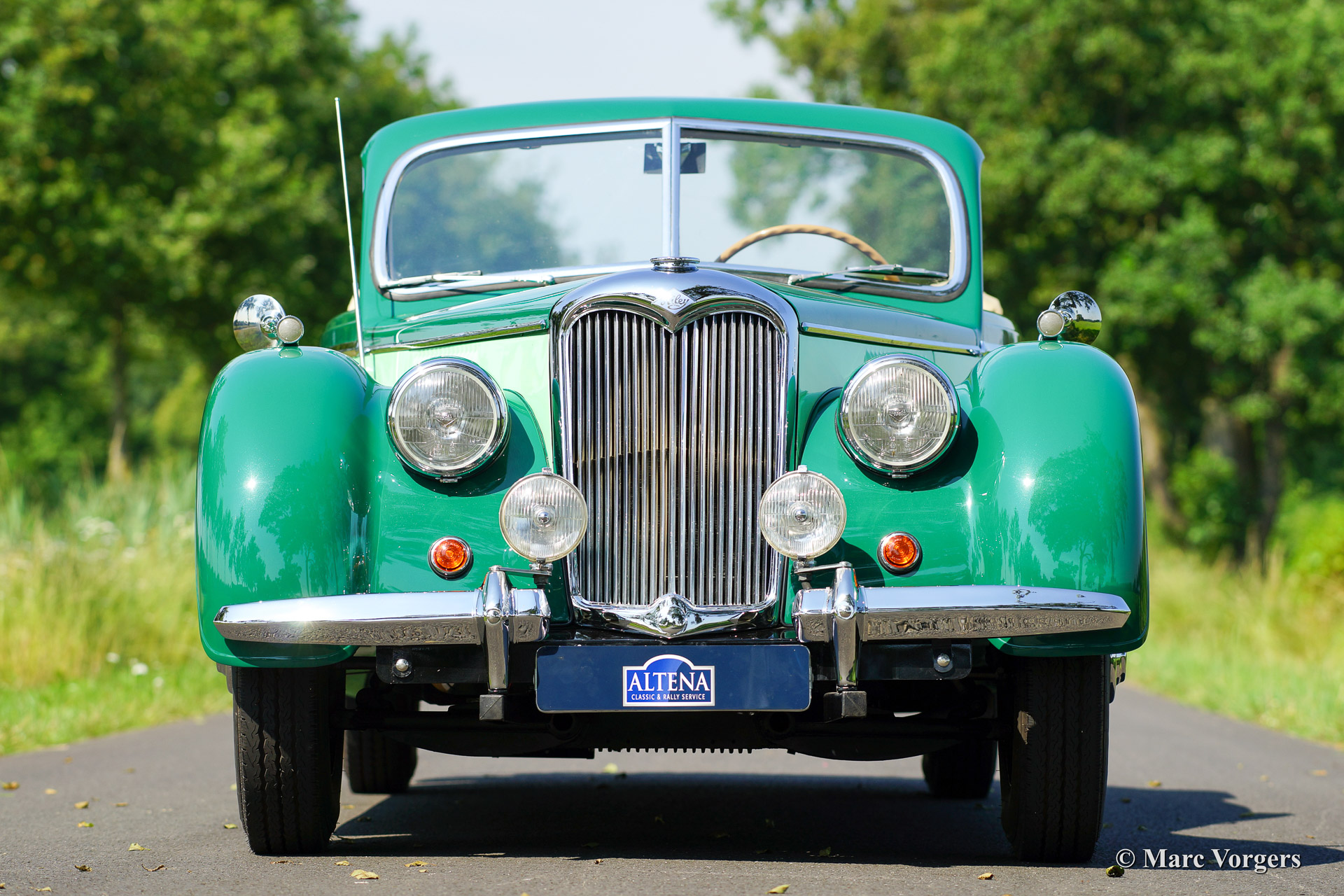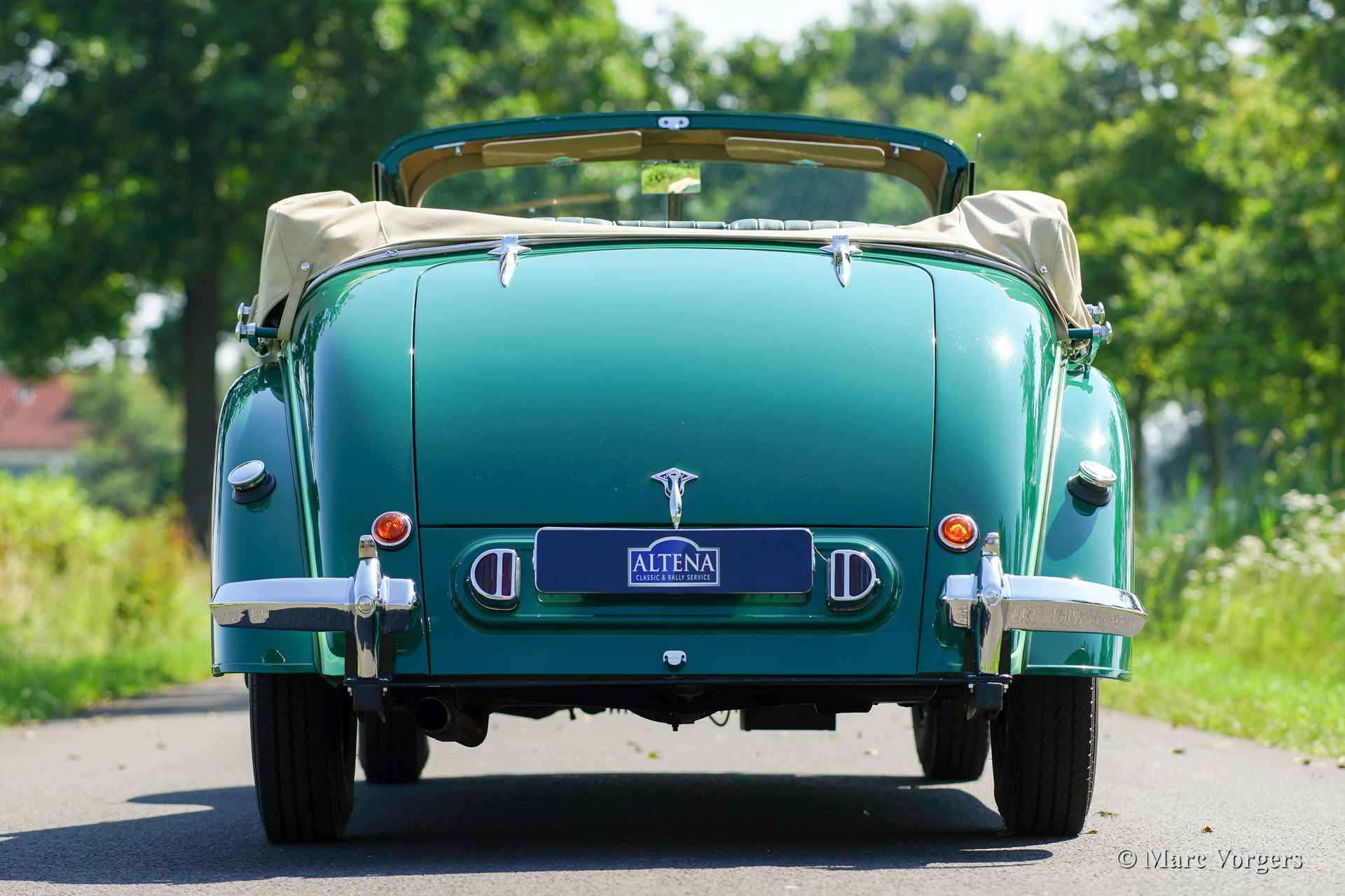 Riley RMD Drophead Coupe, bouwjaar 1951. Chassisnummer 60F72XX. Kleur 'two-tone', groen/lichtgroen. Groen lederen interieur met groen tapijt. Beige cabrioletkap en hood cover. Deze geweldige Riley is een van de slechts 502 ooit gebouwde RMD Drophead Coupe modellen. De automobiel werd in het verleden uitvoerig gerestaureerd. Deze linksgestuurde Riley RMD DHC verkeert in sublieme topstaat en de auto is een genot om te rijden! Een geweldige vierpersoons cabriolet met een bijzonder fraai houten dashboard, een 'period' radio, een eenvoudig te bedienen cabrioletkap en 'frameloze' op- en neerdraaibare zijruiten. Zeldzaam, prachtig gerestaureerd en exclusief. Zowaar nog binnen het bereik van de ware liefhebber.