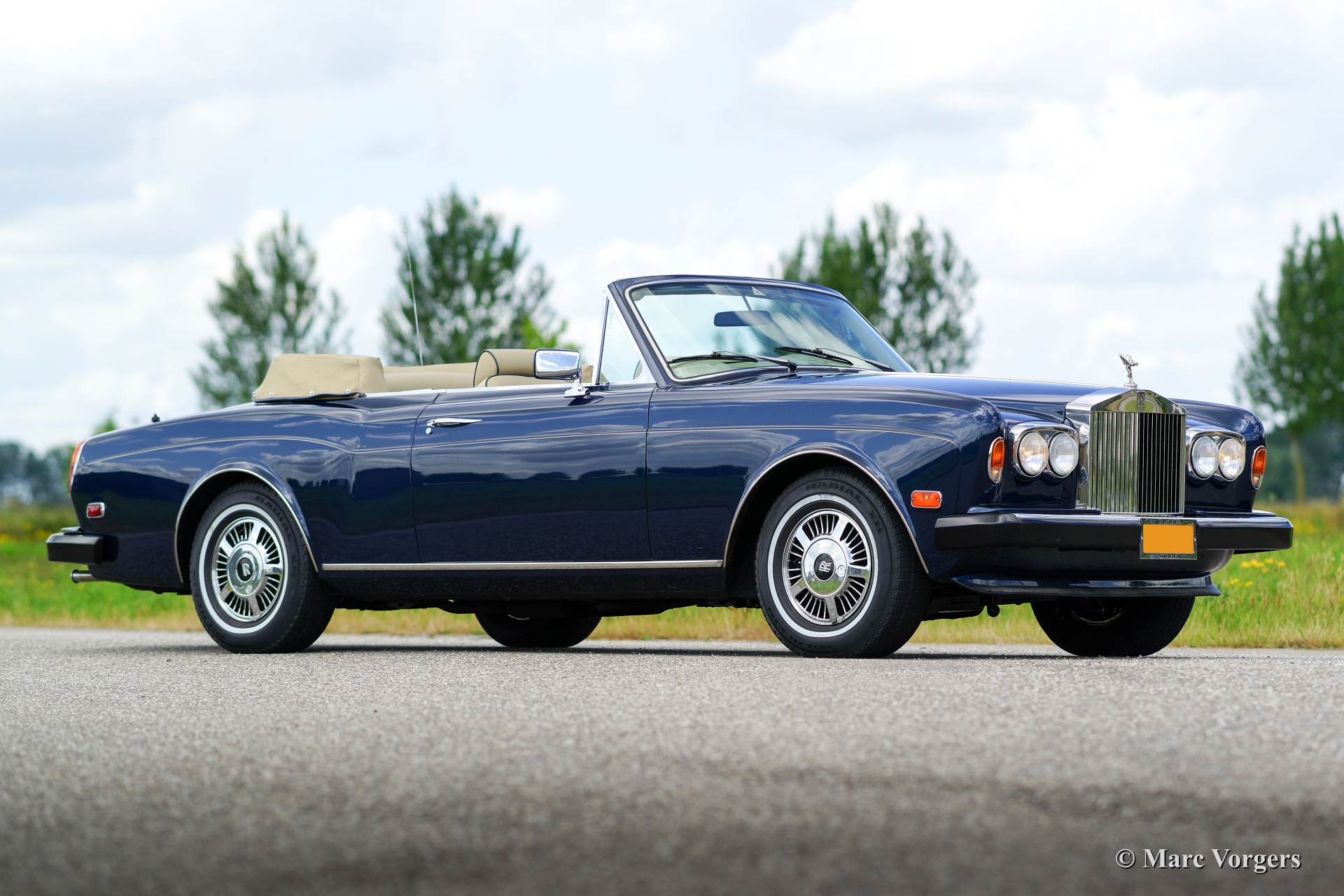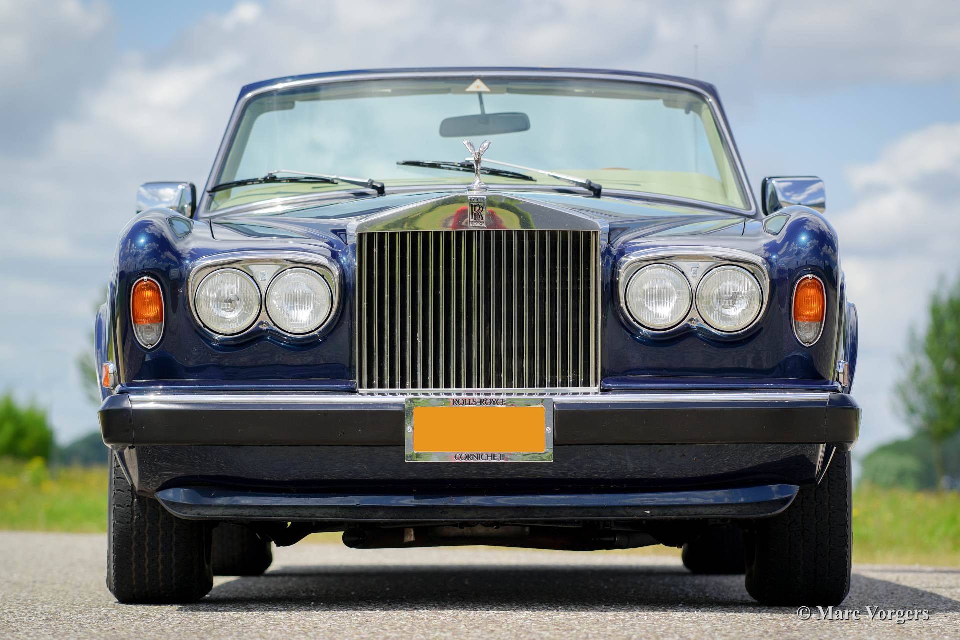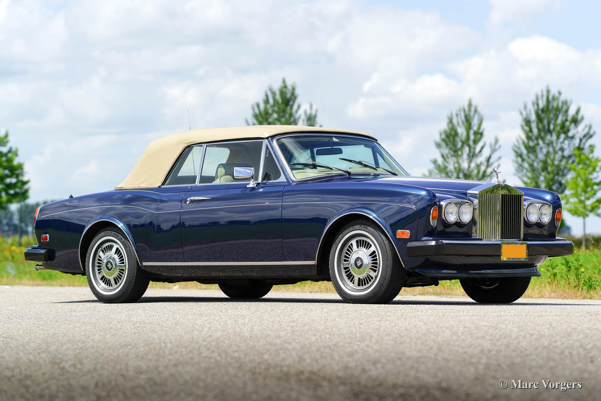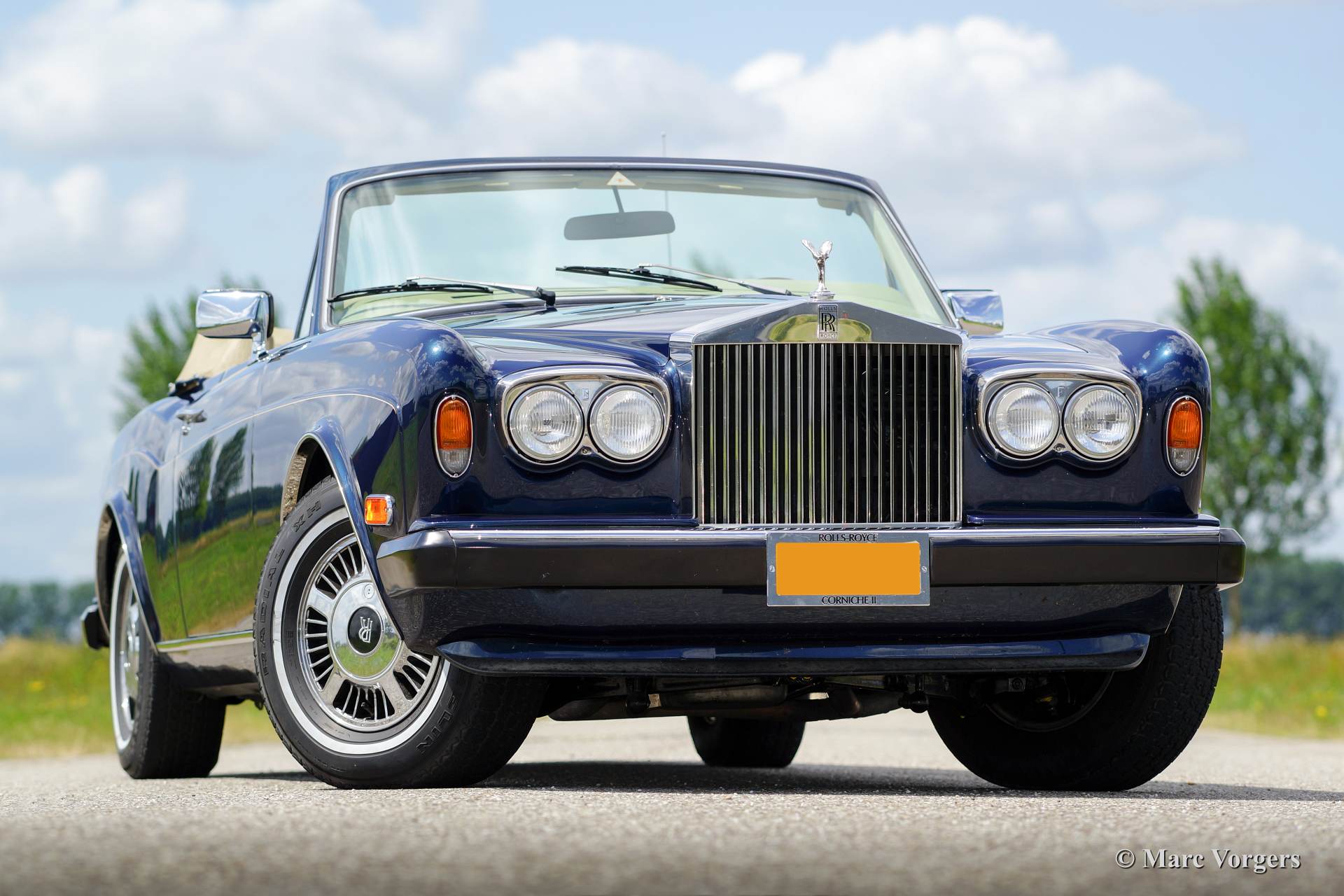 Rolls-Royce Corniche II, bouwjaar 1984. Kleur donkerblauw met een beige lederen interieur afgewerkt met blauwe biezen. Beige cabrioletkap en afdekhoes. Deze prachtige en zeer stijlvolle Rolls-Royce Corniche verkeert in uitstekende originele staat en de automobiel rijdt voortreffelijk. Er werden slechts 2.669 exemplaren van dit model gebouwd. De rijbeleving is zeer comfortabel en rustgevend. Bij wat steviger indrukken van het gaspedaal is de krachtige V8 motor direct bij de les evenals de soepel schakelende automatische versnellingsbak.