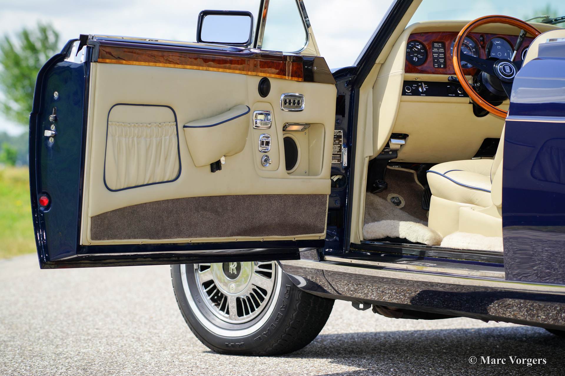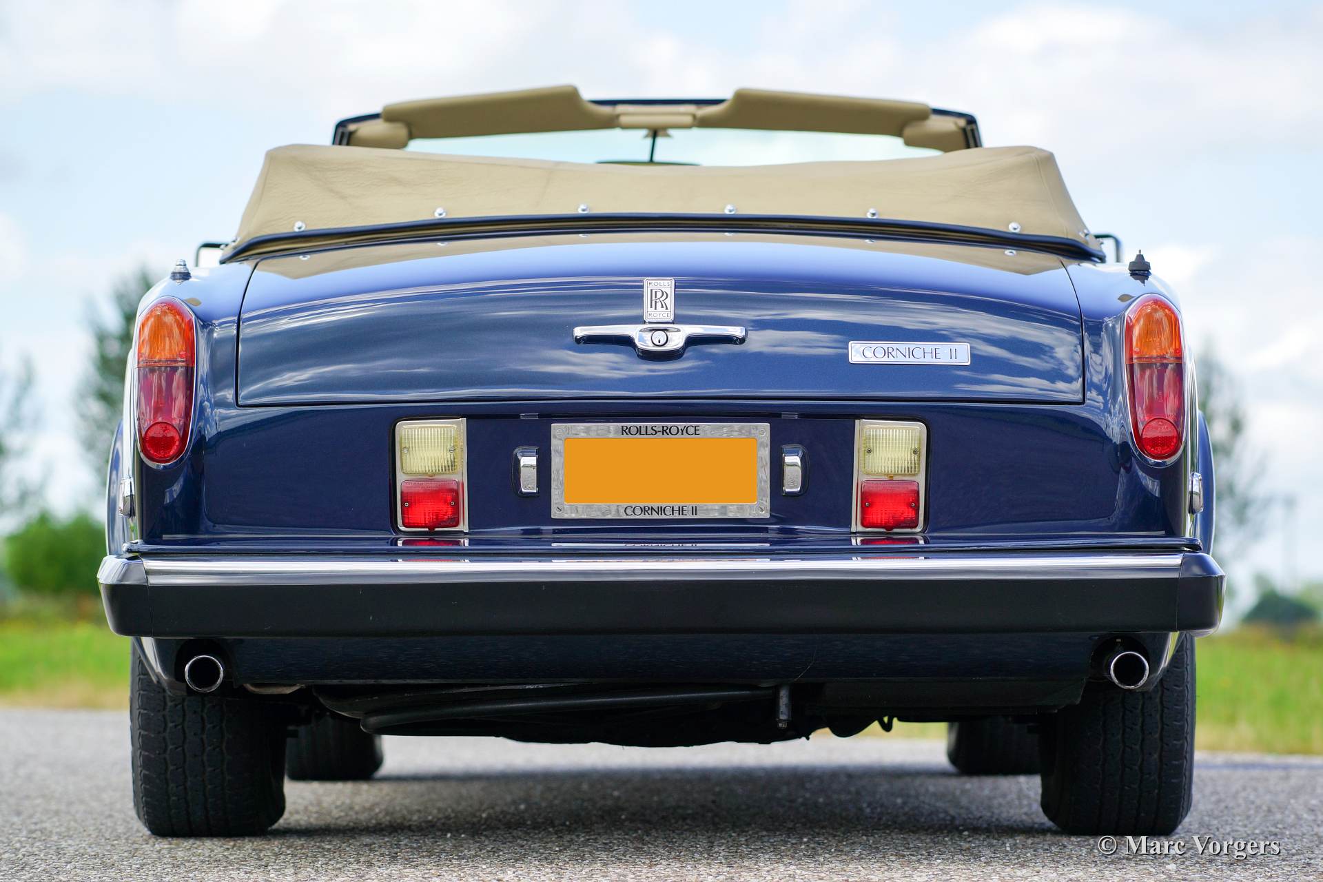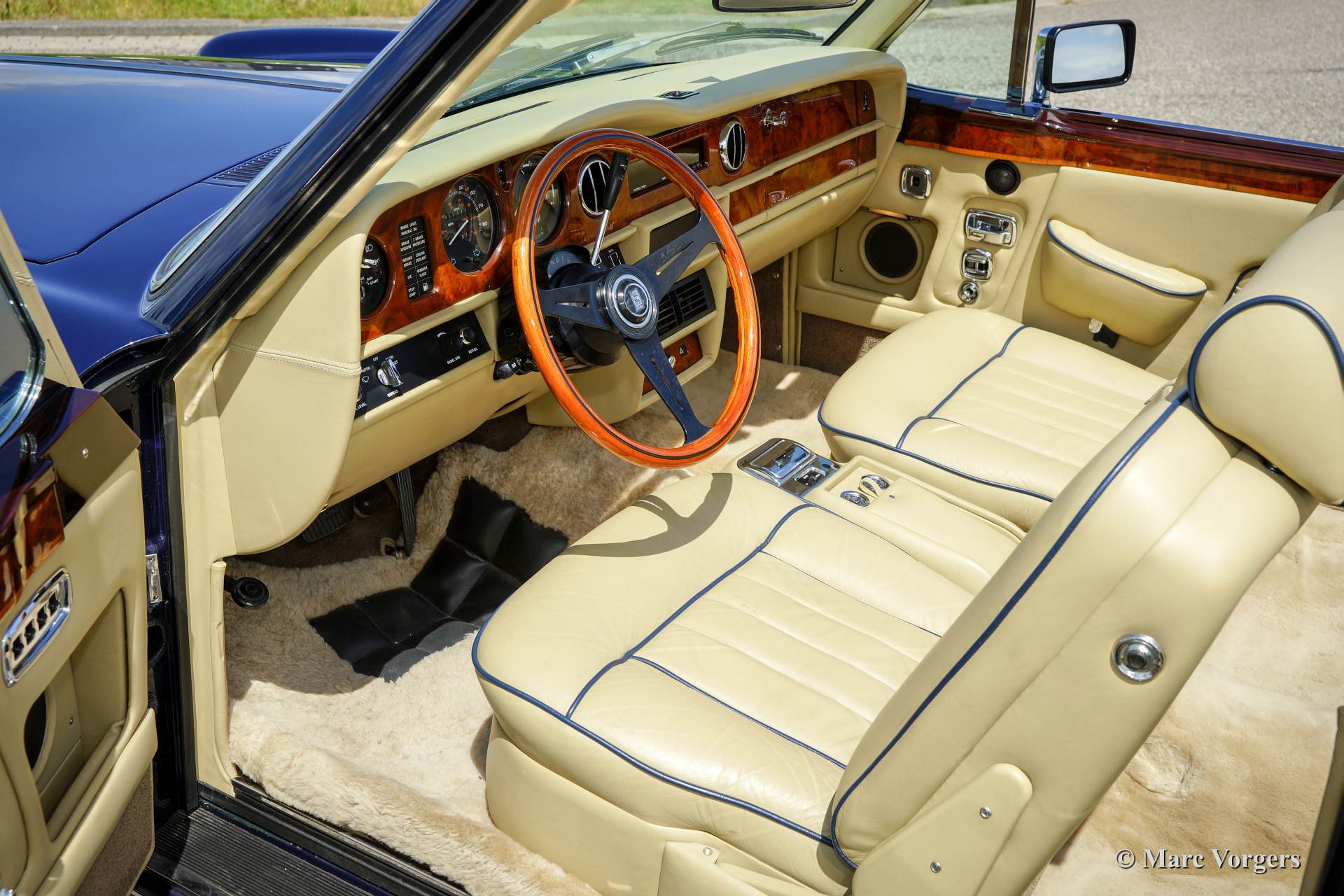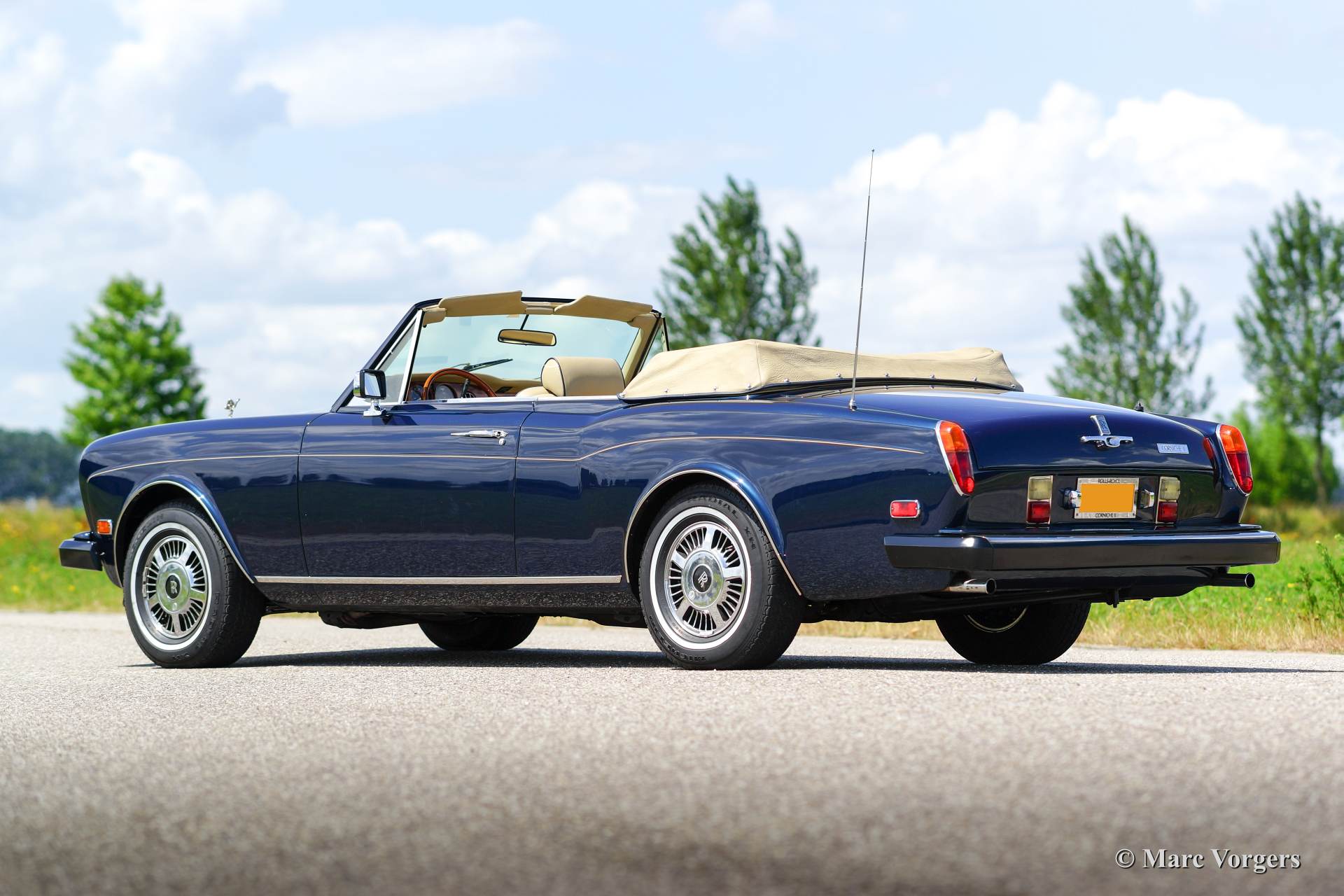 Rolls-Royce Corniche II, bouwjaar 1984. Kleur donkerblauw met een beige lederen interieur afgewerkt met blauwe biezen. Beige cabrioletkap en afdekhoes. Deze prachtige en zeer stijlvolle Rolls-Royce Corniche verkeert in uitstekende originele staat en de automobiel rijdt voortreffelijk. Er werden slechts 2.669 exemplaren van dit model gebouwd. De rijbeleving is zeer comfortabel en rustgevend. Bij wat steviger indrukken van het gaspedaal is de krachtige V8 motor direct bij de les evenals de soepel schakelende automatische versnellingsbak.