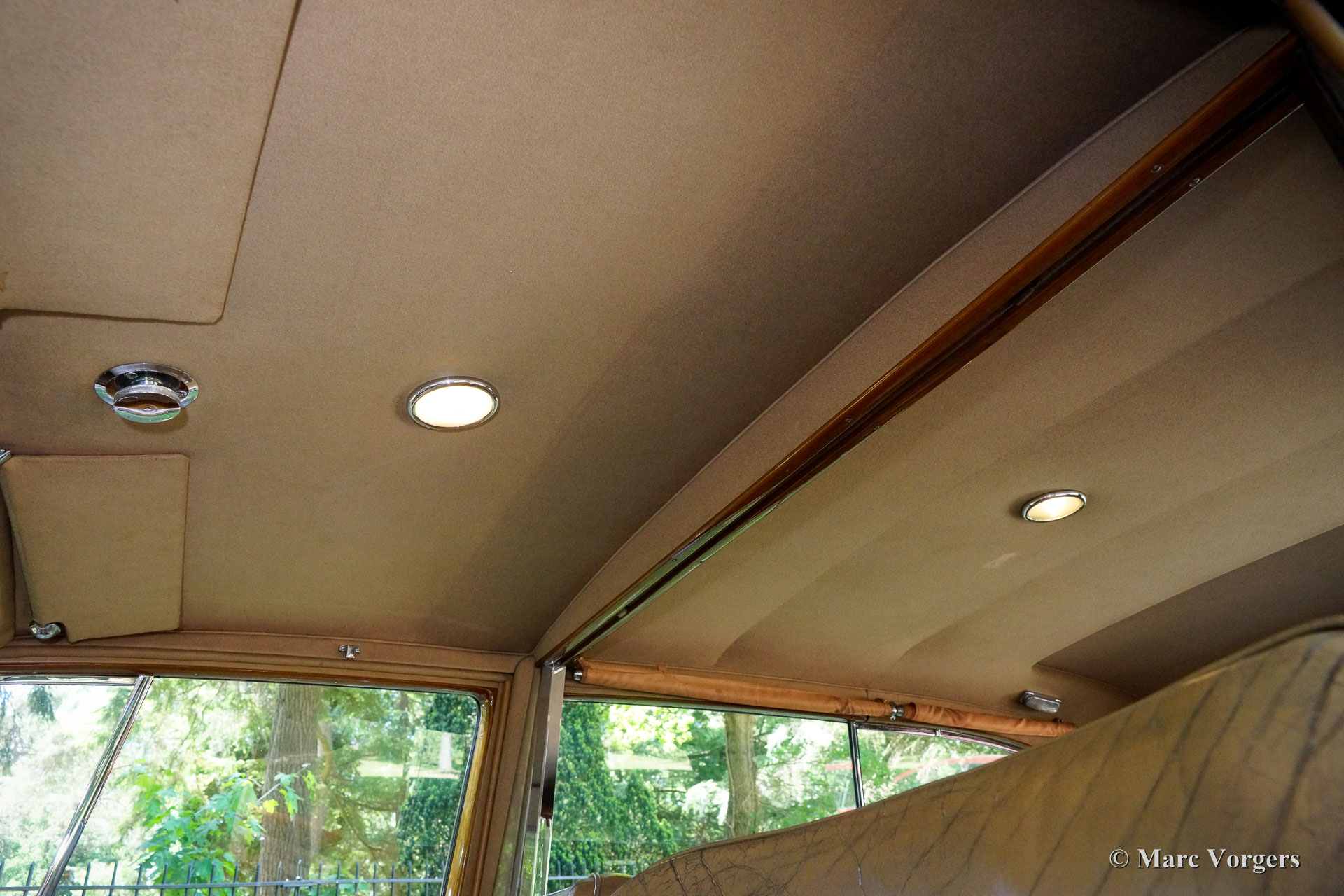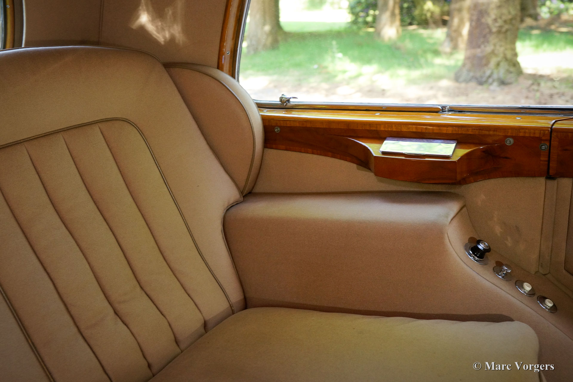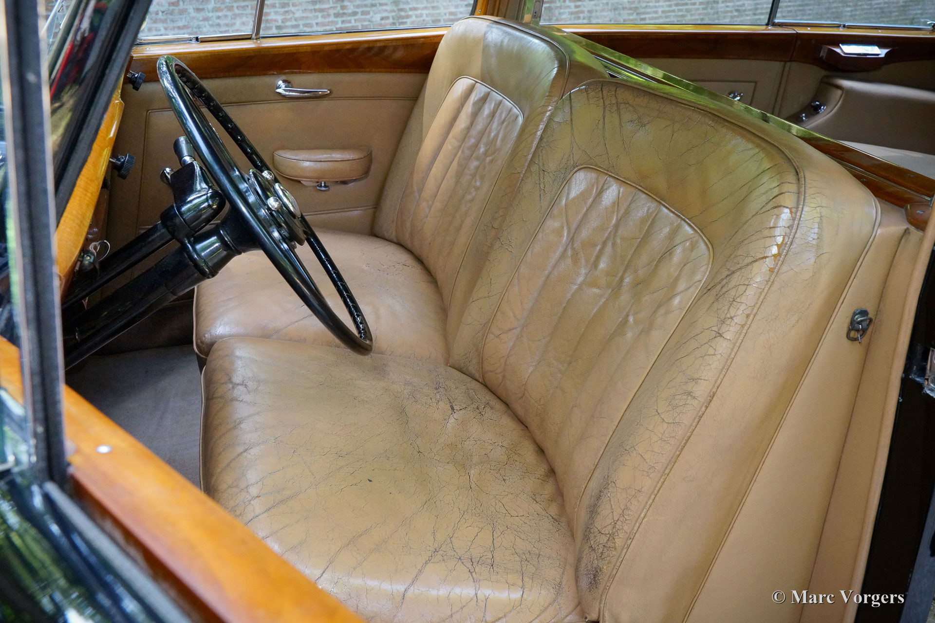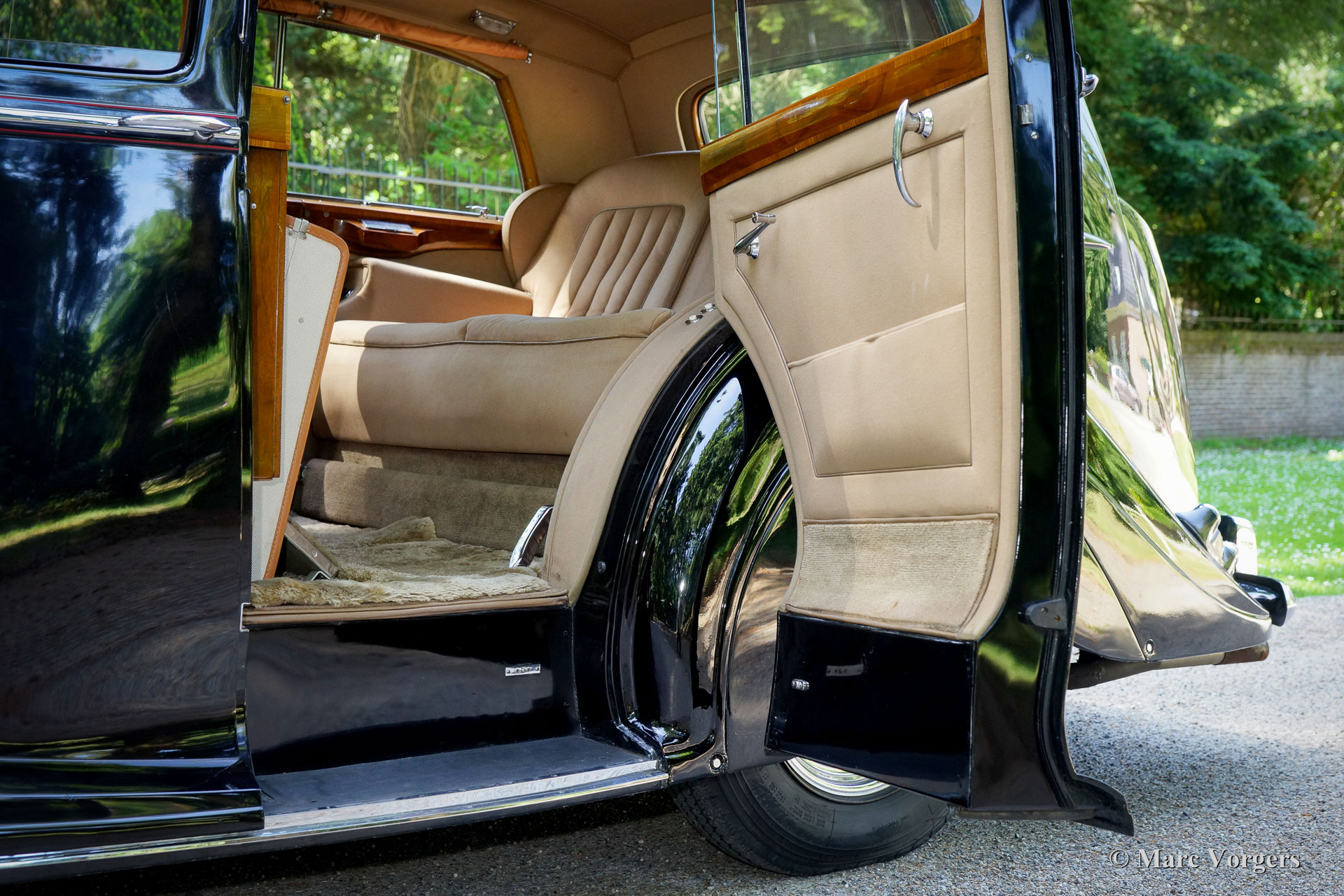 Rolls-Royce Silver Wraith, jaar 1952. Kleur zwart. In het magnifieke interieur beschikken de chauffeur en de bijrijder over beige leren stoelen. Het zeer luxueuze passagierscompartiment is volledig bekleed met zachte beige stof en wollen tapijt. Deze prachtige Rolls-Royce is afkomstig uit Italië waar de automobiel decennialang dienst heeft gedaan bij een adellijke familie. Zeer bijzonder is dat de automobiel links gestuurd is! Deze bijzondere Rolls-Royce verkeert in zeer goede en volledig originele conditie; een echte tijdmachine! De rijbeleving voorin en achterin is werkelijk fantastisch, deze grote automobiel is eenvoudig te rijden. In het passagierscompartiment is het koninklijk genieten op de uiterst comfortabele fauteuils en het zicht rondom en de detaillering in het interieur is ronduit geweldig. De passagiers hebben de beschikking over voetsteunen, rolgordijnen en reiskoffers zijn onder handbereik. Ook is er een elektrisch bedienbaar glazen venster aanwezig dat het passagierscompartiment afscheidt van het chauffeursgedeelte. De Rolls-Royce Silver Wraith is het laatste Rolls-Royce model dat door ‘carrossiers’ werd voorzien van speciale koetswerken. Deze Wraith heeft een zeer bijzonder limousine koetswerk van H.J. Mulliner met een indrukwekkende uitstraling. De automobiel wordt geleverd met een bijbehorende imperiaal die over het gehele dak gaat en ‘period’ sneeuwkettingen!