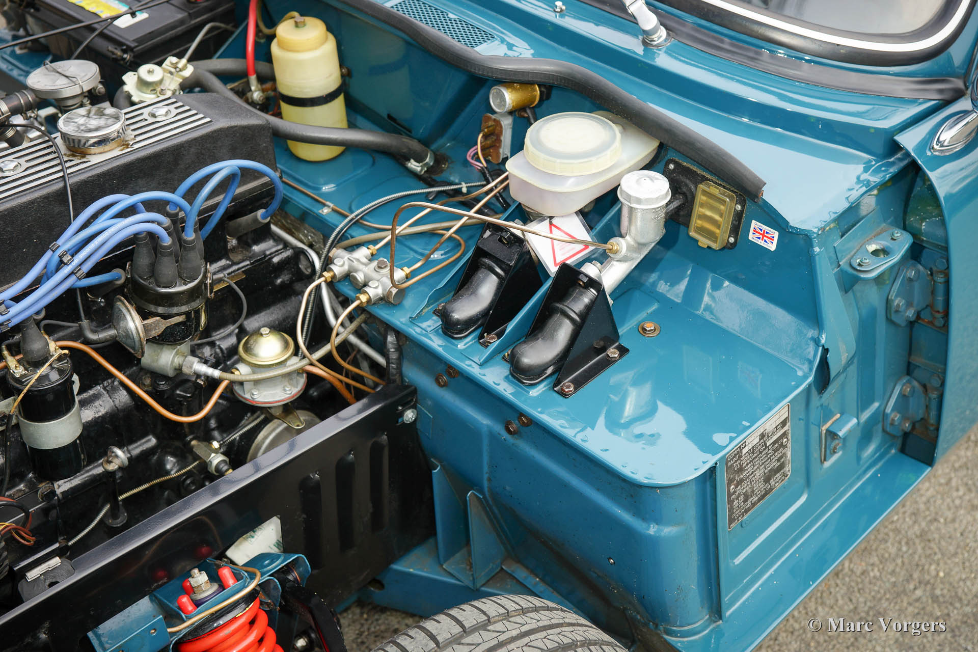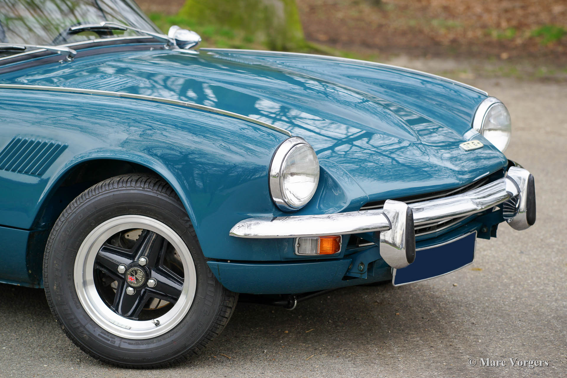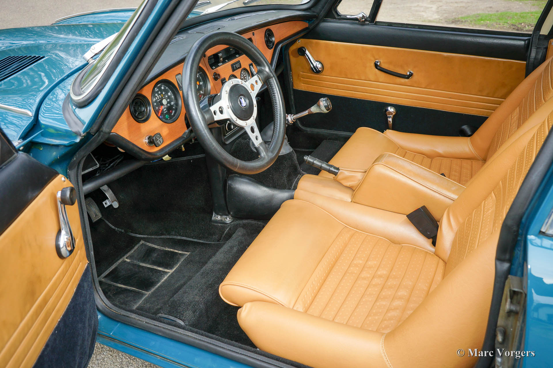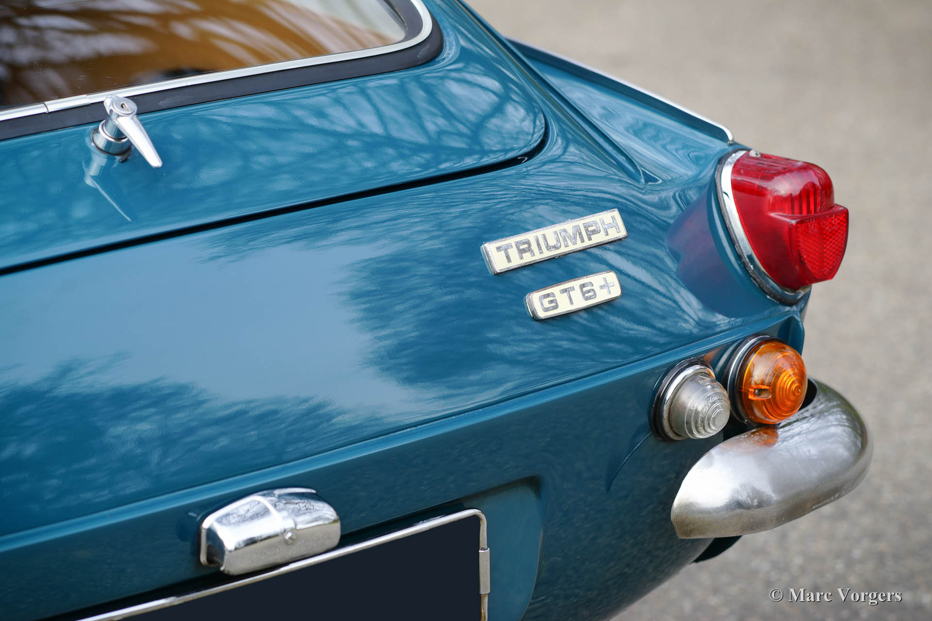 Triumph GT 6+ (Mk II), jaar 1968. Kleur Valencia blauw met een beige kunstlederen interieur en zwart tapijt. Deze prachtige GT6 is in excellente staat en is uitgerust met overdrive, 'Revolution' lichtmetalen wielen en een aluminium kleppendeksel. De Triumph GT 6 is het coupe model van de Triumph Spitfire en uitgerust met de zescilinder lijnmotor van de Triumph Vitesse. Deze prachtige GT 6 werd gefotografeerd voor een boek over 'British Sports Cars' waarover u later in 2016 meer zult horen en lezen.