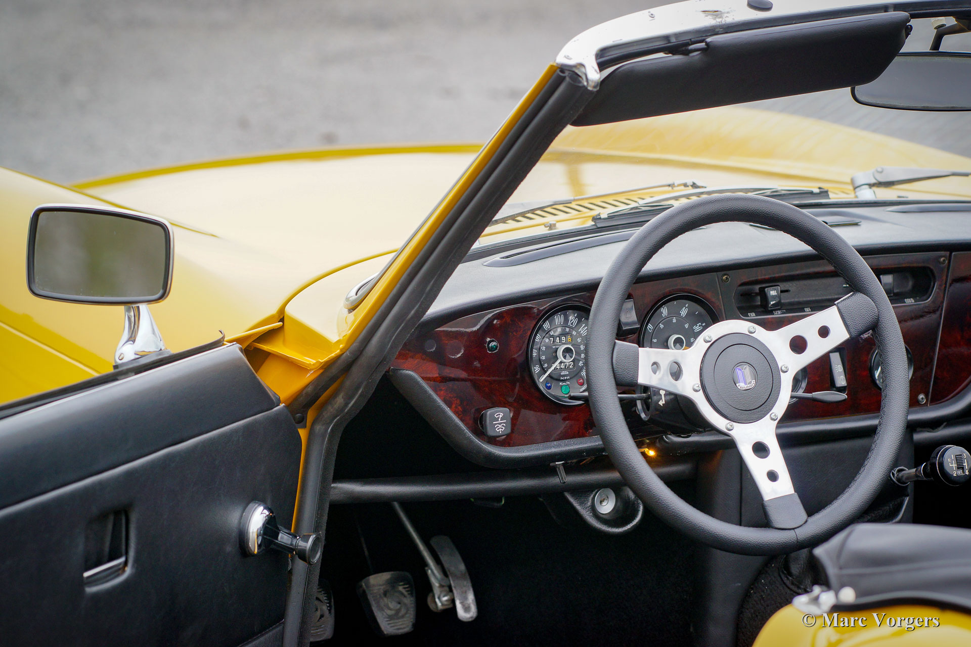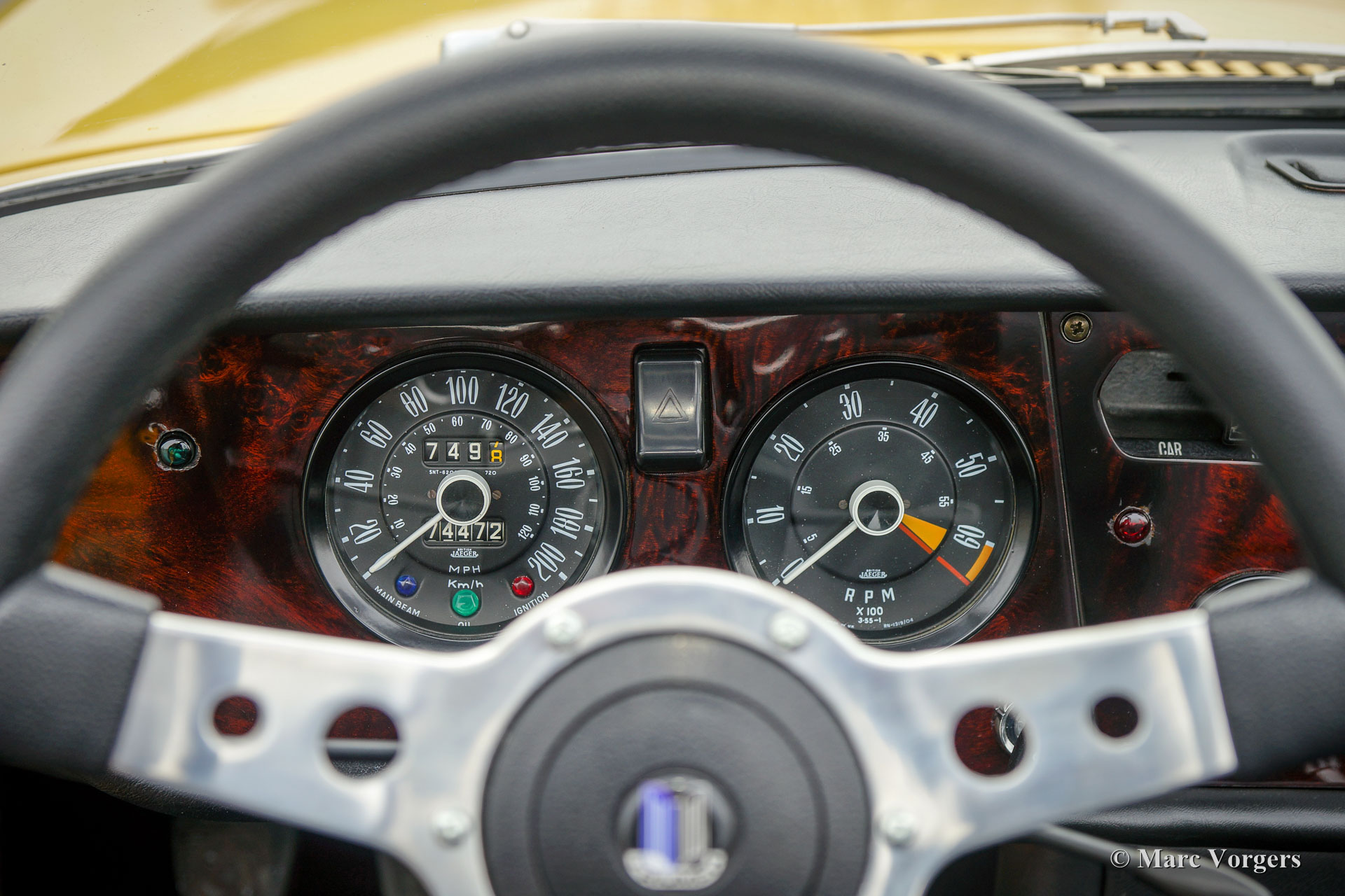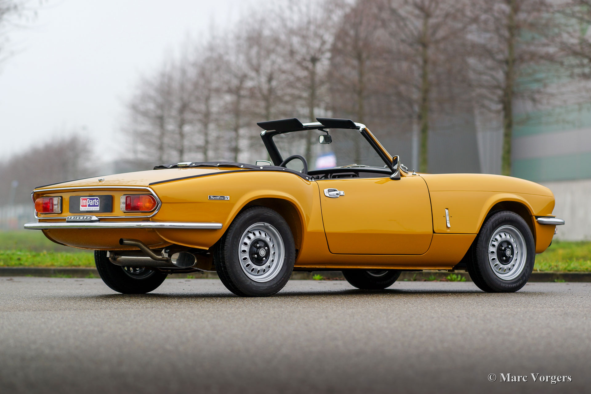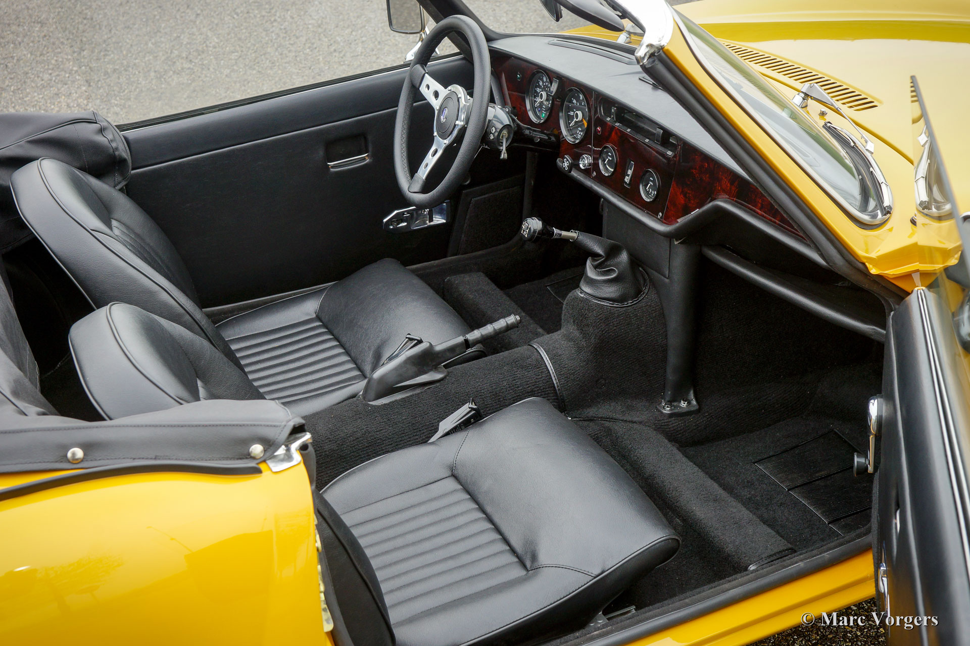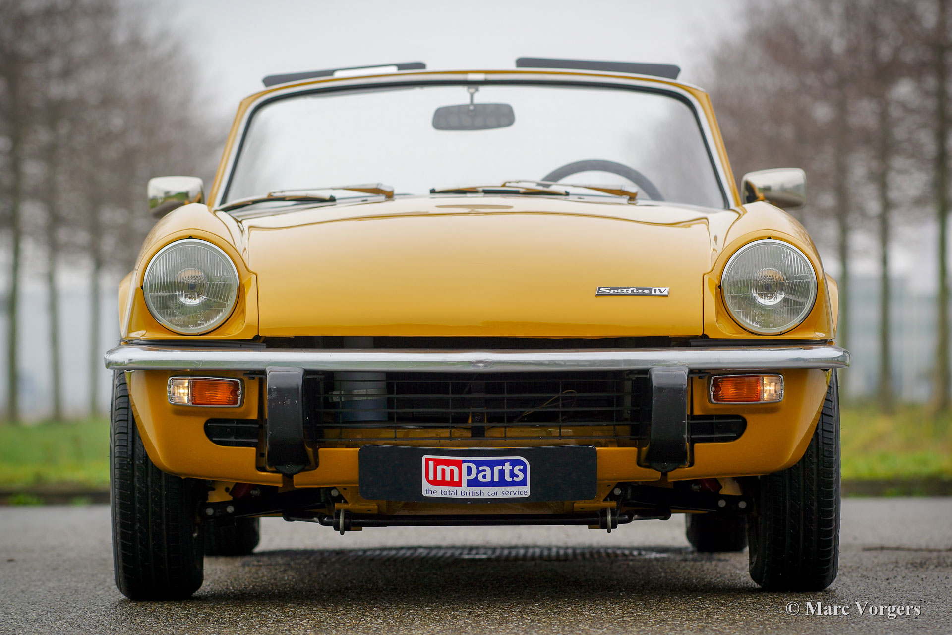 Triumph Spitfire Mk IV, jaar 1972. Kleur okergeel met een zwart interieur en zwart tapijt. Zwarte soft-top en een originele hard-top in carrosseriekleur! Deze fantastische Triumph Spitfire is in het jaar 2016 volledig en perfect gerestaureerd, sindsdien heeft de auto ca. 1000 kilometer gereden. Dit is een top-exemplaar in concoursstaat! Een voortreffelijke Britse roadster die een geweldige rijbeleving en heel veel rijplezier biedt. De auto is uitgerust met de originele 1300 cc motor die 76 pk levert. Uiteraard is de motor volledig gereviseerd en geschikt gemaakt voor het gebruik van loodvrije benzine. De auto is voorzien van originele stalen wielen, overdrive, een rvs uitlaat, een met leer bekleed sportstuur, twee verchroomde buitenspiegels en de al genoemde hard-top!