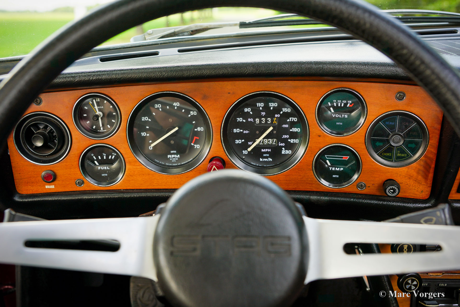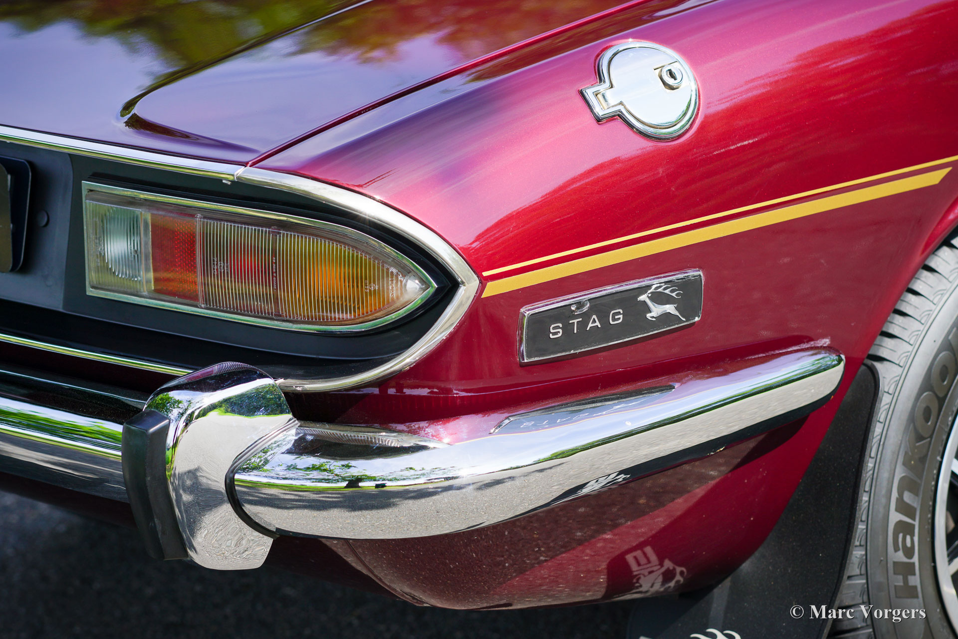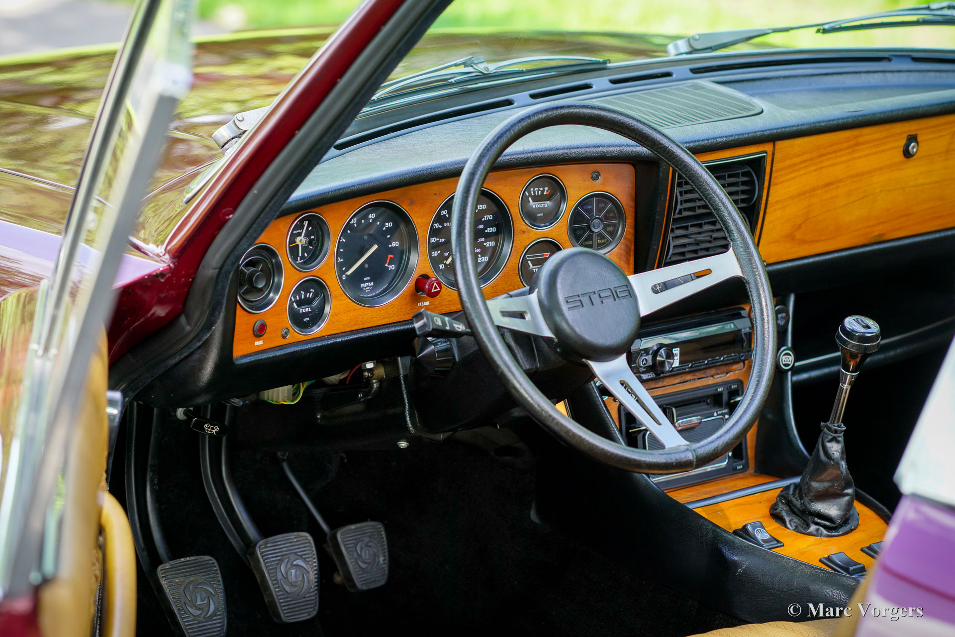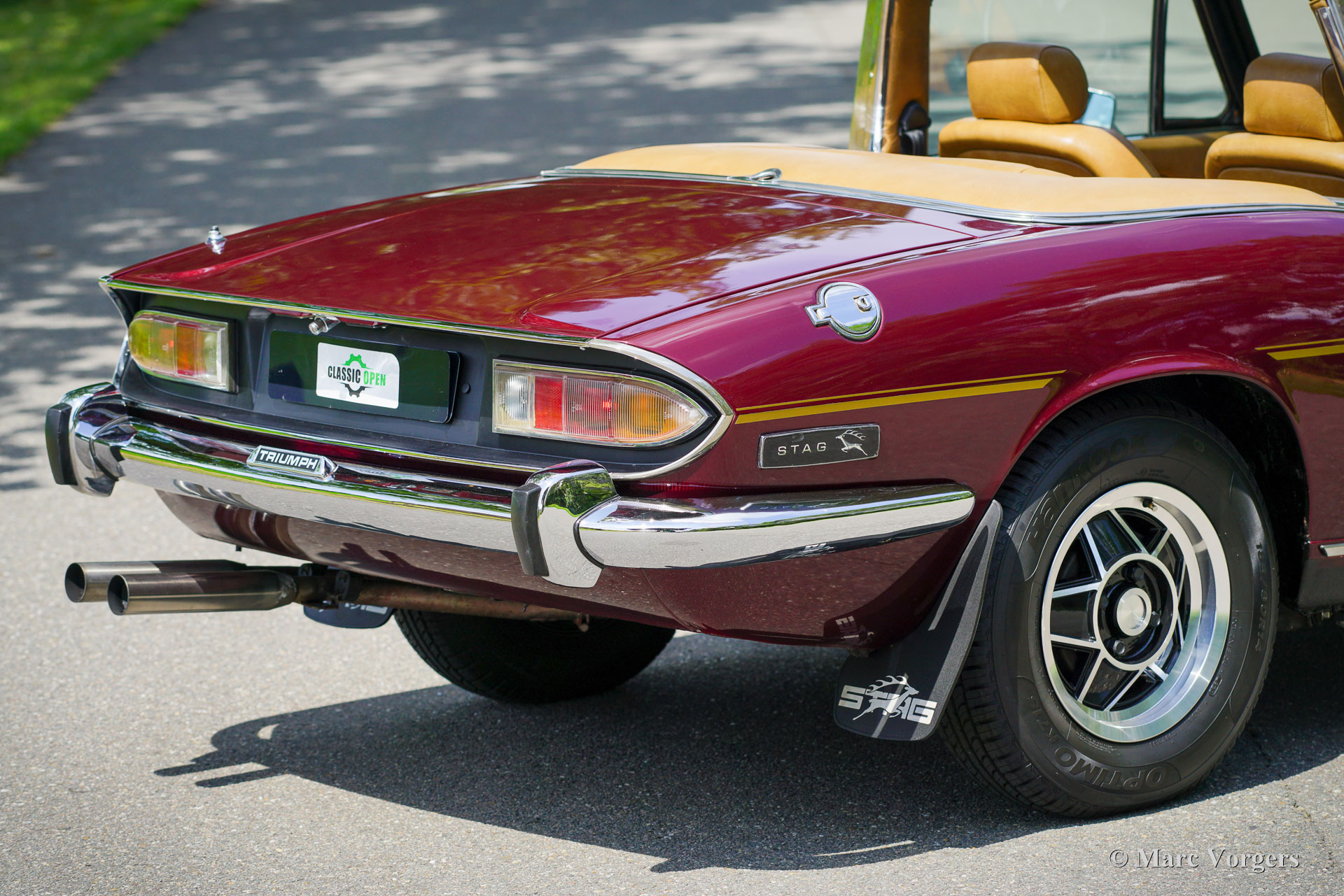Triumph Stag, jaar 1975. Kleur donkerrood metallic gecombineerd met een donkerbeige kunstleren interieur en zwart tapijt. Zwarte mohair soft-top en originele hard-top (winterdak) in carrosseriekleur. De magnifieke Triumph Stag is ontworpen door de bekende Italiaanse topdesigner Michelotti. De Stag is bedacht in de jaren dat veiligheid een hot item werd in de VS en sportieve open auto's als onveilig werden beschouwd. Daarom kreeg de Triumph Stag een speciale rolbeugel (T-bar), een behandeling die ook werd gegeven aan de Jaguar XJS uit die tijd. De motorkapconstructie en opbergruimte van de Triumph Stag is geïnspireerd op de Mercedes SL-oplossing, waarbij de kap in een speciaal compartiment neerklapt dat wordt afgesloten met een harde klep. De stoere hard-top maakt van de Stag een fraaie coupé! Deze prachtige Triumph Stag verkeert in een zeer goede staat en de auto rijdt en schakelt uitstekend! De auto is enkele jaren geleden prachtig donkerrood metallic gespoten, onder de motorkap is te zien dat de auto oorspronkelijk bruin is geweest. Het originele interieur is in een bijna perfecte staat en vertoont slechts de minste tekenen van eerder gebruik. De motorruimte ziet er geheel origineel uit met gebruiks- en ouderdomssporen. De 3000 cc Triumph V8 motor loopt perfect en het uitlaatgeluid is zeer verslavend! De handgeschakelde vierversnellingsbak schakelt precies en is voorzien van overdrive. Verder is de auto voorzien van stuurbekrachtiging, rembekrachtiging en elektronische ontsteking. De originele wielen zijn drie jaar geleden gerestaureerd naar topstaat en zijn prachtig! Tussen 1970 en 1977 werden er ongeveer 25.800 exemplaren gebouwd waarvan de meeste uitgerust waren met een automatische versnellingsbak... Dit exemplaar is voorzien van de gewilde handgeschakelde versnellingsbak met overdrive-optie die de sportieve maar comfortabele rijervaring naar een hoger plan tilt.