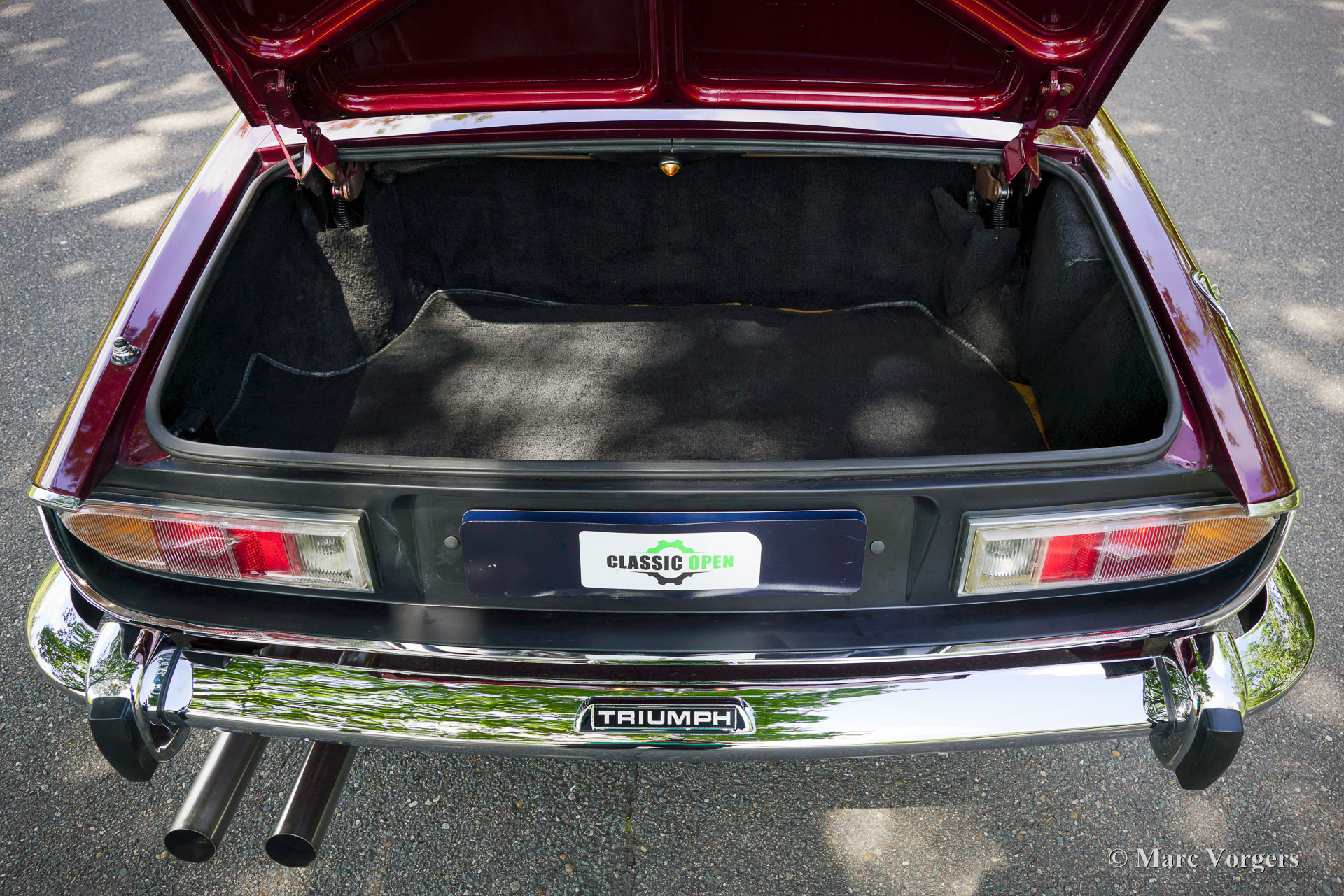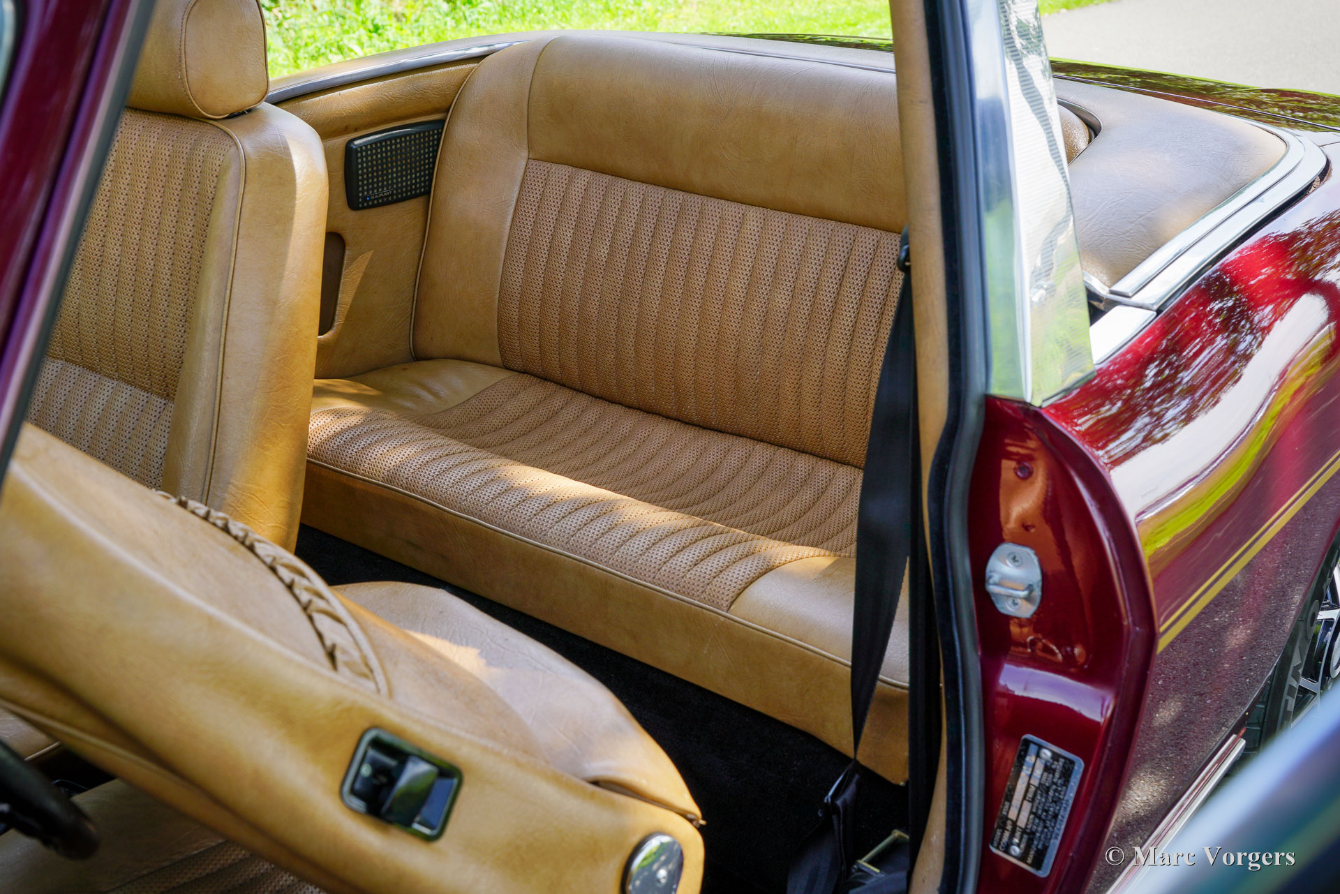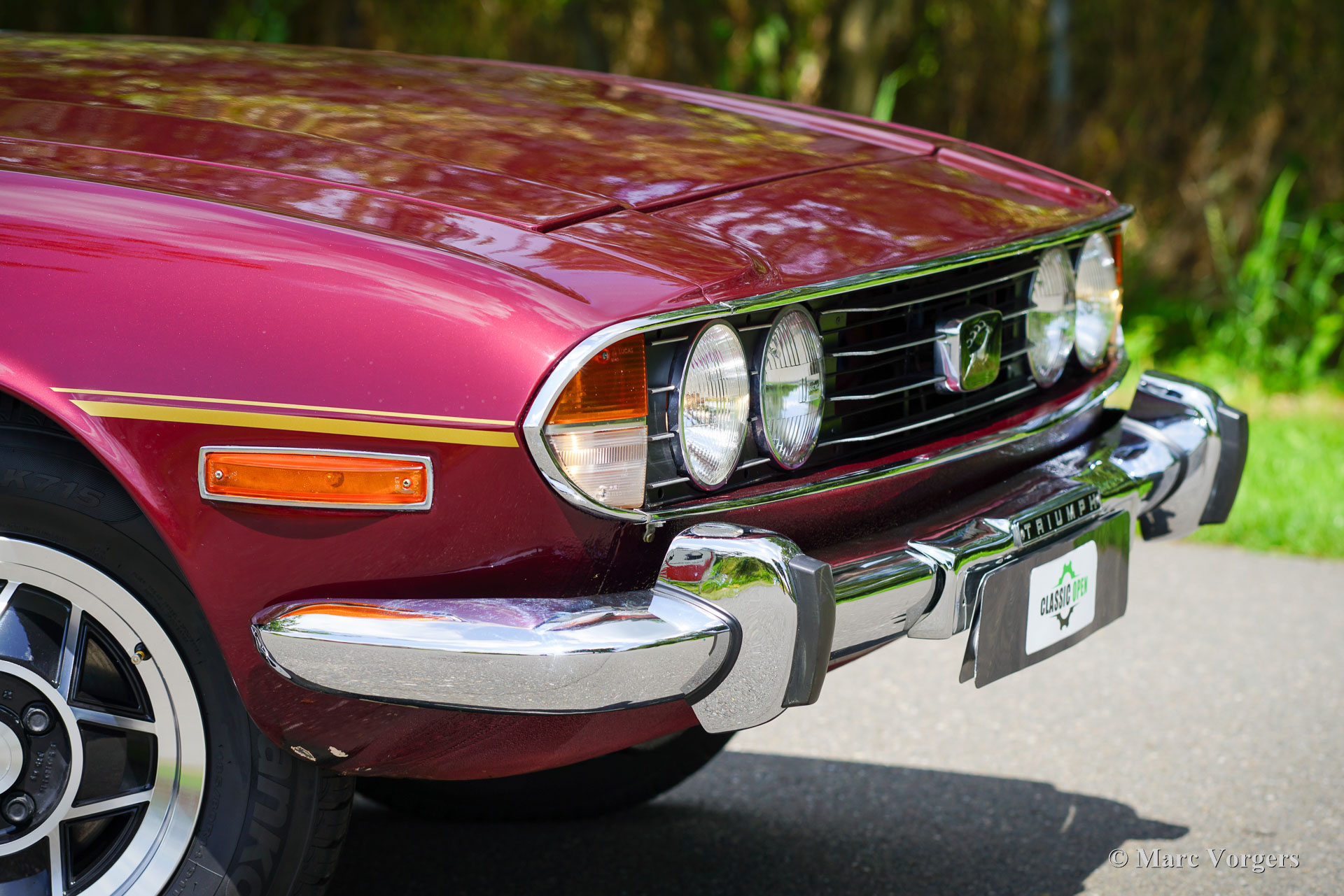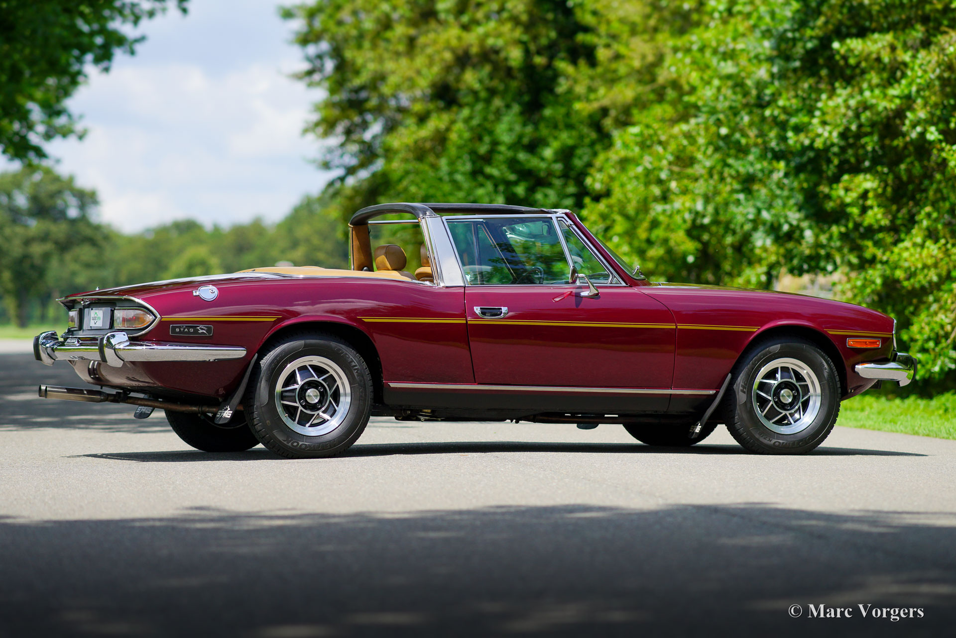 Triumph Stag, jaar 1975. Kleur donkerrood metallic gecombineerd met een donkerbeige kunstleren interieur en zwart tapijt. Zwarte mohair soft-top en originele hard-top (winterdak) in carrosseriekleur. De magnifieke Triumph Stag is ontworpen door de bekende Italiaanse topdesigner Michelotti. De Stag is bedacht in de jaren dat veiligheid een hot item werd in de VS en sportieve open auto's als onveilig werden beschouwd. Daarom kreeg de Triumph Stag een speciale rolbeugel (T-bar), een behandeling die ook werd gegeven aan de Jaguar XJS uit die tijd. De motorkapconstructie en opbergruimte van de Triumph Stag is geïnspireerd op de Mercedes SL-oplossing, waarbij de kap in een speciaal compartiment neerklapt dat wordt afgesloten met een harde klep. De stoere hard-top maakt van de Stag een fraaie coupé! Deze prachtige Triumph Stag verkeert in een zeer goede staat en de auto rijdt en schakelt uitstekend! De auto is enkele jaren geleden prachtig donkerrood metallic gespoten, onder de motorkap is te zien dat de auto oorspronkelijk bruin is geweest. Het originele interieur is in een bijna perfecte staat en vertoont slechts de minste tekenen van eerder gebruik. De motorruimte ziet er geheel origineel uit met gebruiks- en ouderdomssporen. De 3000 cc Triumph V8 motor loopt perfect en het uitlaatgeluid is zeer verslavend! De handgeschakelde vierversnellingsbak schakelt precies en is voorzien van overdrive. Verder is de auto voorzien van stuurbekrachtiging, rembekrachtiging en elektronische ontsteking. De originele wielen zijn drie jaar geleden gerestaureerd naar topstaat en zijn prachtig! Tussen 1970 en 1977 werden er ongeveer 25.800 exemplaren gebouwd waarvan de meeste uitgerust waren met een automatische versnellingsbak... Dit exemplaar is voorzien van de gewilde handgeschakelde versnellingsbak met overdrive-optie die de sportieve maar comfortabele rijervaring naar een hoger plan tilt.
