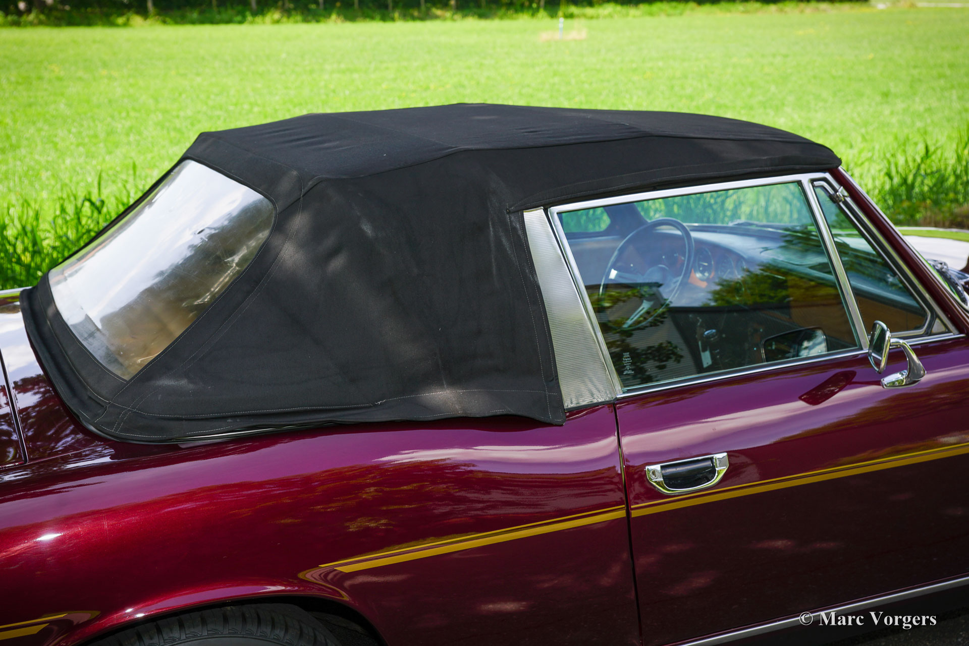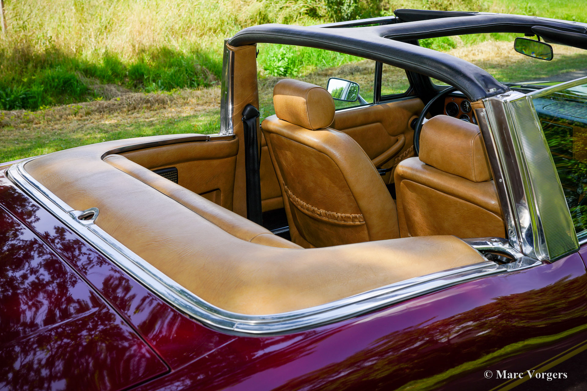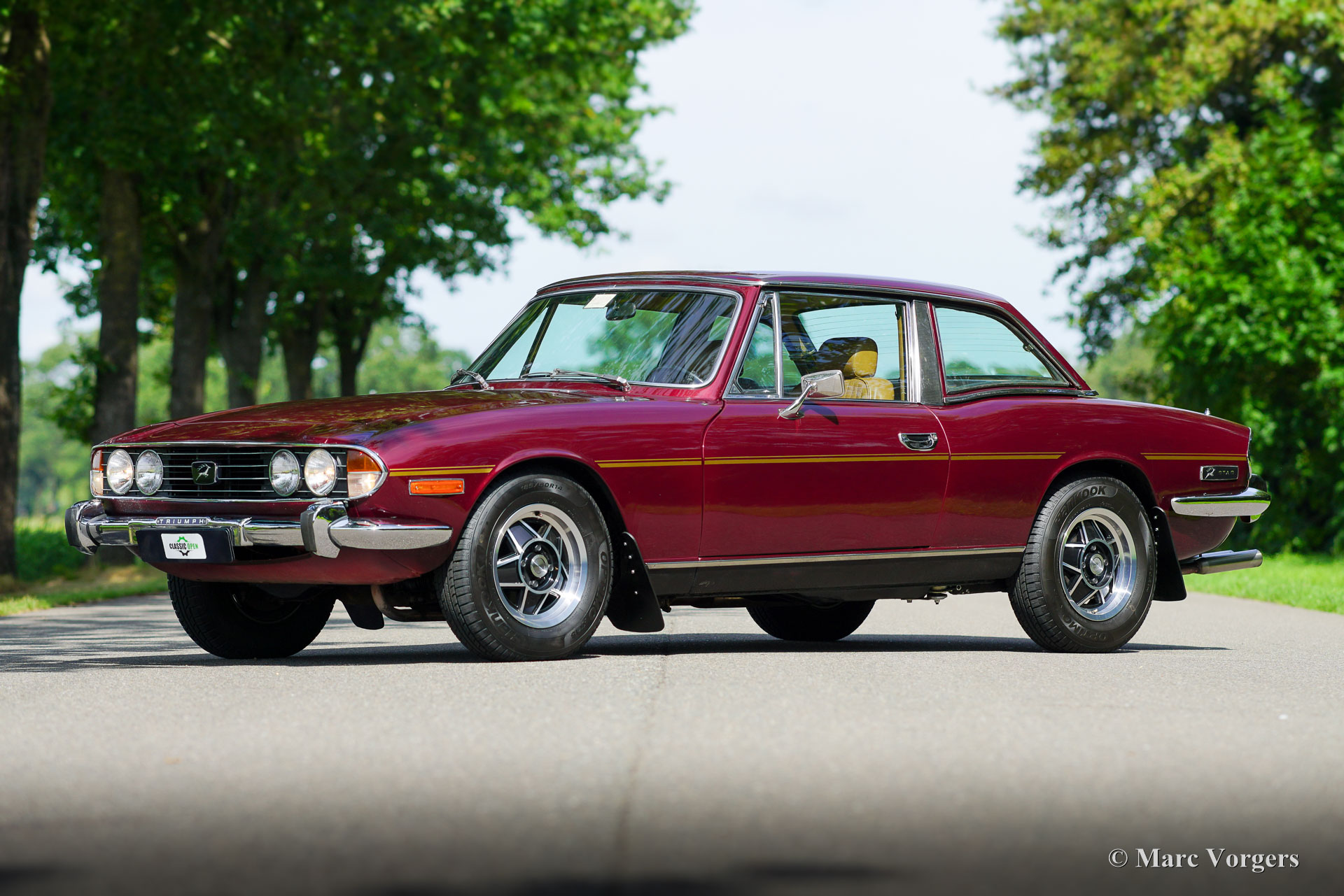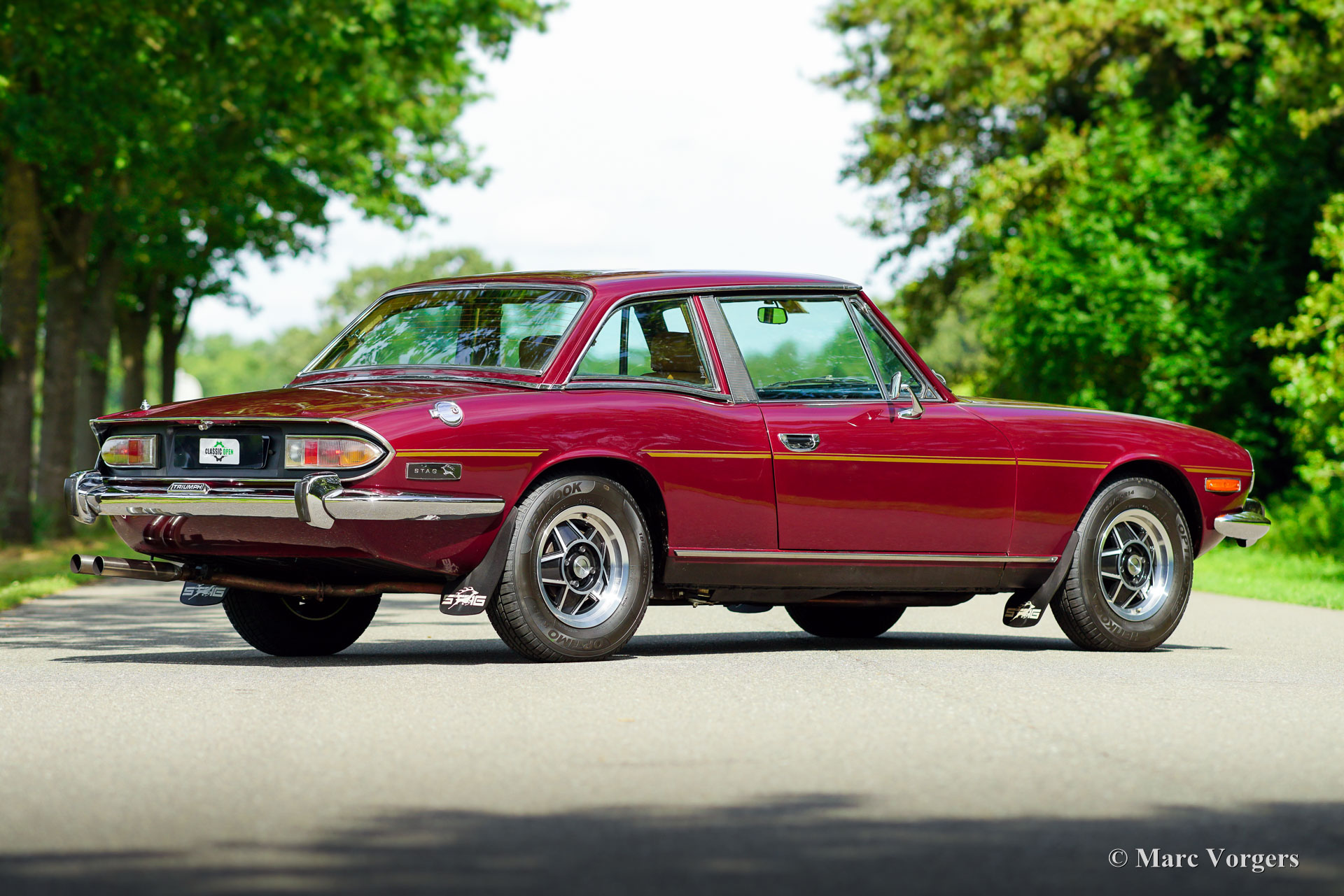 Triumph Stag, jaar 1975. Kleur donkerrood metallic gecombineerd met een donkerbeige kunstleren interieur en zwart tapijt. Zwarte mohair soft-top en originele hard-top (winterdak) in carrosseriekleur. De magnifieke Triumph Stag is ontworpen door de bekende Italiaanse topdesigner Michelotti. De Stag is bedacht in de jaren dat veiligheid een hot item werd in de VS en sportieve open auto's als onveilig werden beschouwd. Daarom kreeg de Triumph Stag een speciale rolbeugel (T-bar), een behandeling die ook werd gegeven aan de Jaguar XJS uit die tijd. De motorkapconstructie en opbergruimte van de Triumph Stag is geïnspireerd op de Mercedes SL-oplossing, waarbij de kap in een speciaal compartiment neerklapt dat wordt afgesloten met een harde klep. De stoere hard-top maakt van de Stag een fraaie coupé! Deze prachtige Triumph Stag verkeert in een zeer goede staat en de auto rijdt en schakelt uitstekend! De auto is enkele jaren geleden prachtig donkerrood metallic gespoten, onder de motorkap is te zien dat de auto oorspronkelijk bruin is geweest. Het originele interieur is in een bijna perfecte staat en vertoont slechts de minste tekenen van eerder gebruik. De motorruimte ziet er geheel origineel uit met gebruiks- en ouderdomssporen. De 3000 cc Triumph V8 motor loopt perfect en het uitlaatgeluid is zeer verslavend! De handgeschakelde vierversnellingsbak schakelt precies en is voorzien van overdrive. Verder is de auto voorzien van stuurbekrachtiging, rembekrachtiging en elektronische ontsteking. De originele wielen zijn drie jaar geleden gerestaureerd naar topstaat en zijn prachtig! Tussen 1970 en 1977 werden er ongeveer 25.800 exemplaren gebouwd waarvan de meeste uitgerust waren met een automatische versnellingsbak... Dit exemplaar is voorzien van de gewilde handgeschakelde versnellingsbak met overdrive-optie die de sportieve maar comfortabele rijervaring naar een hoger plan tilt.