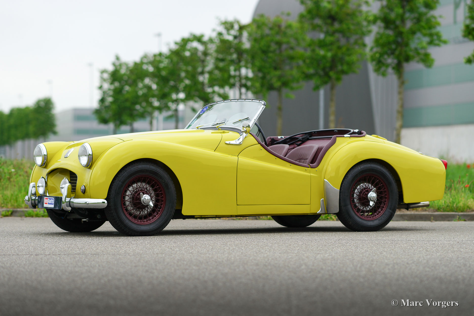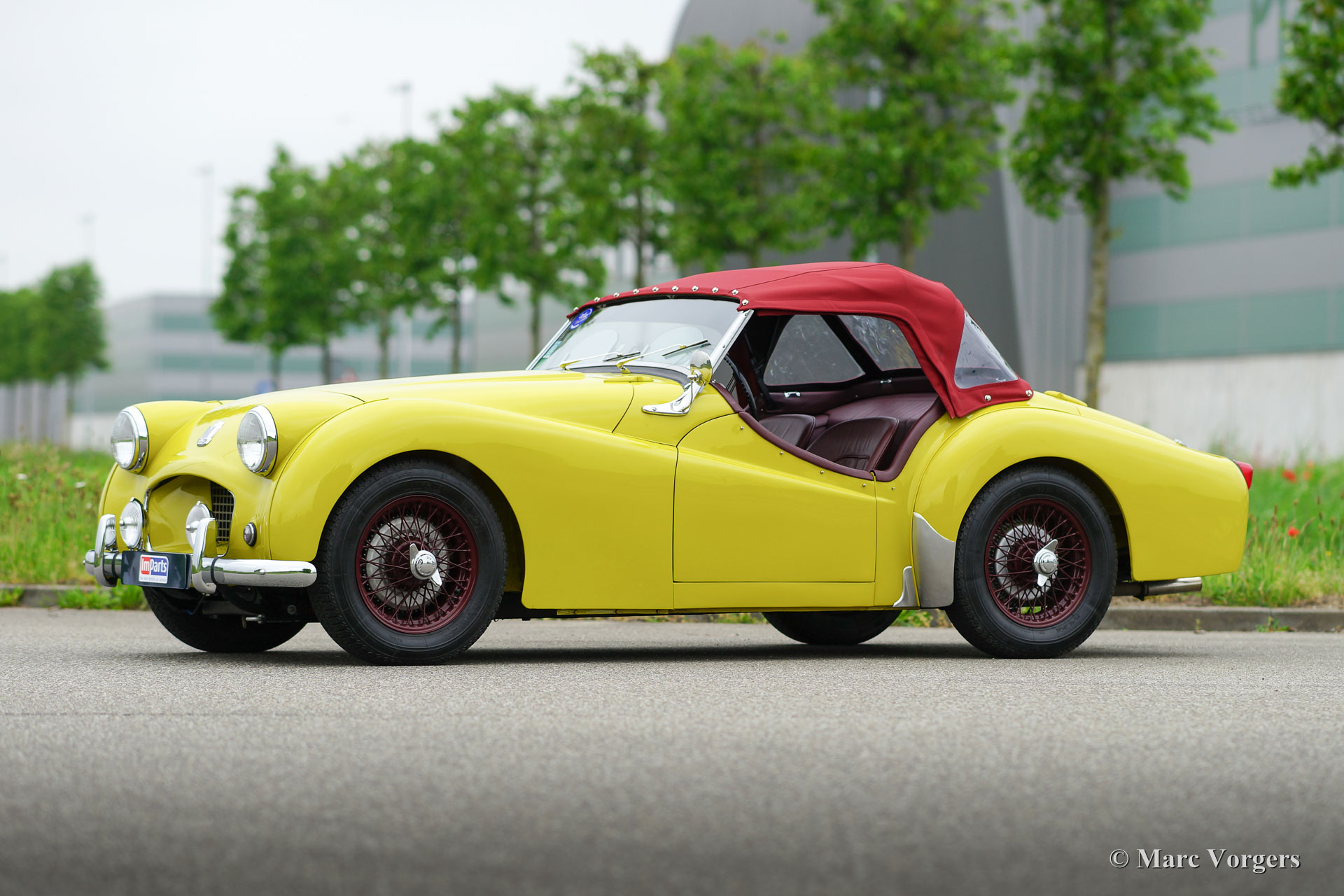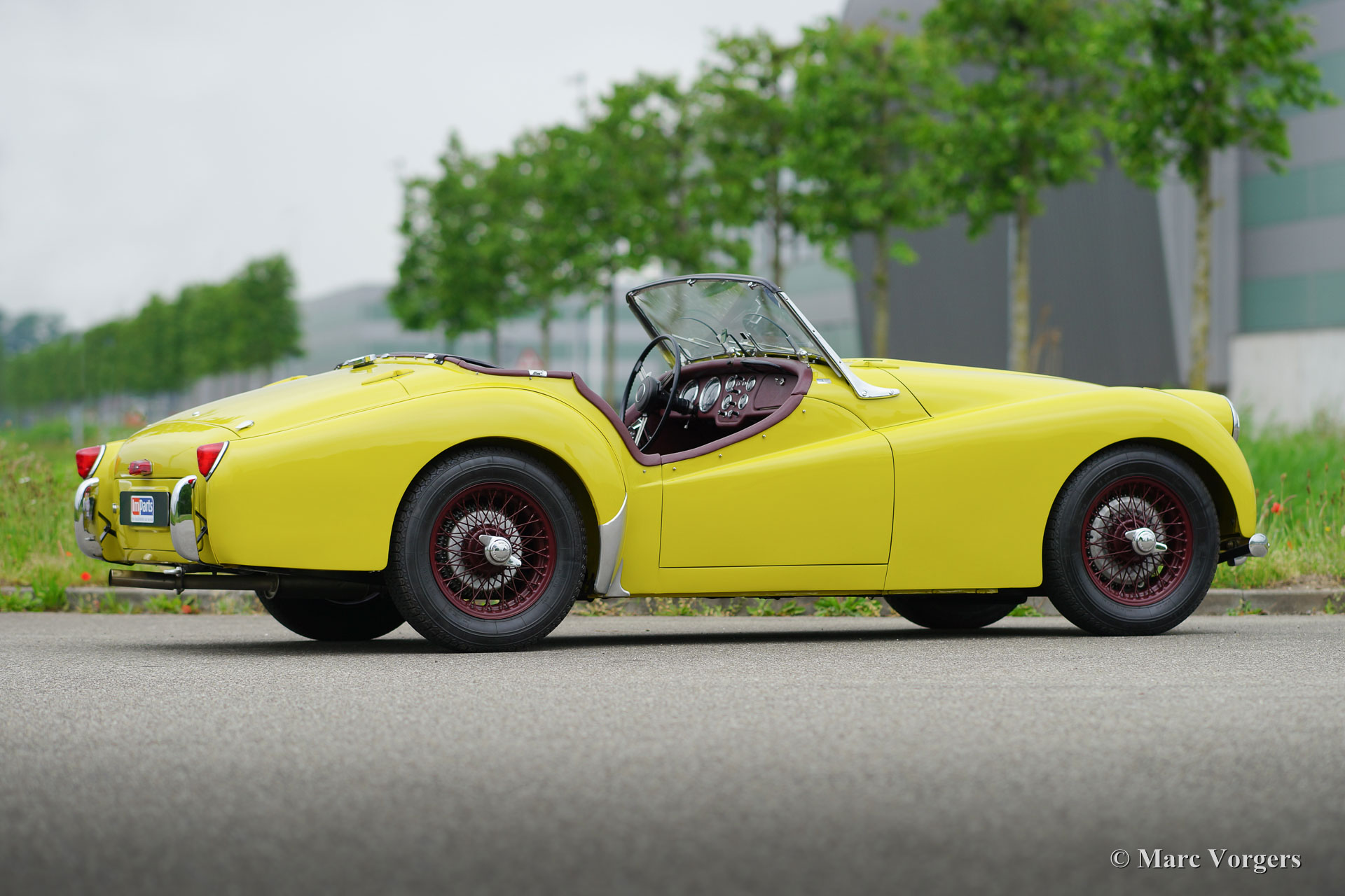 Triumph TR 2, jaar 1954. Eerste registratie in Canada 1955. Chassis number: TS651XXX. Kleur ‘Olive yellow’ met een ‘Blackberry’ leren interieur en bijpassend tapijt. Rode mohair Soft-top, zijramen en tonneaucover. Deze prachtige Triumph TR 2 ‘short door’ werd in 2004 vanuit Canada in Nederland geïmporteerd. Aansluitend werd de auto perfect gerestaureerd en gereviseerd waarbij de motor geschikt werd gemaakt voor het gebruik van loodvrije benzine. Een uitgebreide fotoreportage van de restauratie is aanwezig. Deze Triumph TR 2 verkeert in sublieme topstaat; concours. In de afgelopen jaren heeft de auto diverse (klasse) overwinningen gehaald op concours d’élégances. Deze prachtige TR 2 rijdt perfect! De auto is uitgerust met overdrive, Alfin trommelremmen rondom, en spaakwielen gespoten in de kleur ‘Blackberry’. Een zeer bijzondere Triumph TR 2 in perfecte staat.
