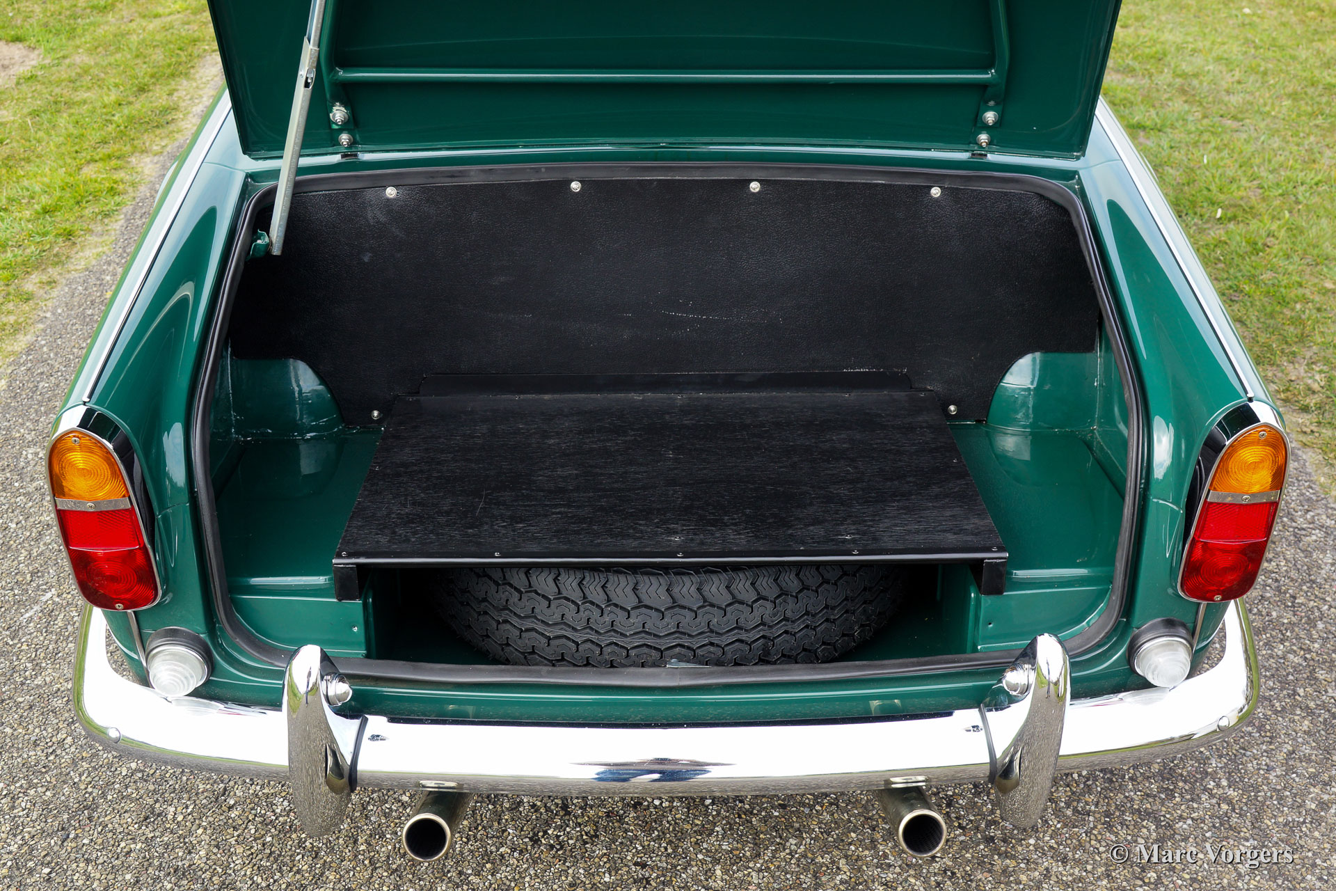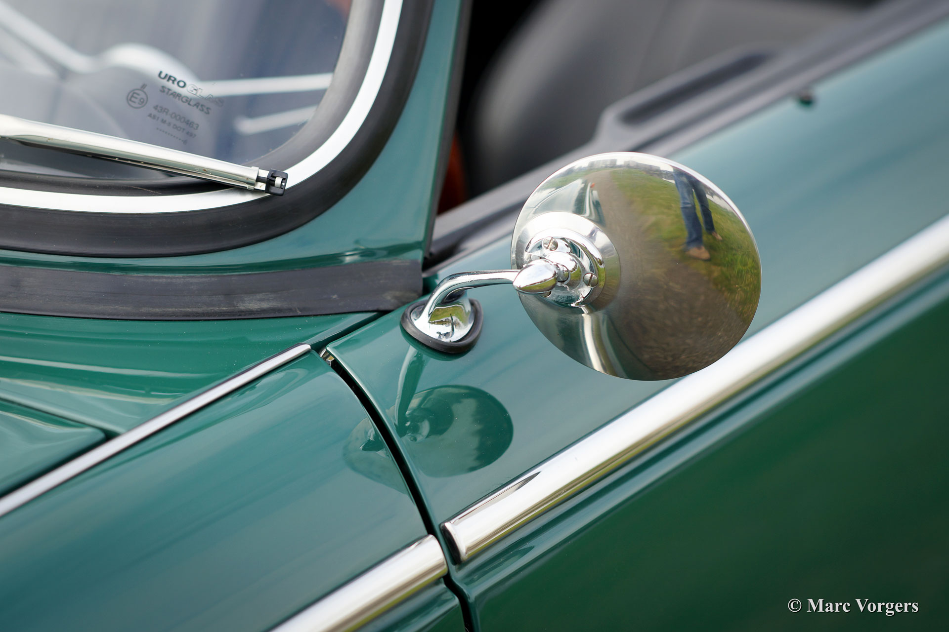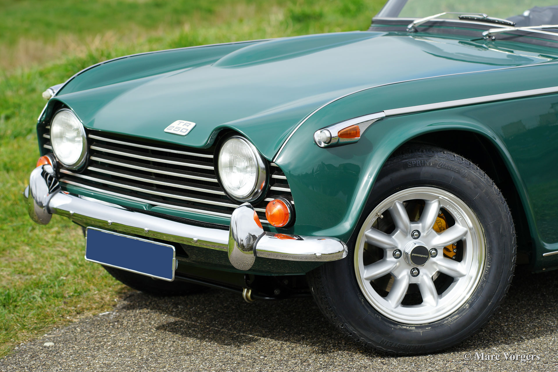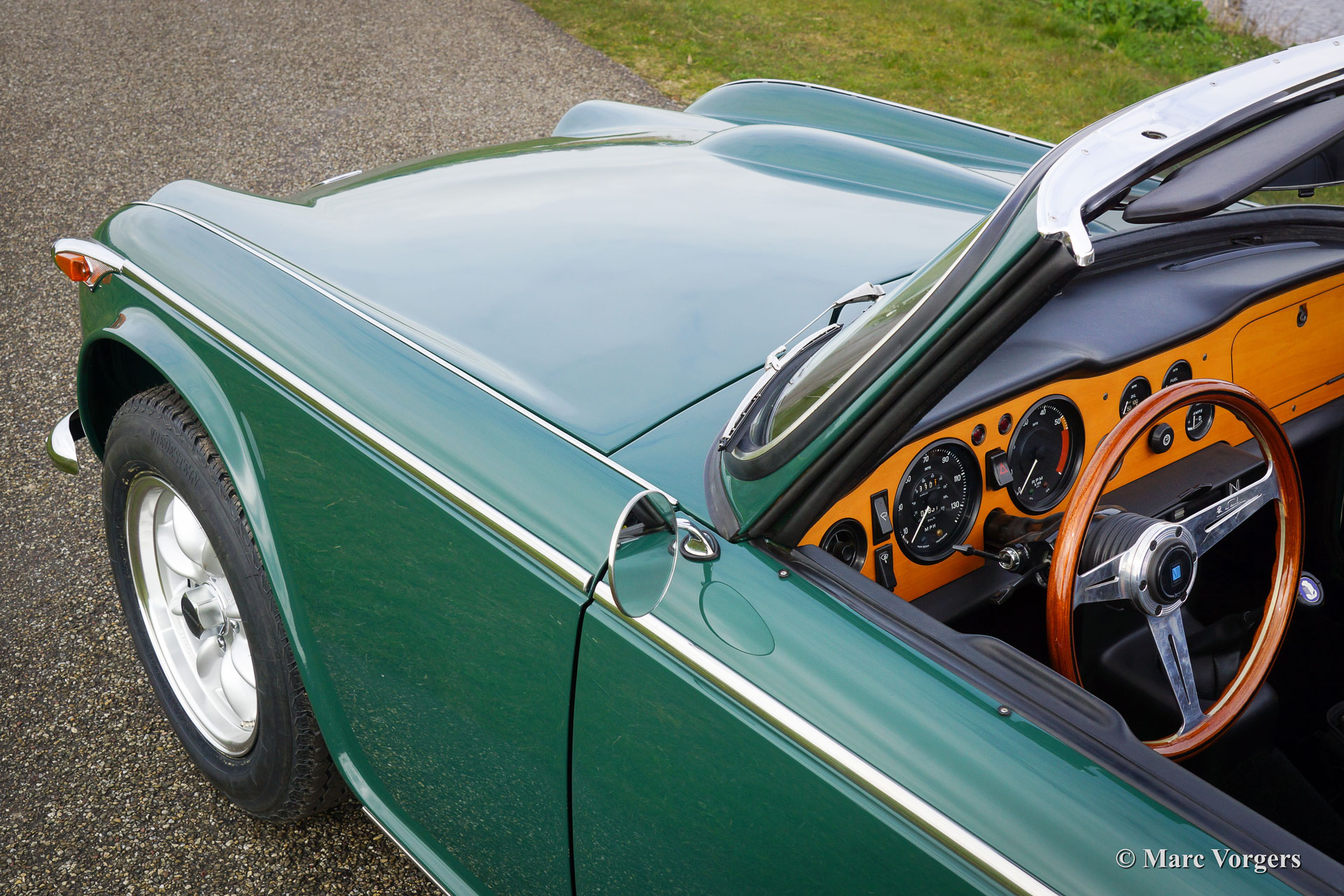 Triumph TR 250, bouwjaar 1967. Chassisnummer CD10XXL, motornummer CC11XXE. Kleur Triumph Racing Green met een zwart lederen interieur, zwart tapijt en een zwarte mohair soft top. Deze geweldige Triumph TR 250 is naar de hoogste kwaliteitsnormen gerestaureerd door Piet Mozes Restauraties. Kosten noch moeite werden gespaard om de perfecte TR 250 te bouwen. Deze prachtige TR 250 verkeert in beter dan NIEUWSTAAT! De auto is gerestaureerd vanaf de blanke plaat en de carrosserie is superstrak afgewerkt met een modern meer-laags laksysteem. Het chassis en de wielophangingsdelen zijn gepoedercoat en alle blank metalen delen zijn gegalvaniseerd en / of verchroomd. De carrosserie en het chassis van binnen perfect beschermd tegen corrosie door speciale ‘waxoil’. Tijdens de restauratie zijn het chassis en de carrosserie op cruciale plaatsen verstevigd. Mechanisch en technisch is alles gereviseerd en of vernieuwd. Sommige technische details werden verbeterd om maximale betrouwbaarheid en duurzaamheid te garanderen.