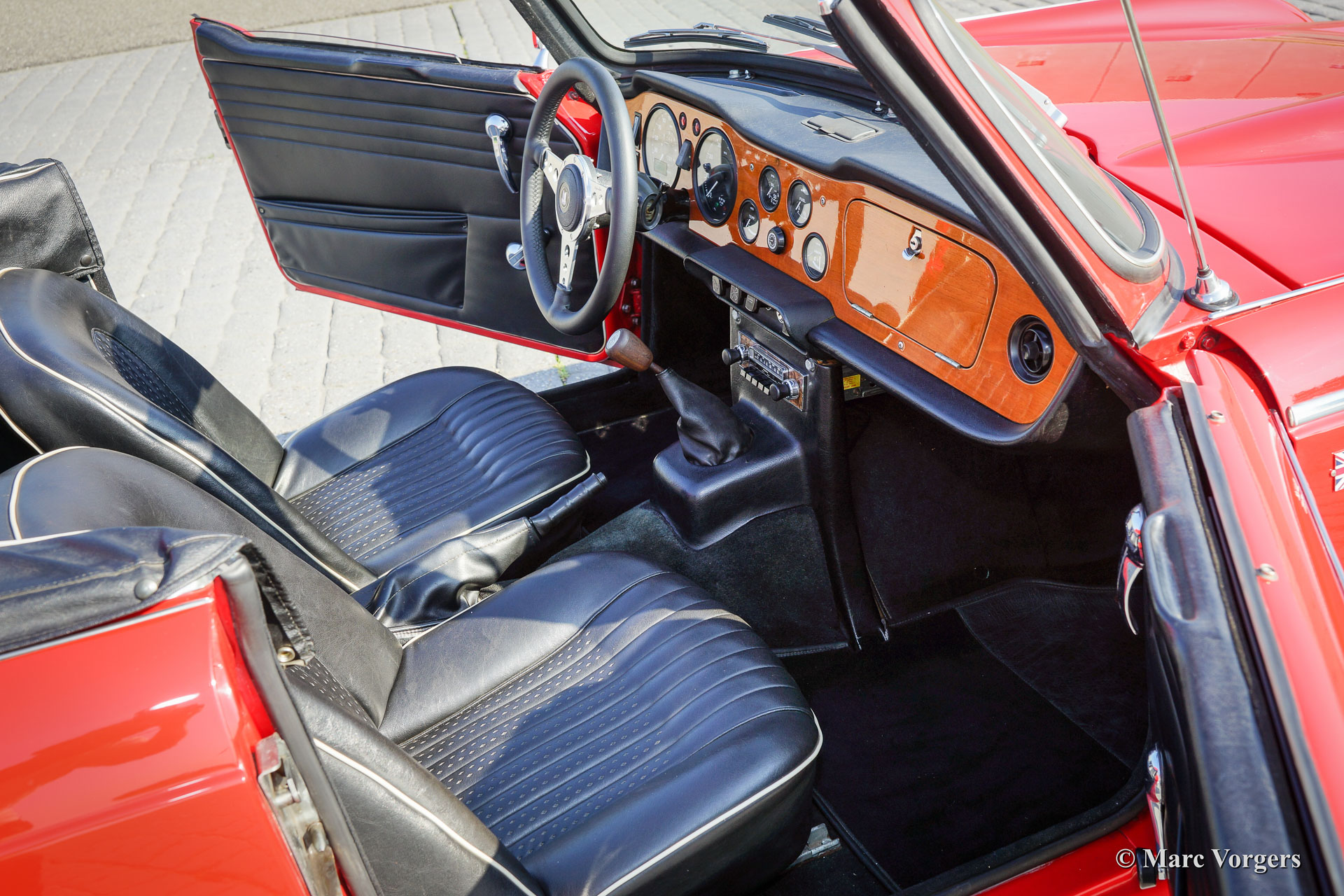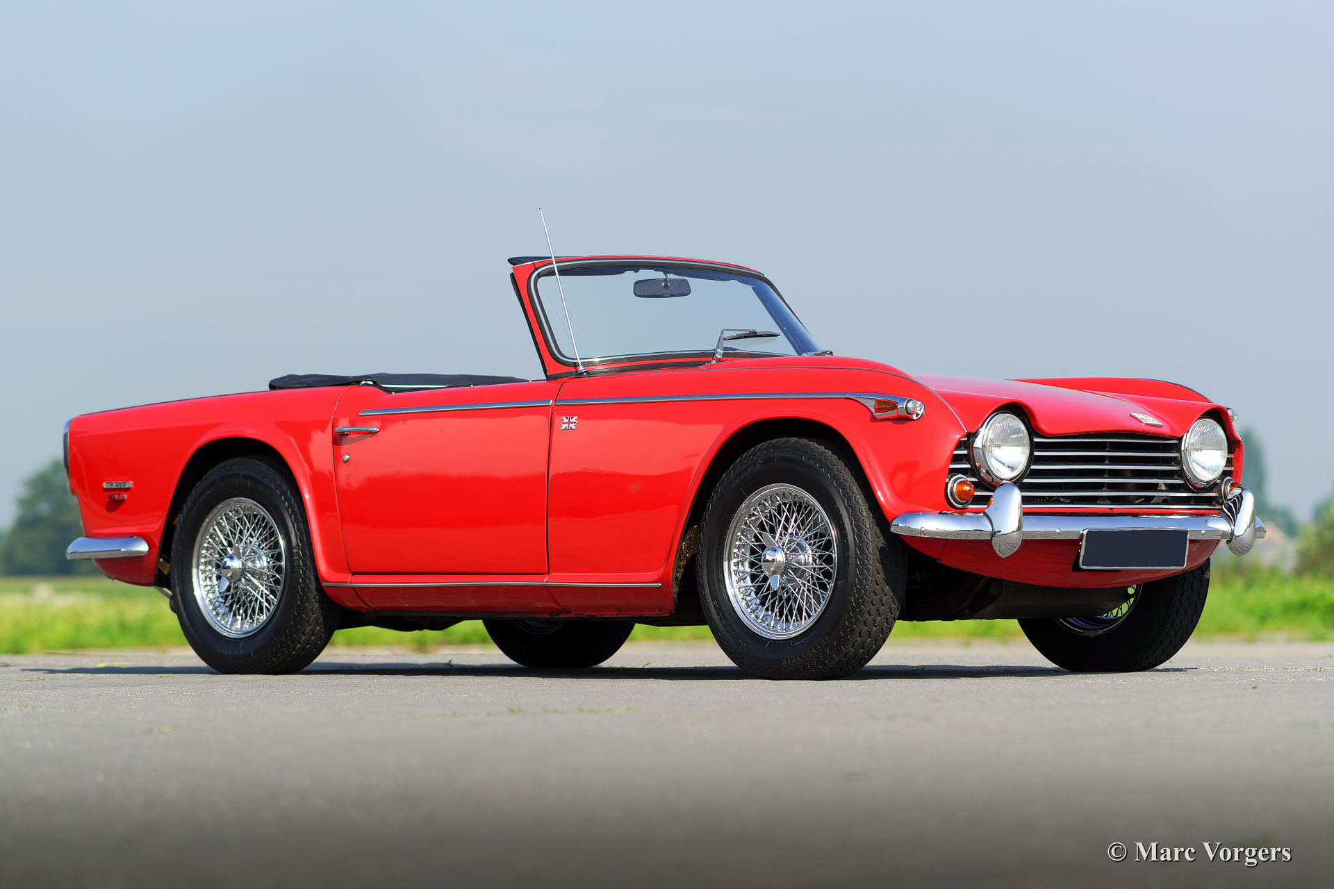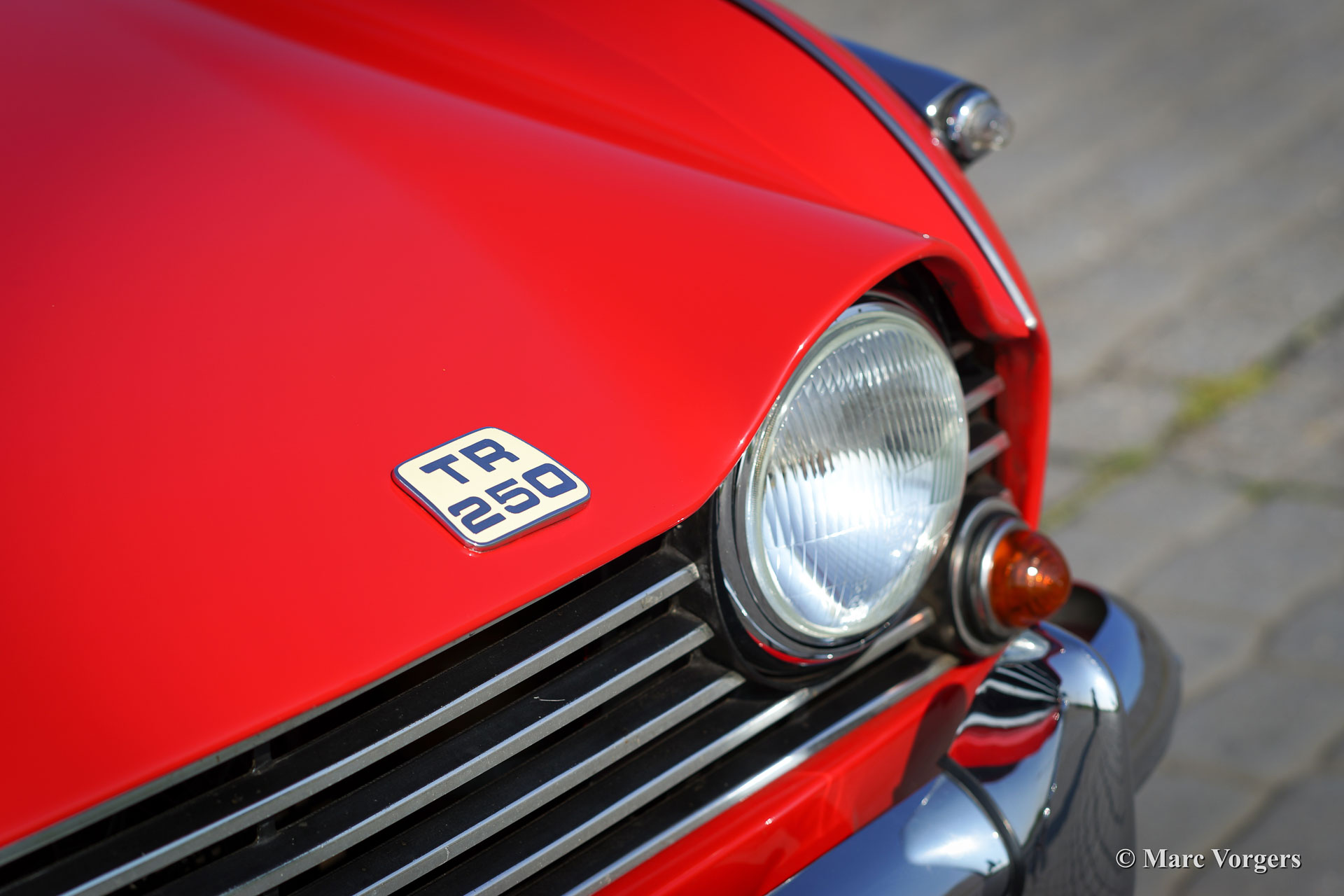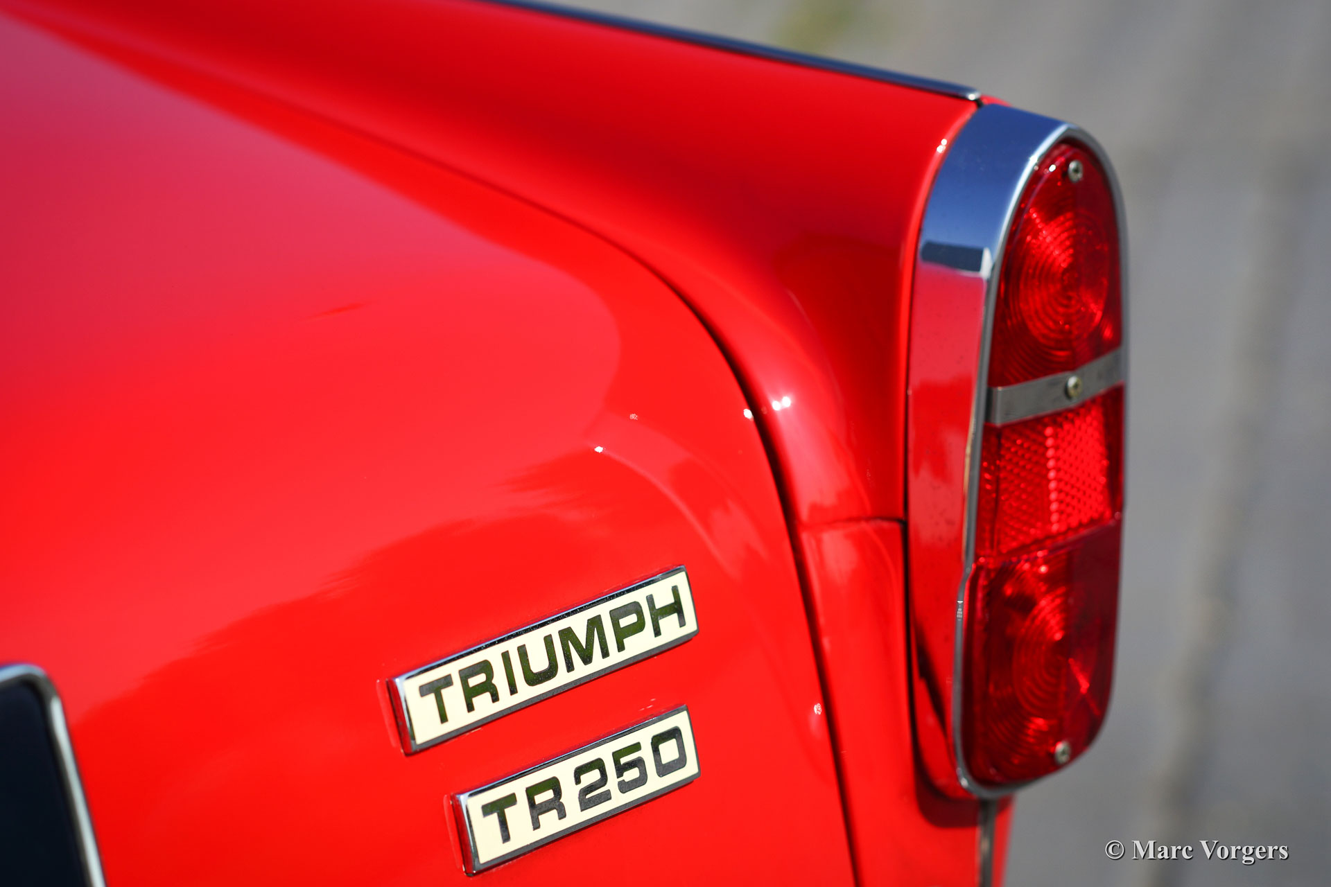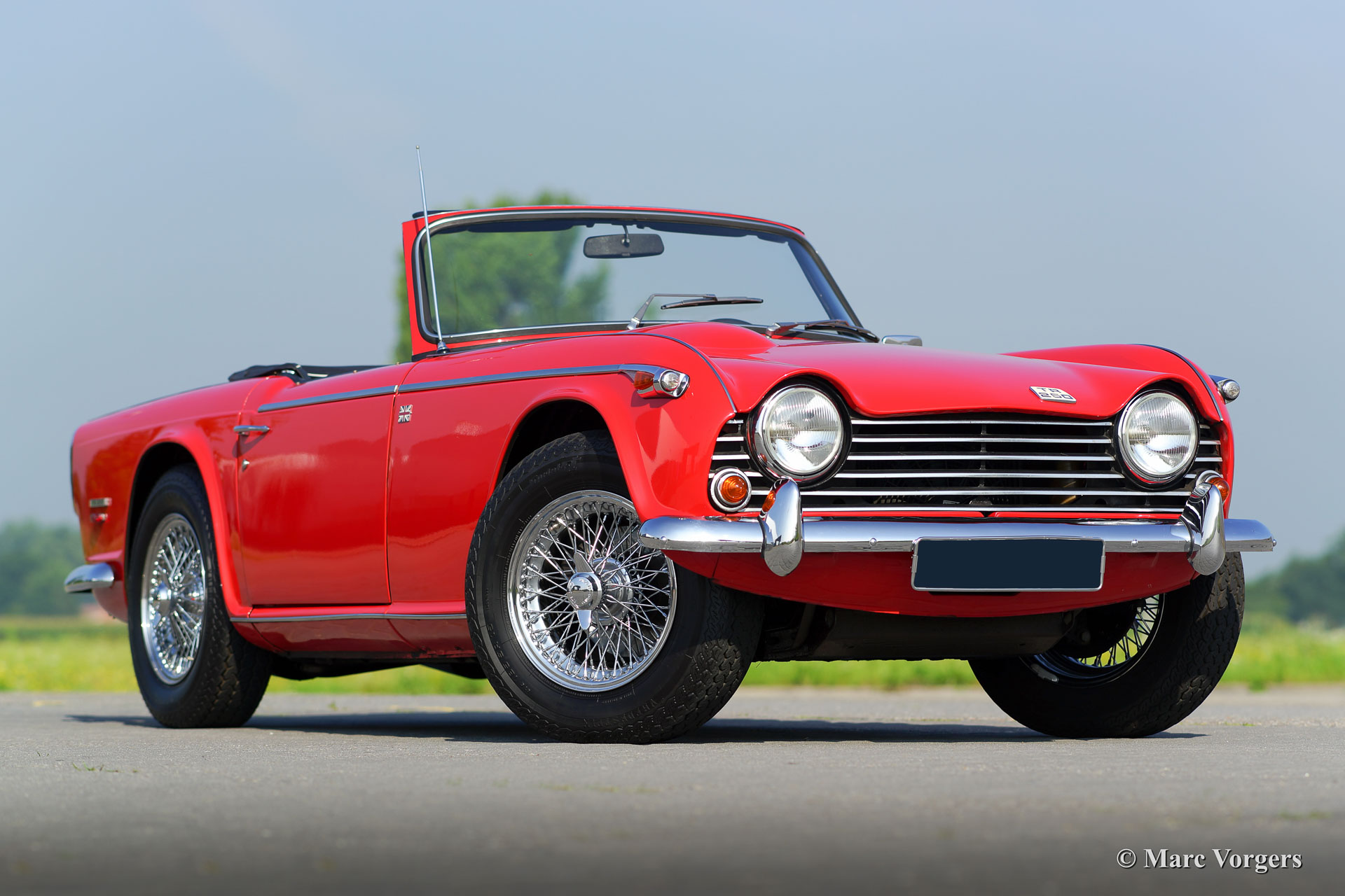 Triumph TR 250, bouwjaar 1968. Kleur rood met een zwart lederen interieur afgewerkt met witte biezen. Zwarte mohair soft-top en zwart vinyl hood cover. Deze prachtige Triumph TR 250 verkeert in sublieme staat, rijdt geweldig, en de auto toont prachtige originele details. De auto is voortreffelijk onderhouden. De soft top is nieuw en nog geen jaar geleden zijn er nieuwe chroom spaakwielen en nieuwe banden gemonteerd. De motor is geschikt gemaakt voor loodvrije benzine. De auto is voorzien van twee SU carburateurs een RVS sportuitlaat en een Motolita sportstuur. Bijzonder is de aanwezigheid van het originele boekje met dealer afleverings-stempel. De Triumph TR 250 is een van de meest schaarse TR modellen, de auto werd slechts twee jaar gebouwd (1967 en 1968.)