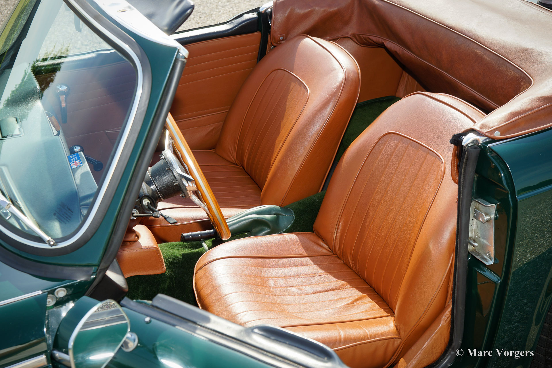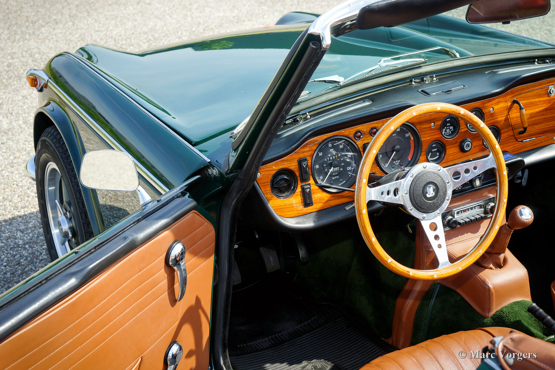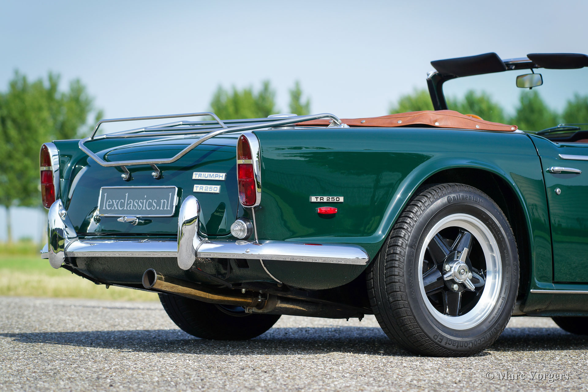 Triumph TR 250, jaar 1968. Kleur donkergroen (British Racing Green) met een cognac-bruin interieur en groen tapijt. Deze geweldig rijdende TR 250 werd in de periode 1998 – 2003 uitvoerig en ‘body-off’ gerestaureerd. De automobiel verkeert in excellente staat. Een uitgebreide fotoreportage van de restauratie is aanwezig evenals diverse rekeningen. De auto is uitgerust met ‘Revolution’ lichtmetalen wielen, een Moto-Lita sportstuur met houten rand, een chroom kofferrek en K&N sportluchtfilters. Dit is een geweldige zescilinder roadster met een verslavend motorgeluid!