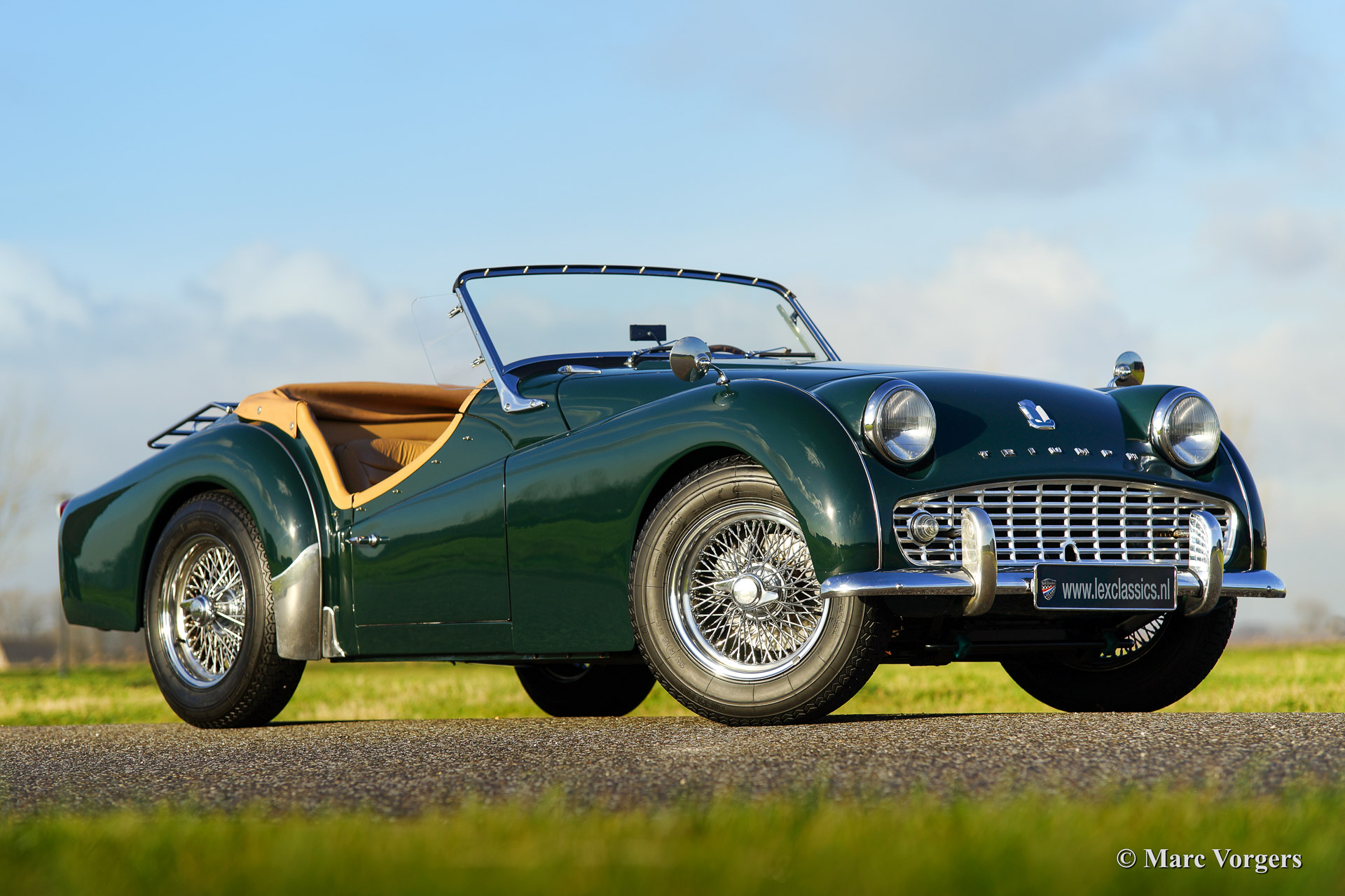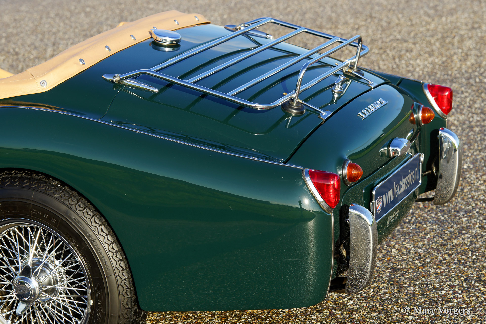 Triumph TR 3a, bouwjaar 1958. Kleur 'British Racing Green' met een beige lederen interieur. Beige vinyl soft top, beige side screens, hood cover en tonneau cover. Deze prachtige Triumph TR 3a werd in 2001 geïmporteerd vanuit de USA. Deze TR 3a is uitgerust met brede chroom spaakwielen, chroom 'knock offs', sportstuur met houten rand en een chroom kofferrek