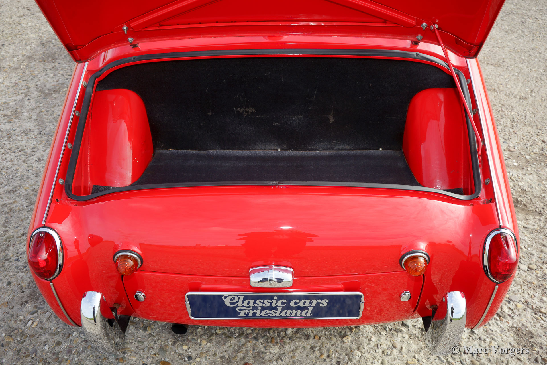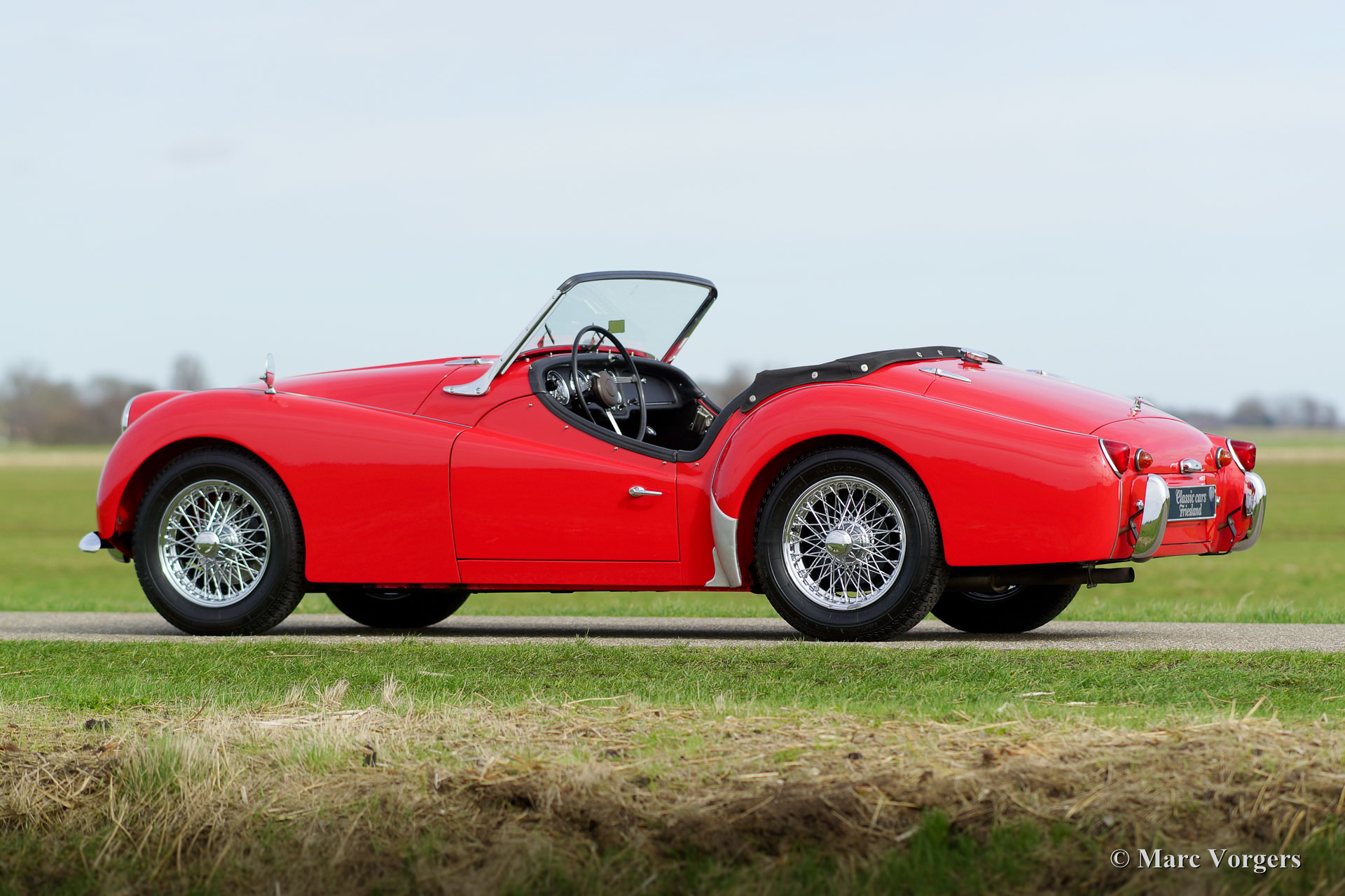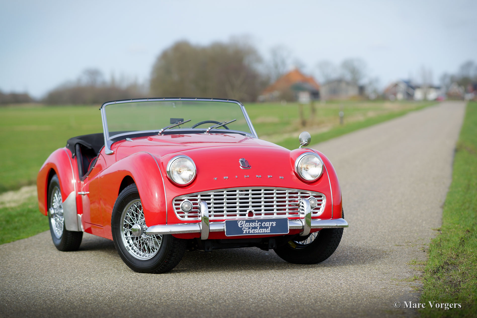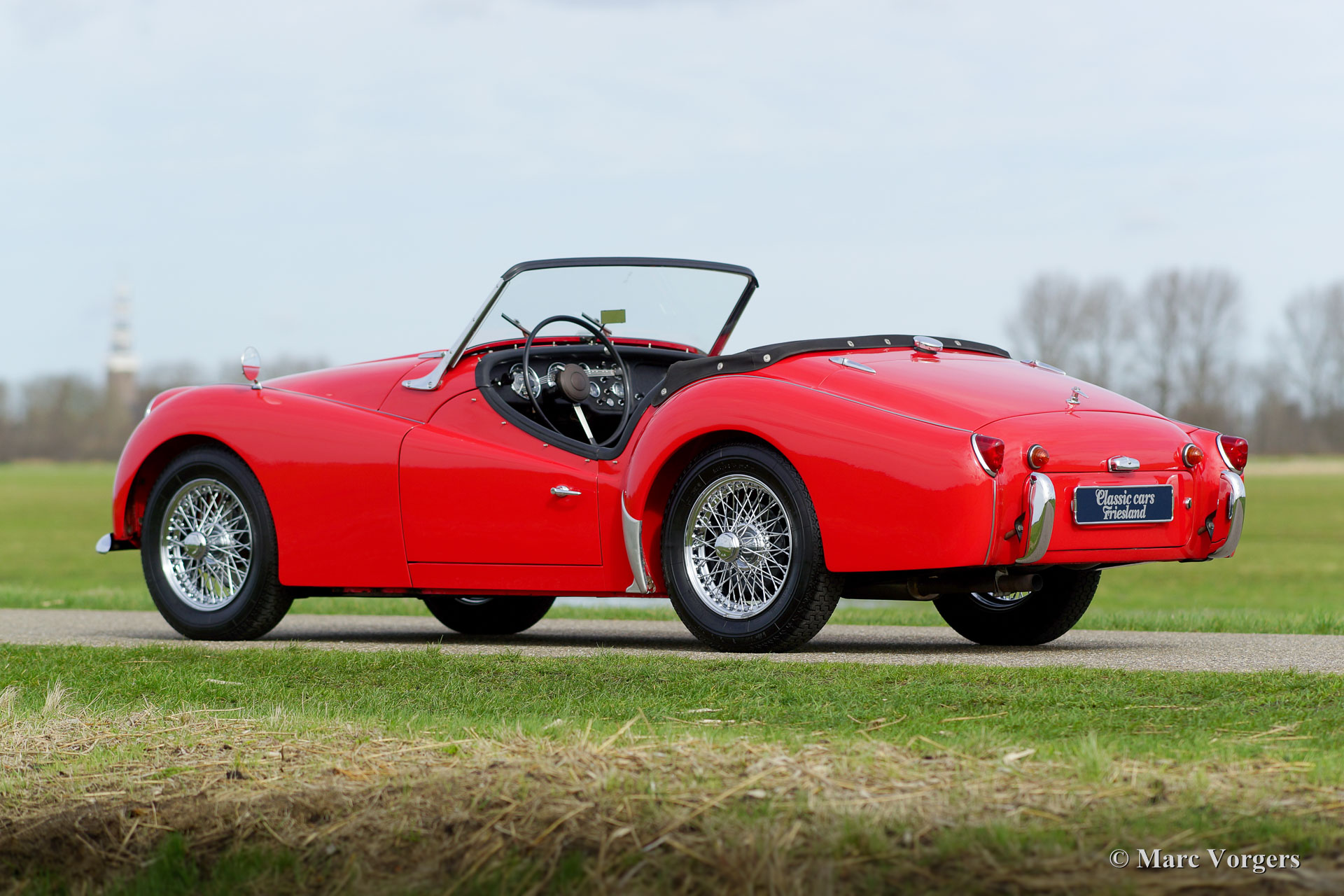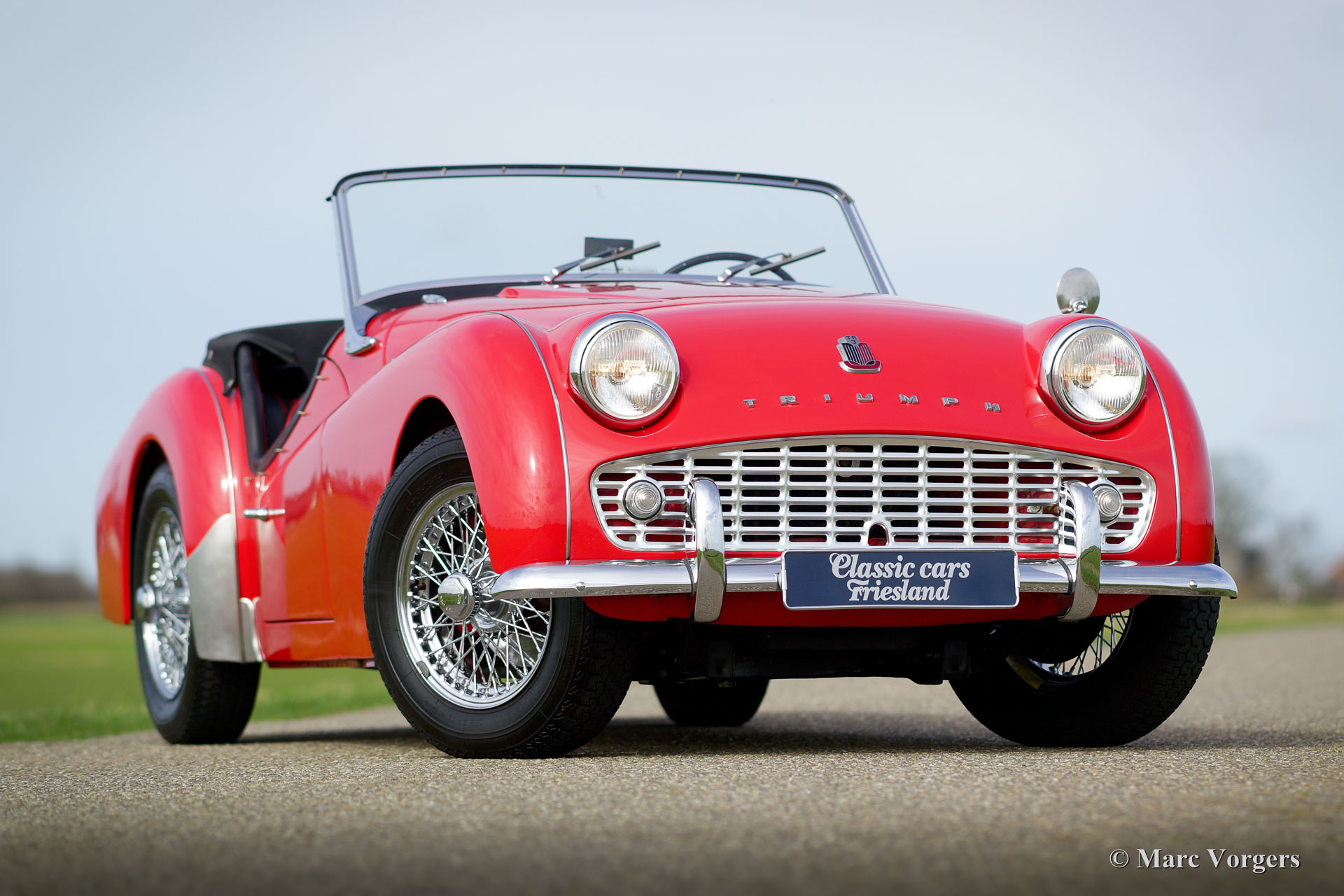 Triumph TR 3a, jaar 1958. Kleur rood met een zwartleren interieur afgewerkt met rode biezen. Zwart tapijt, zwarte mohair ‘soft-top’ en ‘hood cover’. Deze geweldige Triumph TR 3a werd in de jaren 1990 uit de USA geïmporteerd door Classic Cars Friesland. In het jaar 2000 werd de auto volledig en ‘body off’ gerestaureerd en gereviseerd door een Nederlandse toprestaurateur en Triumph TR-specialist. Facturen met een totaal van boven de 100.000 gulden (ongeveer 45.000 euro) zijn aanwezig. Tevens is er een uitgebreide fotoreportage van de restauratie aanwezig. Deze bijzonder fraaie en uitstekend rijdende Triumph TR 3a verkeert in sublieme topstaat! De auto is uitgerust met chroom spaakwielen, overdrive, rvs uitlaat en Michelin banden. De auto is compleet met een Heritage certificaat en originele folders. Een beter gerestaureerde Triumph TR 3a zult u niet snel vinden!