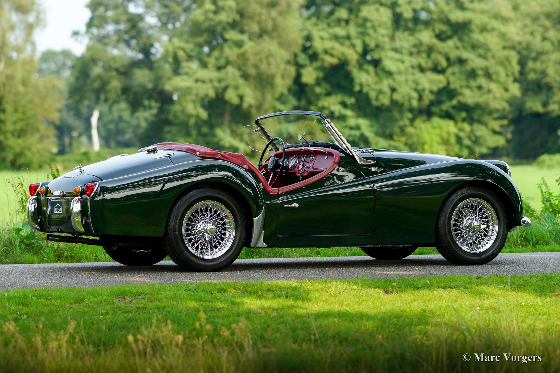Triumph TR 3A, jaar 1958. Kleur donker British racing green gecombineerd met een rood lederen interieur, rood tapijt en een rood lederen kapafdekking. Rode mohair softtop en rode mohair zijruitframes. Deze prachtige Triumph TR 3A werd nieuw verkocht in de Verenigde Staten. In 1996 is de auto in Nederland geïmporteerd. Eind jaren negentig werd de auto uitvoerig gerestaureerd. Alles is gerestaureerd, gereviseerd en / of vernieuwd. De motor, versnellingsbak, ophanging, assen en dashboardmeters zijn gereviseerd. Er is een nieuwe kabelboom gemonteerd, chroomwerk opnieuw verchroomd etcetera. Een fotoreportage van de restauratie is aanwezig. Nu, 20 jaar later, verkeert de auto nog altijd in excellente conditie met slechts lichte gebruikssporen. Deze fraaie Triumph TR 3A toont alle originele details en de auto rijdt perfect! De auto is voorzien van chromen spaakwielen met Vredestein Sprint Classic 165/15 banden, een roestvrijstalen uitlaatsysteem en een afneembaar chromen bagagerek dat op de kofferklep kan worden gemonteerd. Een prachtig exemplaar!