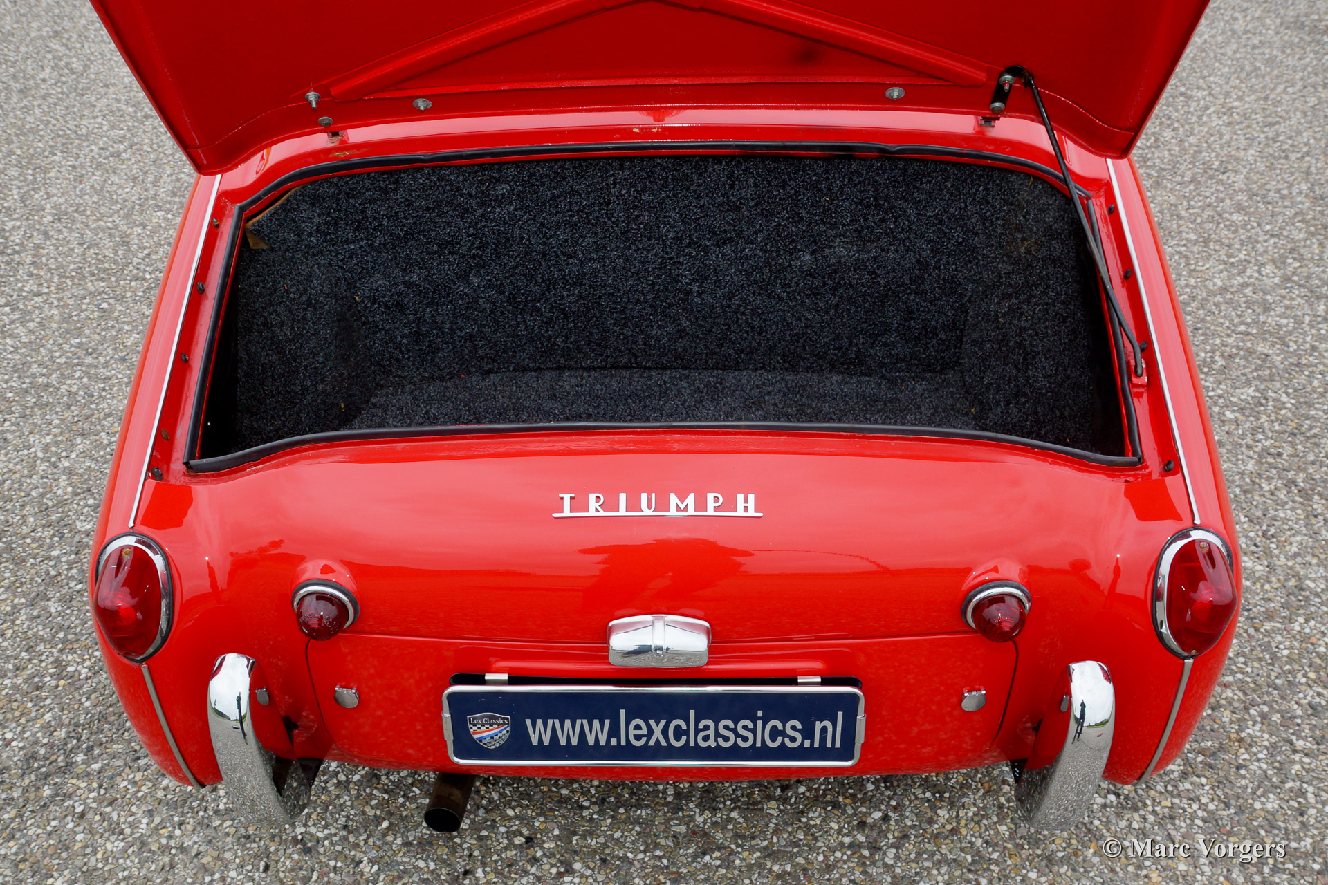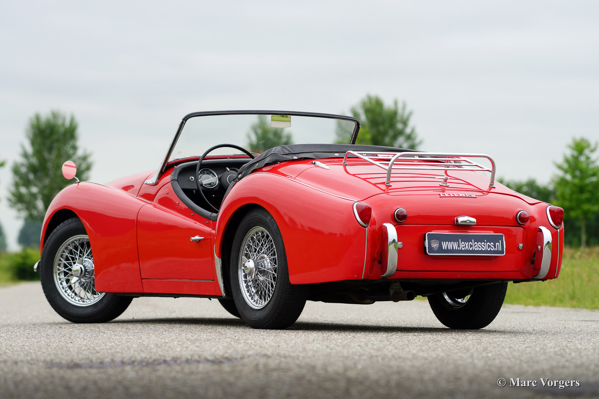 Triumph TR 3a, bouwjaar 1959. Motornummer: TS233XX Chassisnummer: TS3359XX. Kleur rood met een zwart interieur afgewerkt met rode biezen. Deze fraaie Triumph werd in het jaar 2000 in Nederland geïmporteerd en aansluitend uitvoerig gerestaureerd. De automobiel verkeert in zeer goede staat en de auto rijdt uitstekend. De auto is voorzien van de volgende opties: chroom spaakwielen met chroom vleugelmoeren, elektrische Kenlow koelventilator, Koni schokbrekers, RVS uitlaat, vinyl tonneaucover, vinyl hoodcover, high torque startmotor, massaschakelaar met sleutel, rolgordels en een chromen kofferrek. Recent is deze TR3a technisch geheel nagezien. Daarbij werd het stuurhuis vernieuwd, werden CHROOM spaakwielen gemonteerd en nieuwe banden. Deze Triumph staat op dit moment niet in de showroom van Lex Classics. Om de auto te bekijken vragen wij u een afspraak te maken met de heer Sjors Peters via de onderstaande contactinformatie.